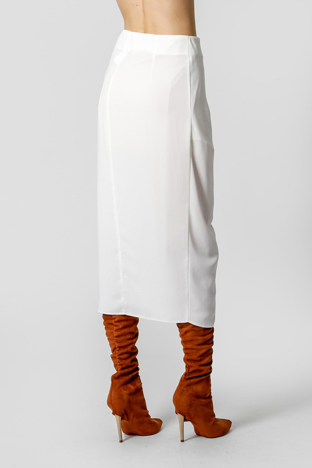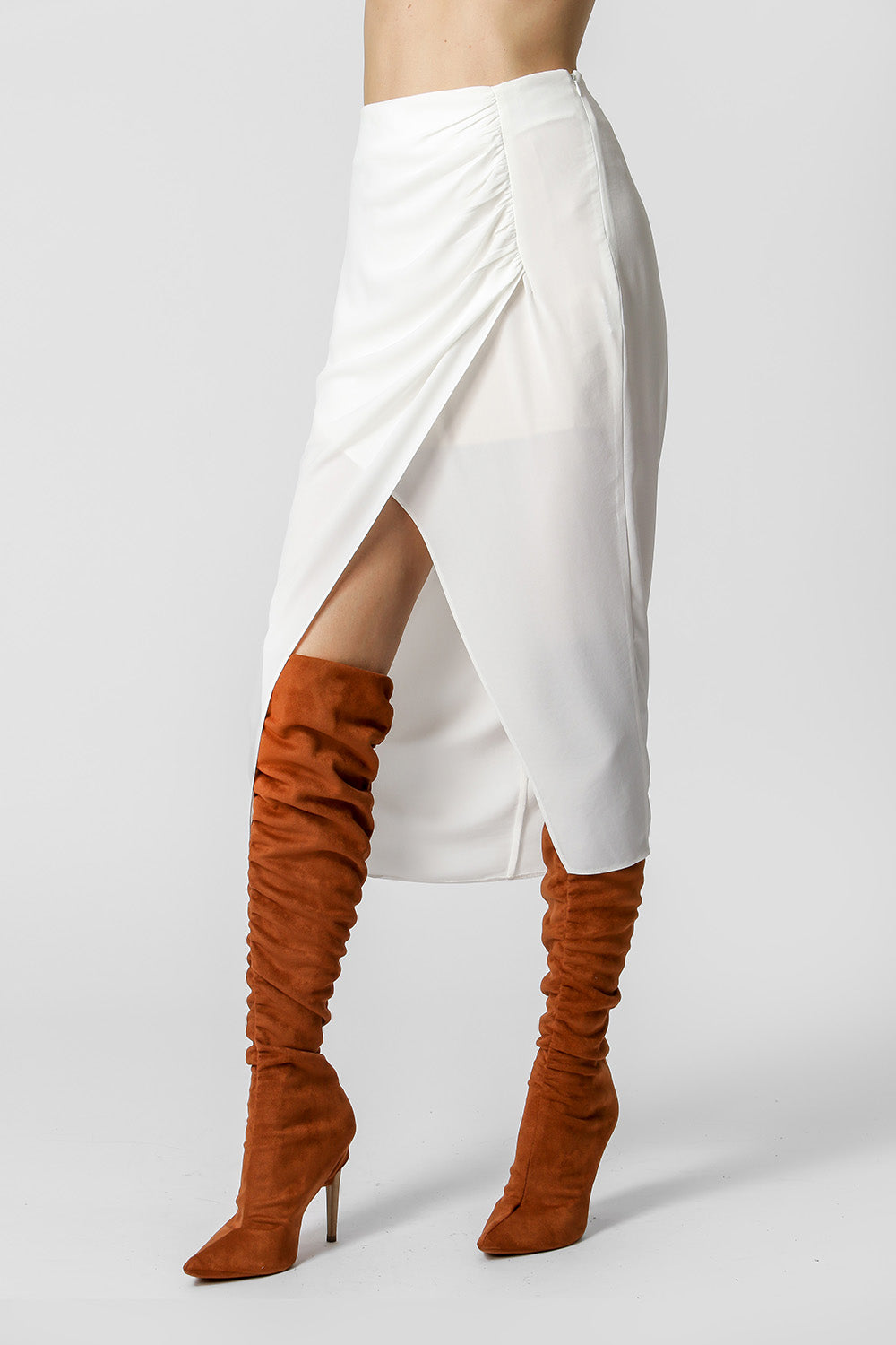 Falda confeccionada en sarga de crepe, con detalle de fruncido fijo y abertura. Un modelaje que viene fuerte esta temporada.