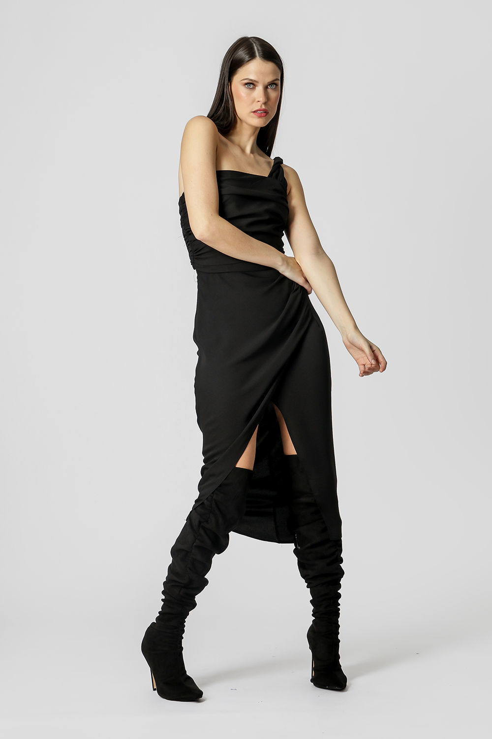 Falda confeccionada en sarga de crepe, con detalle de fruncido fijo y abertura. Un modelaje que viene fuerte esta temporada.