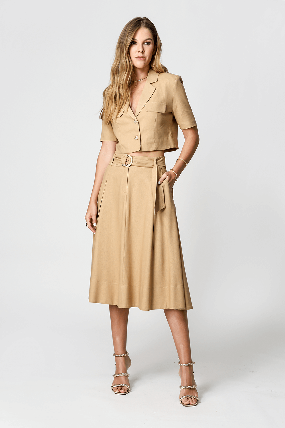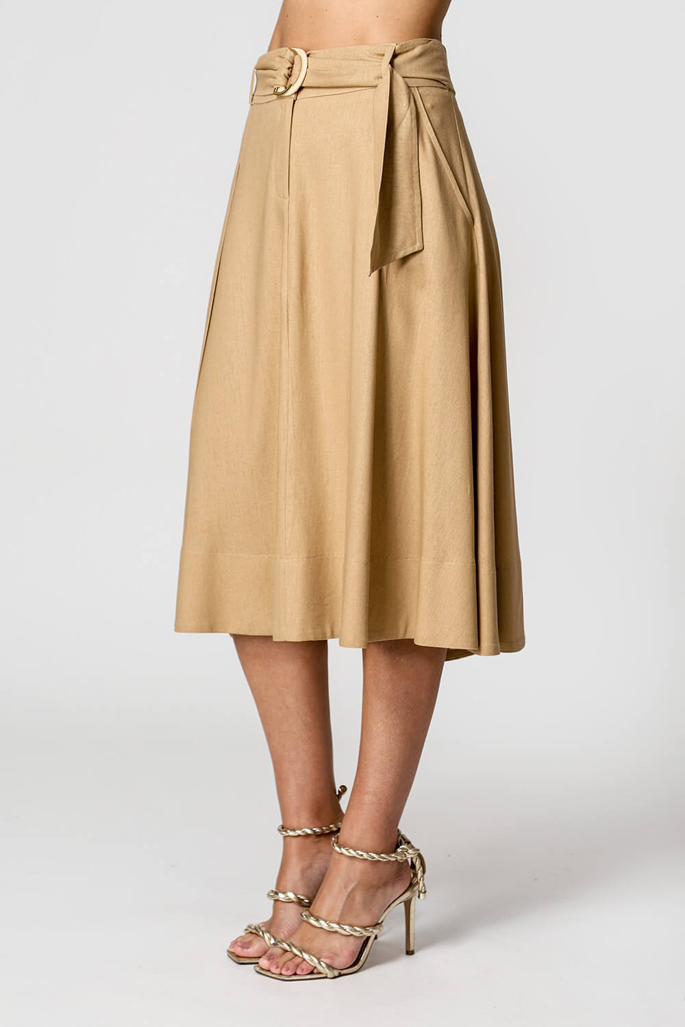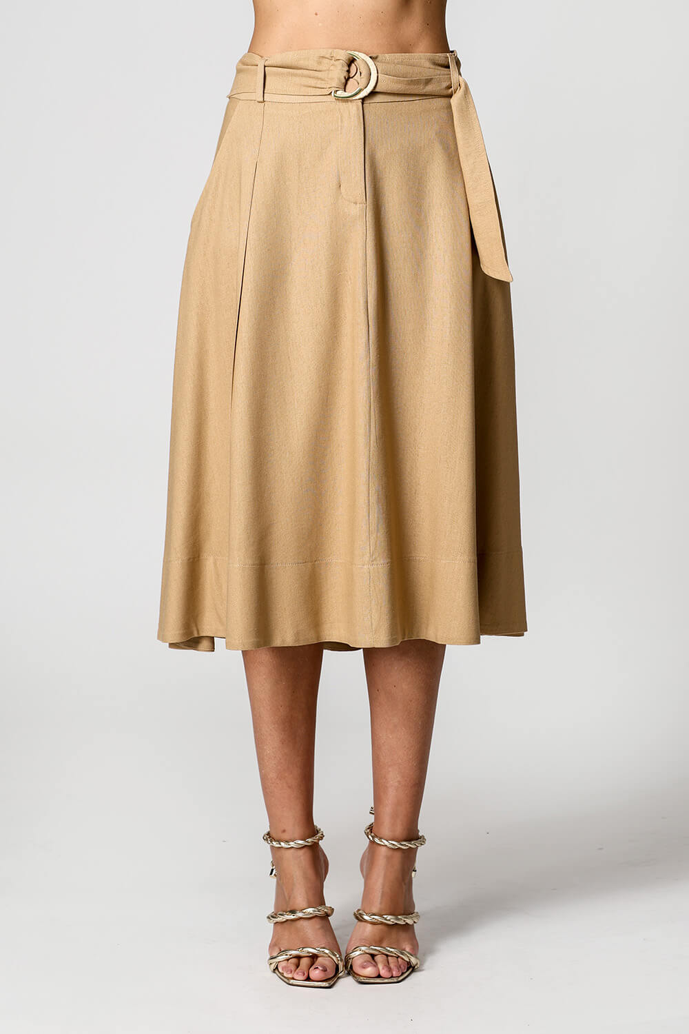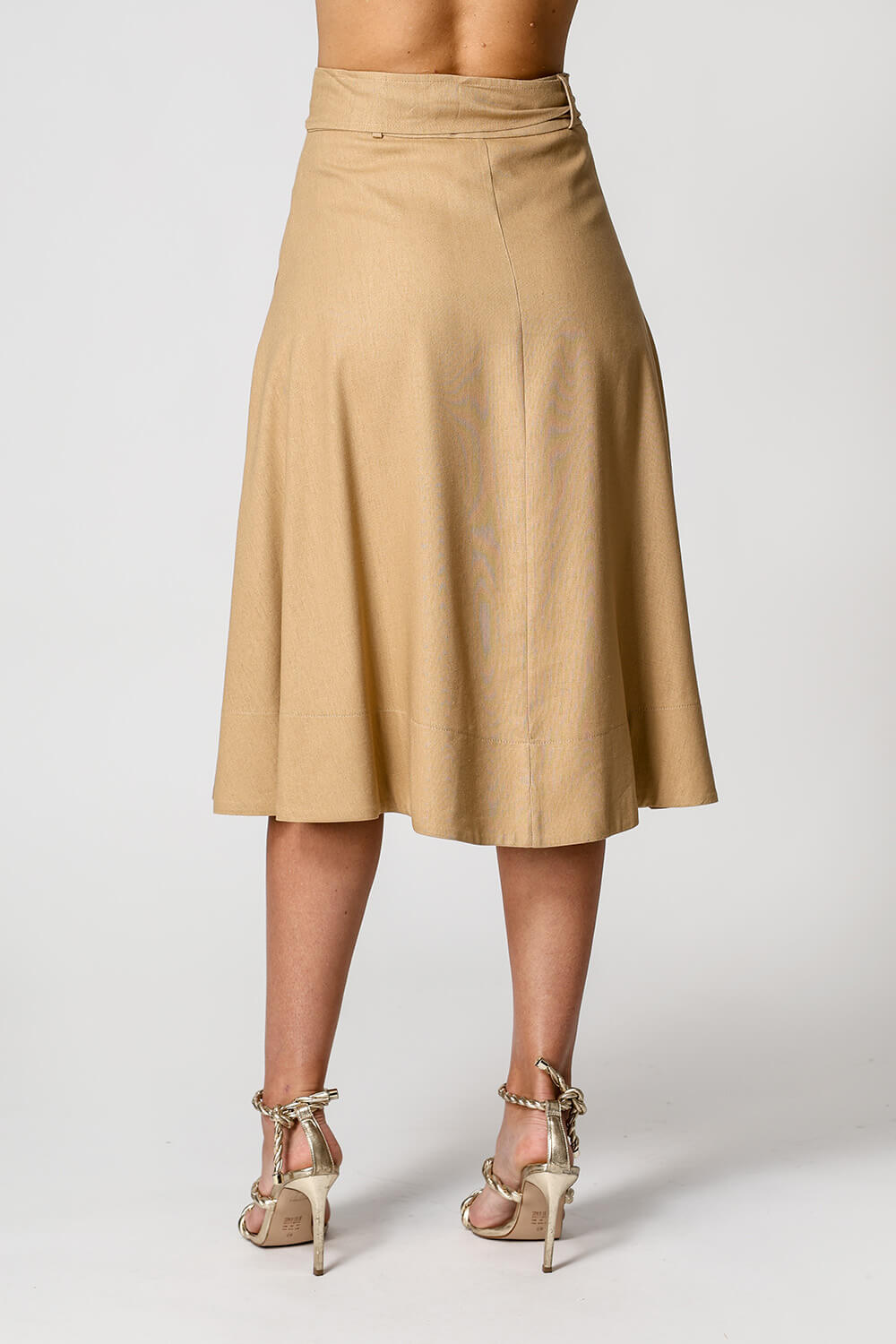 Falda de lino con cinturón de doble hebilla. Pieza elegante y atemporal.