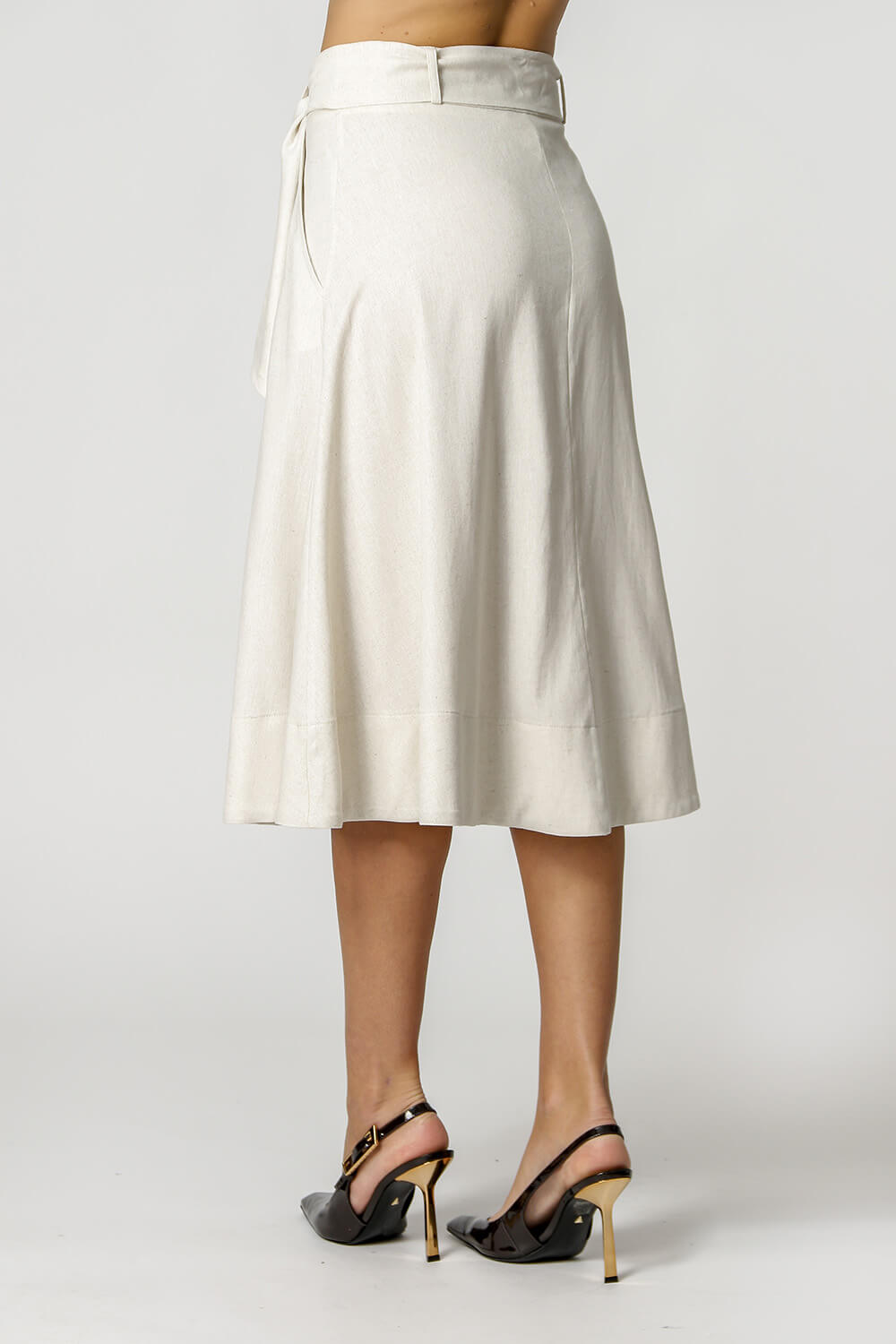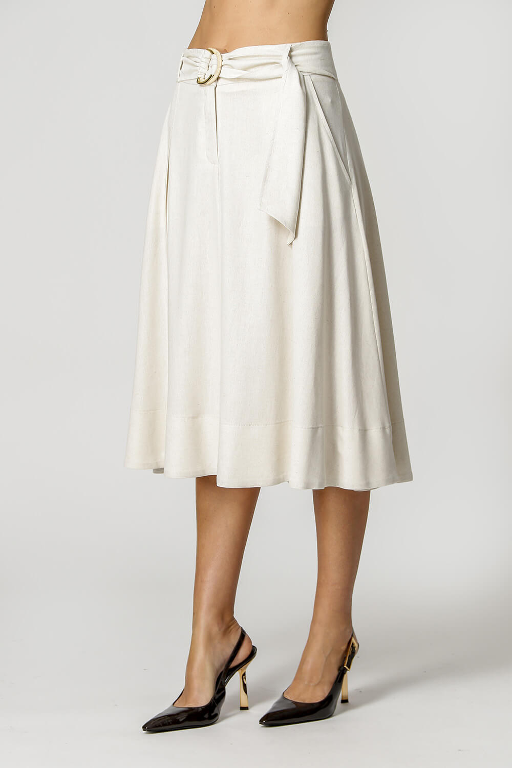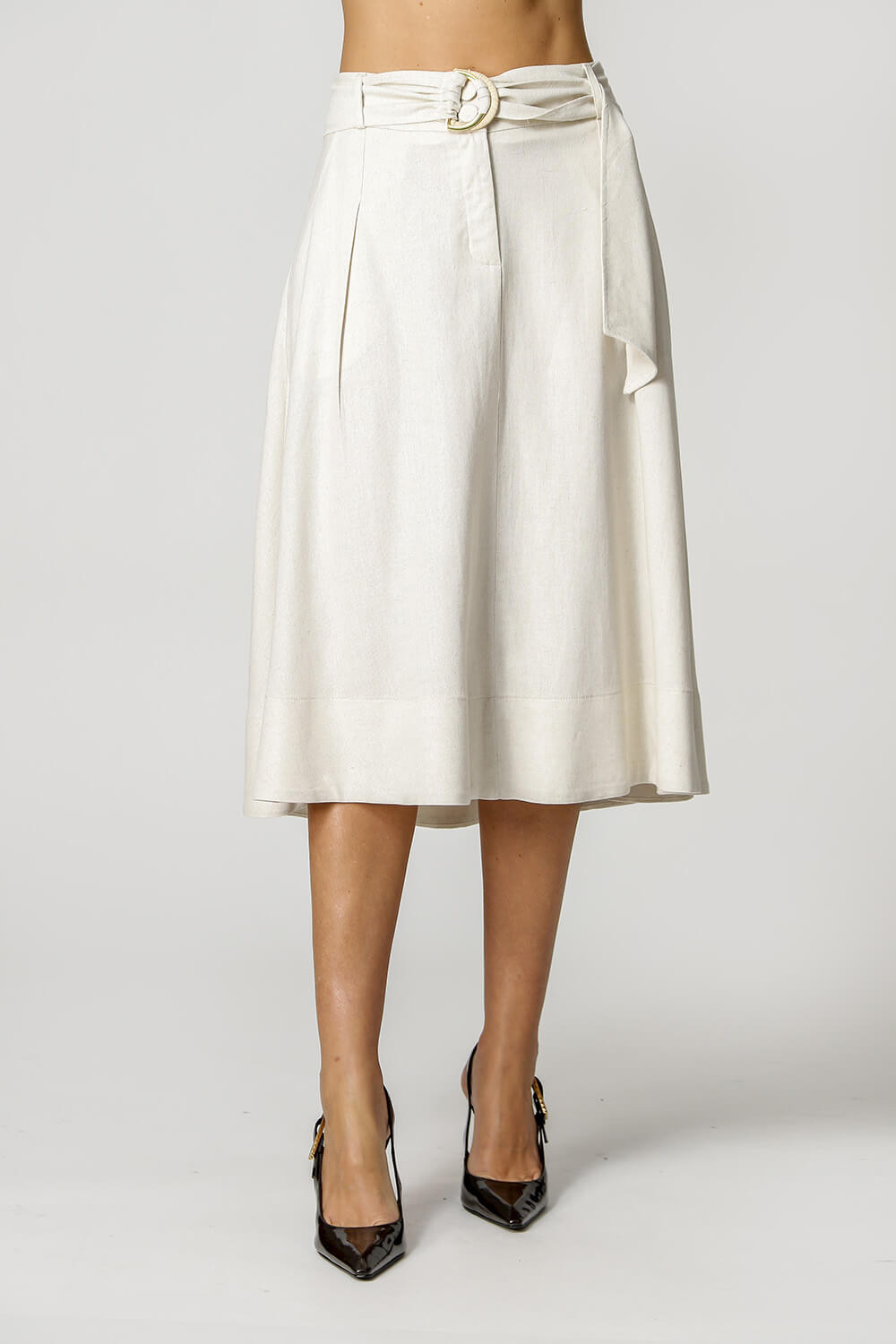 Falda de lino con cinturón de doble hebilla. Pieza elegante y atemporal.