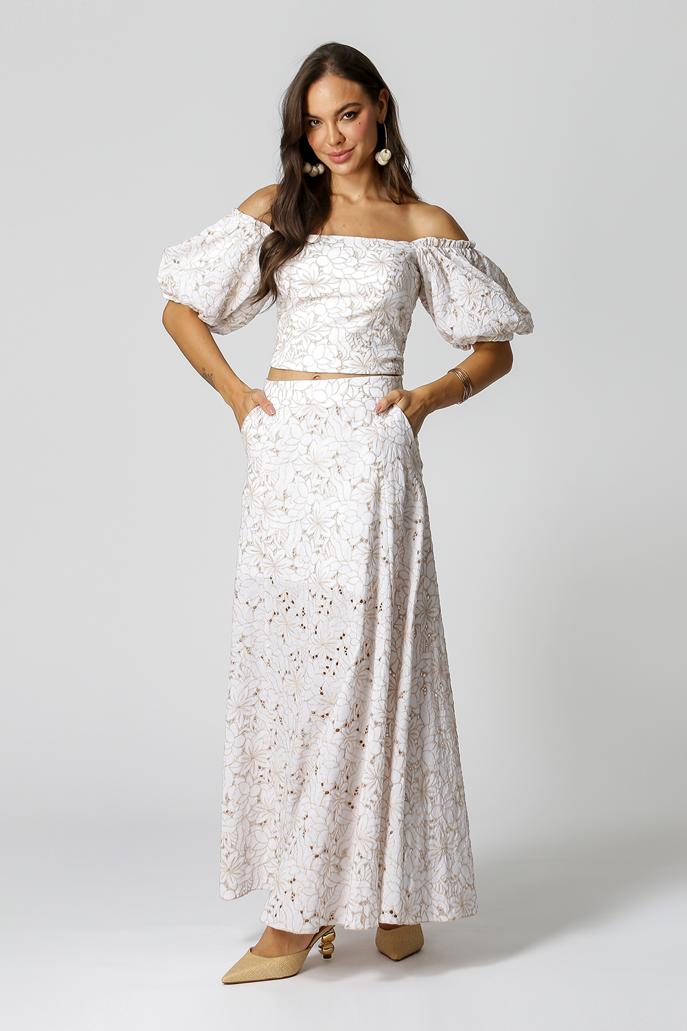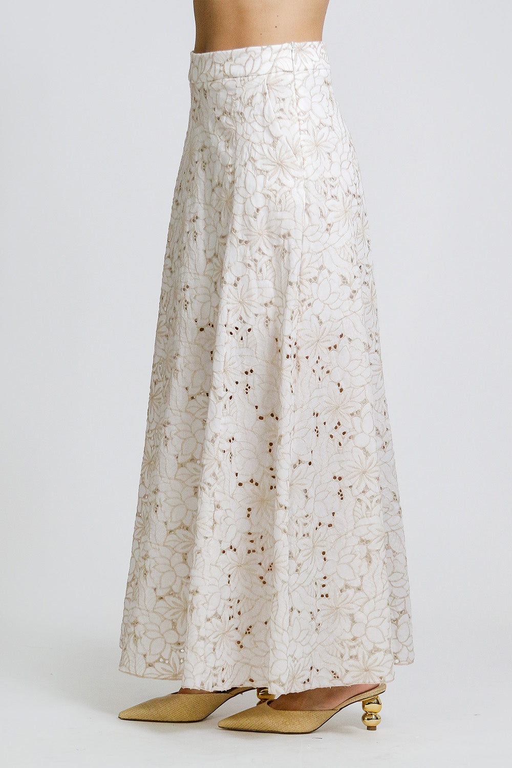 Saia longa de laise bordado com shape em A. Peça essencial para o verão!