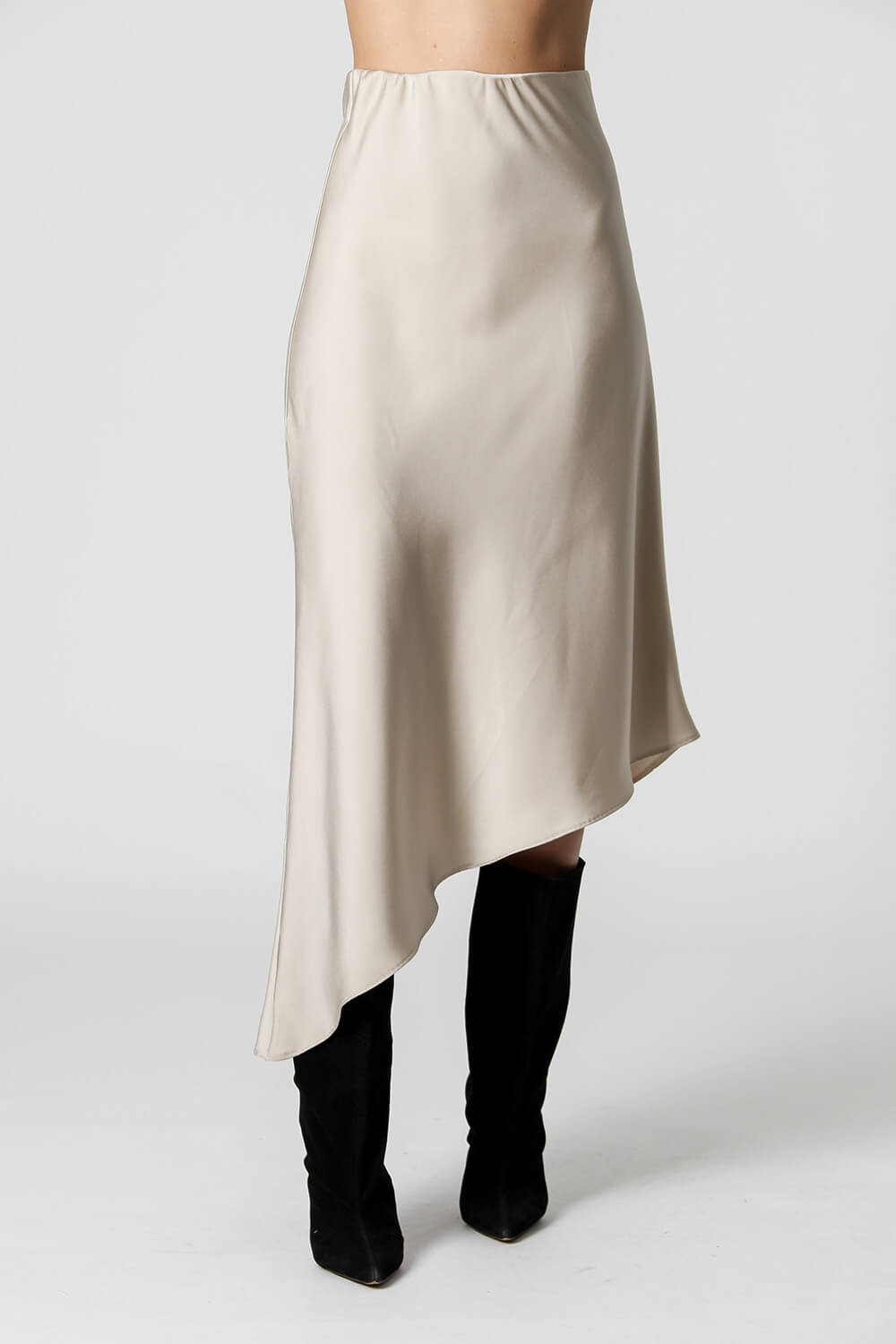 Falda midi asimétrica con cinturilla elástica. Una Pieza confeccionada en tejido Satén. Este modelo tiene un bonito y fluido calce que transmite elegancia para crear tus looks de noche que no pueden faltar en tu armario.