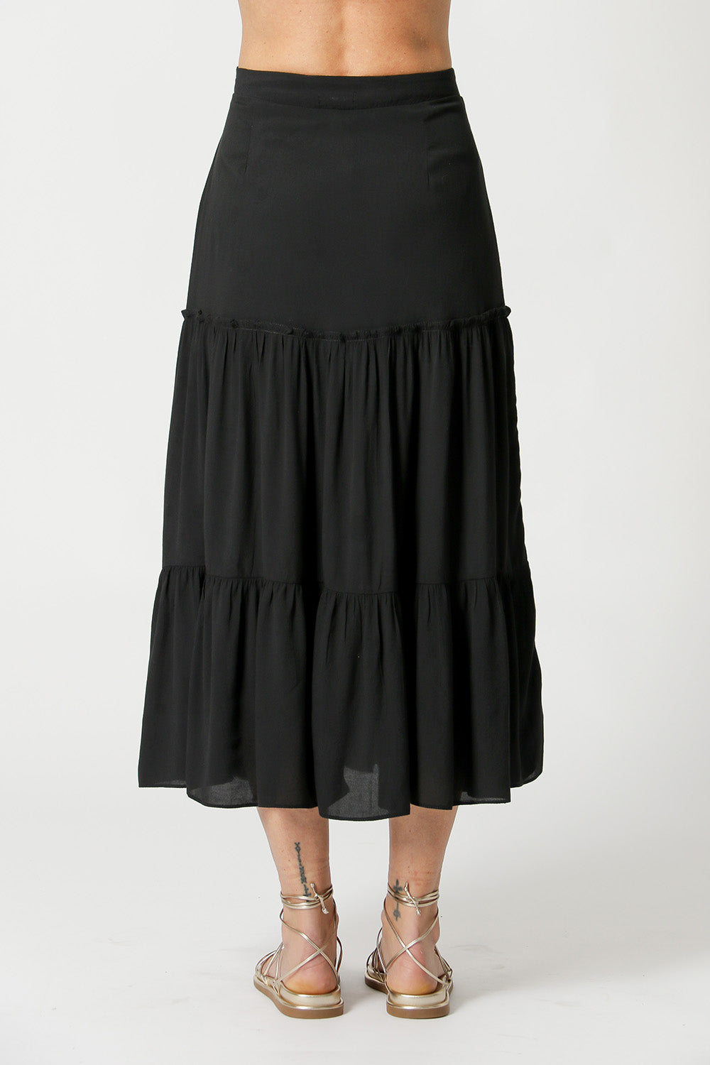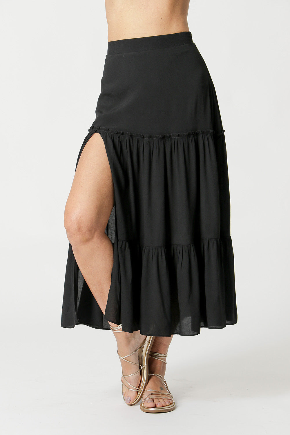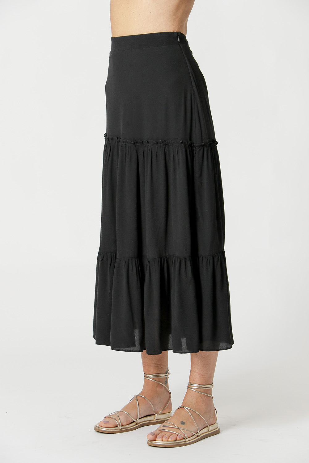 Falda midi confeccionada en crepe de viscosa, de corte fluido, puños ligeramente fruncidos y abertura frontal. ¡Una pieza que realza la silueta femenina y es la cara de la temporada!