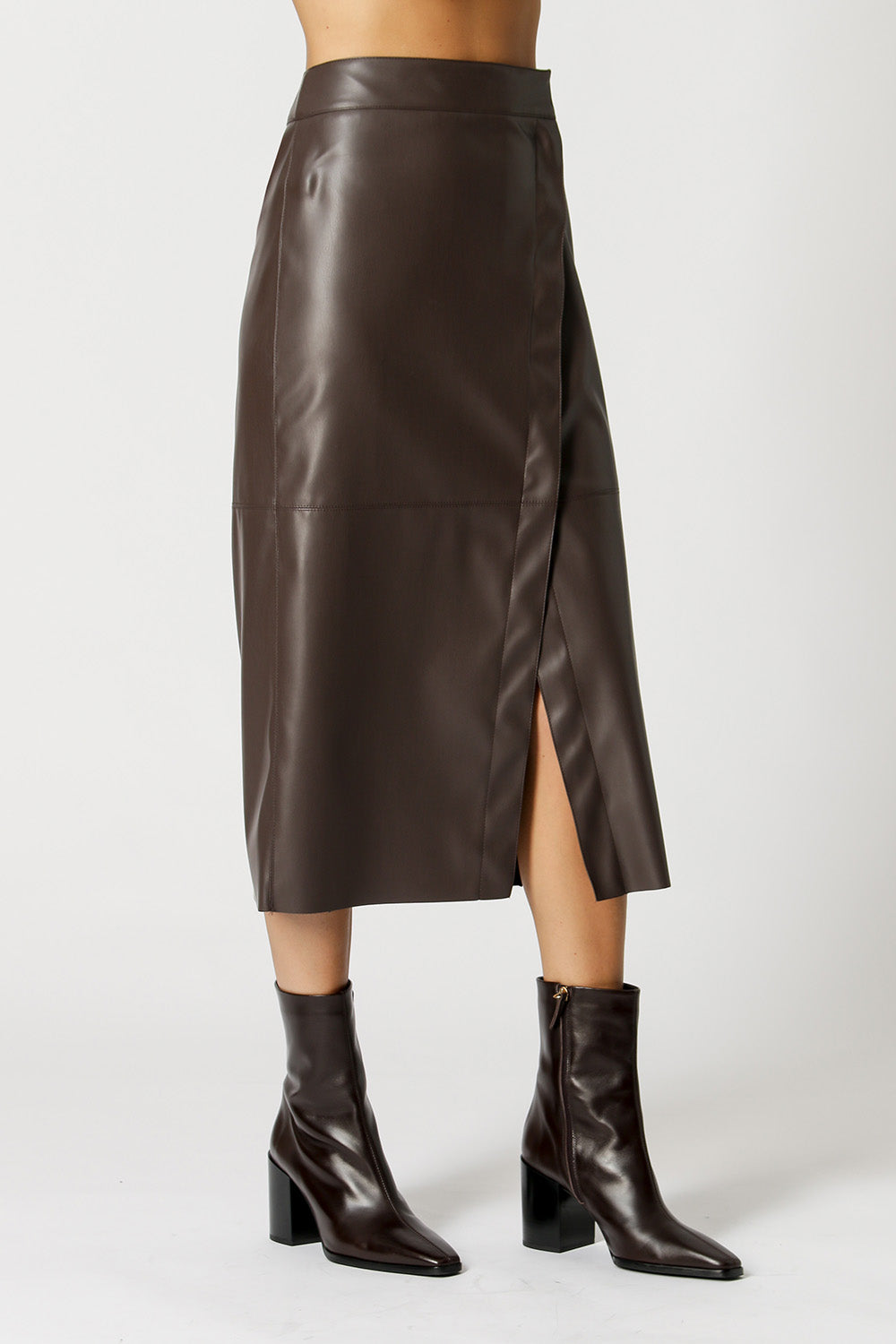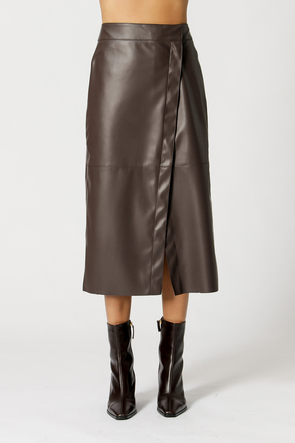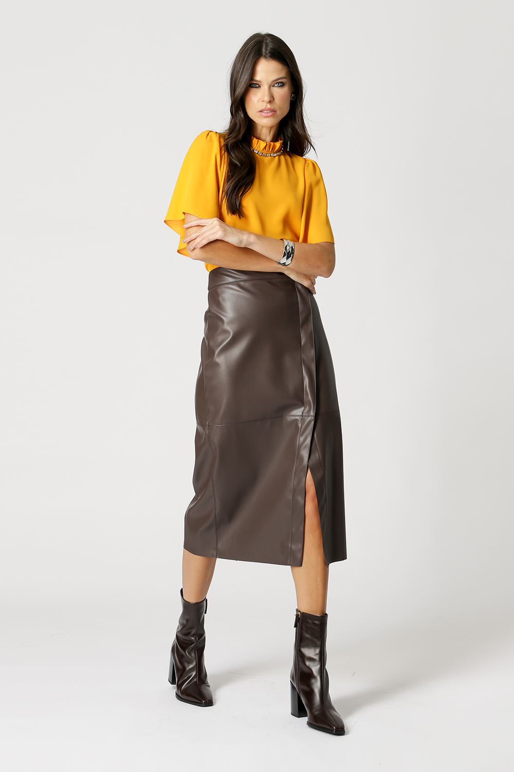 Falda midi con cremallera en la parte delantera. Fabricado en tela de piel sintética. Un modelo elegante que realmente realza el look laboral.