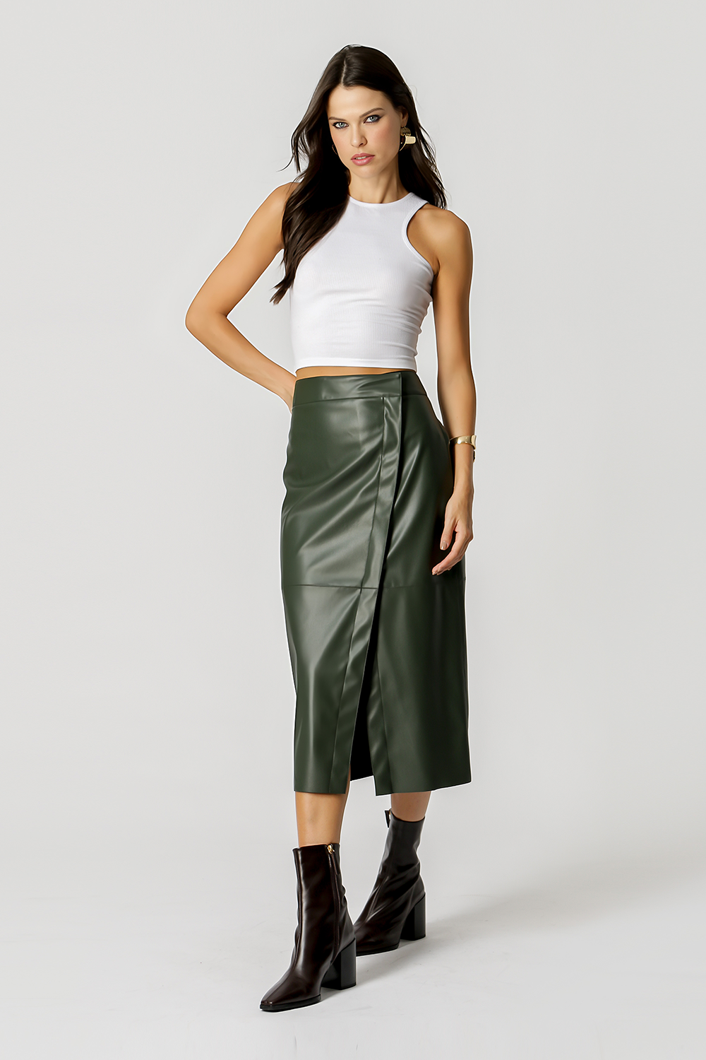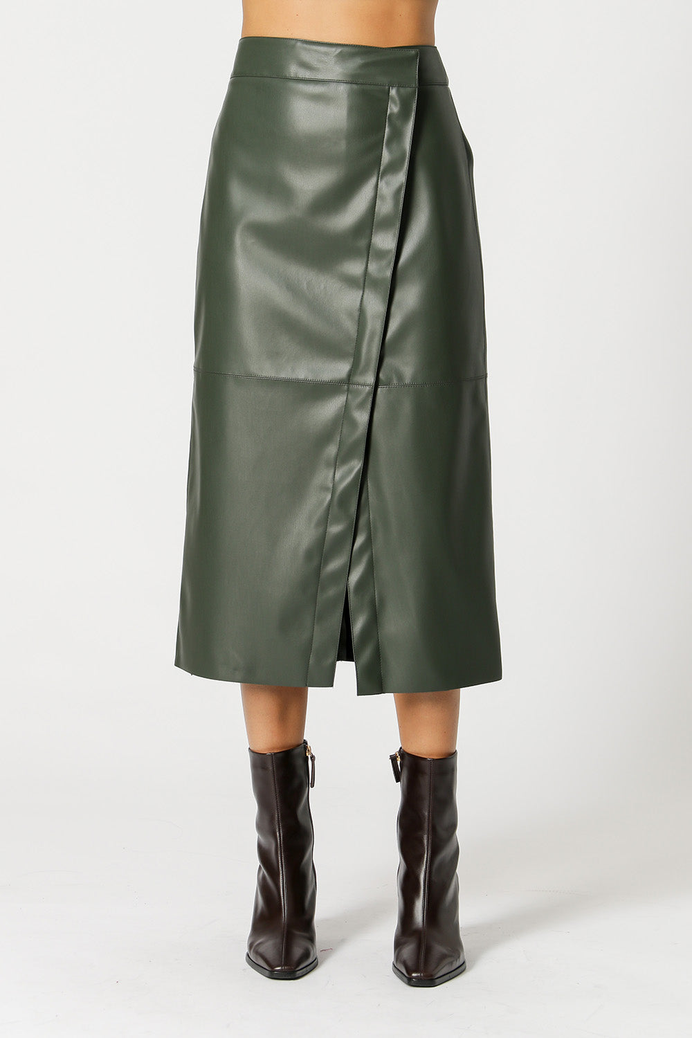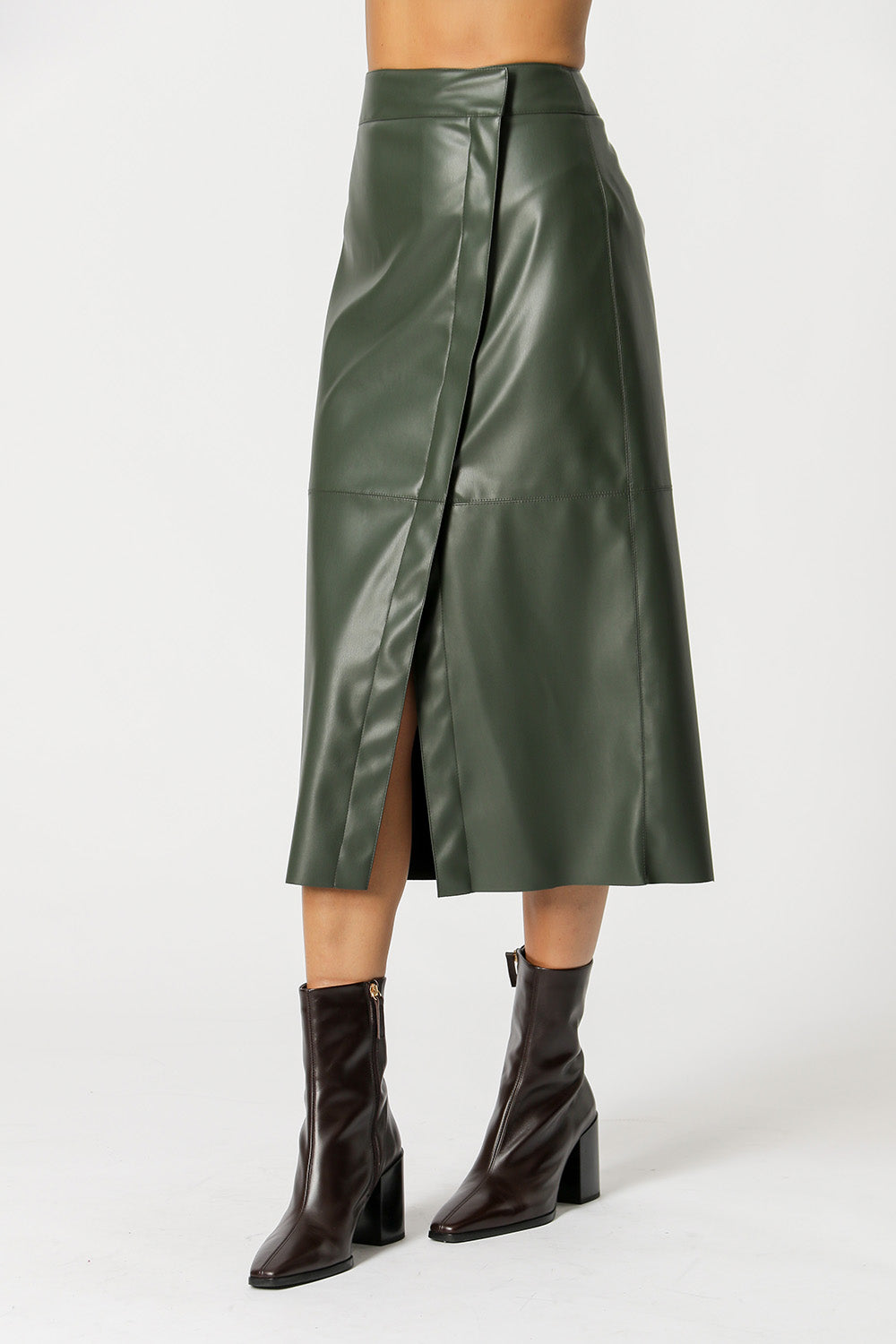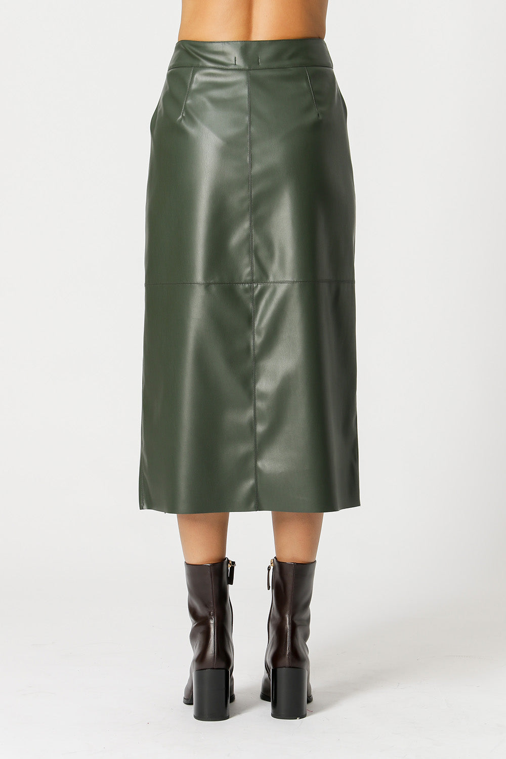 Falda midi con cremallera en la parte delantera. Fabricado en tela de piel sintética. Un modelo elegante que realmente realza el look laboral.