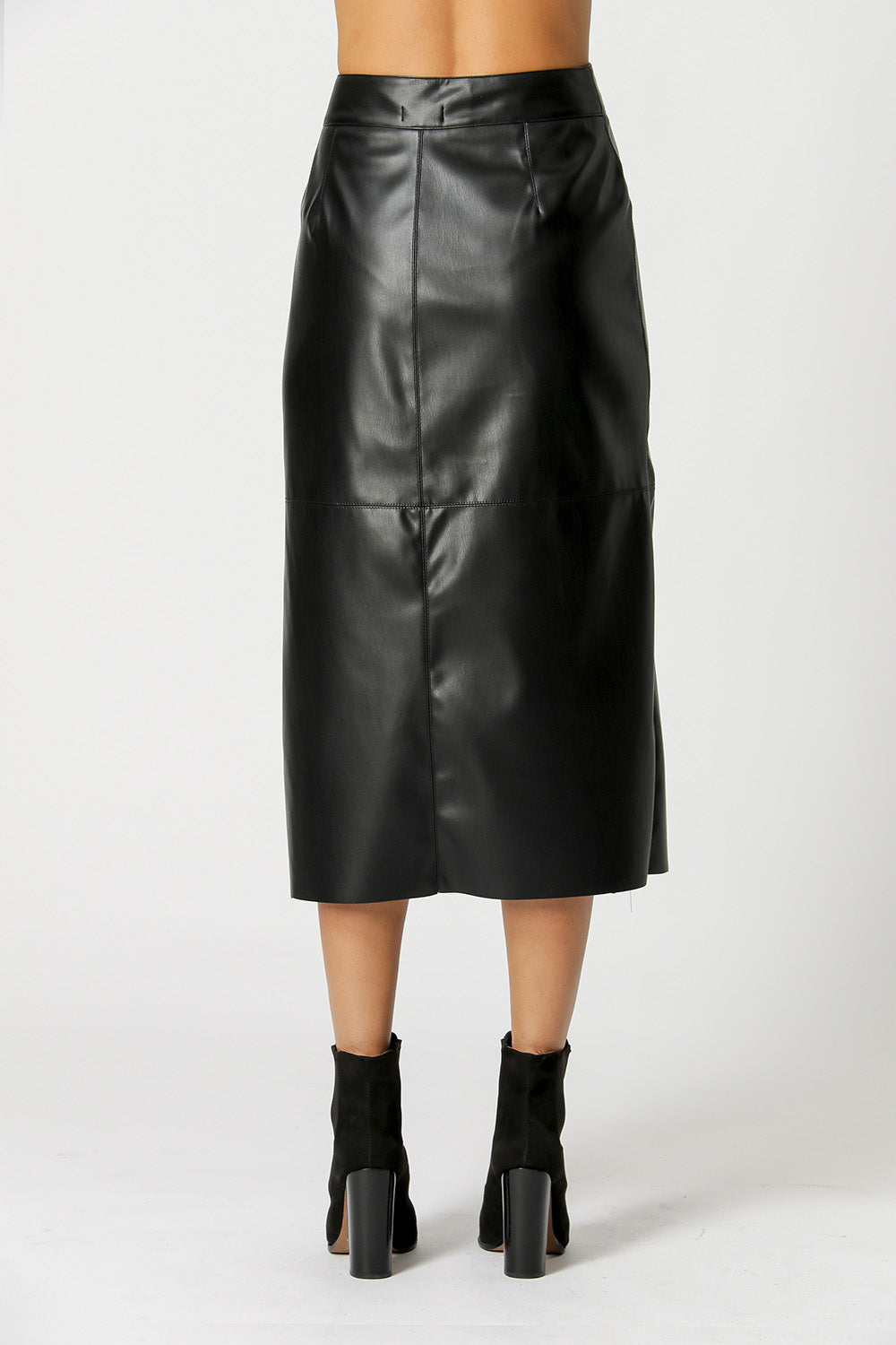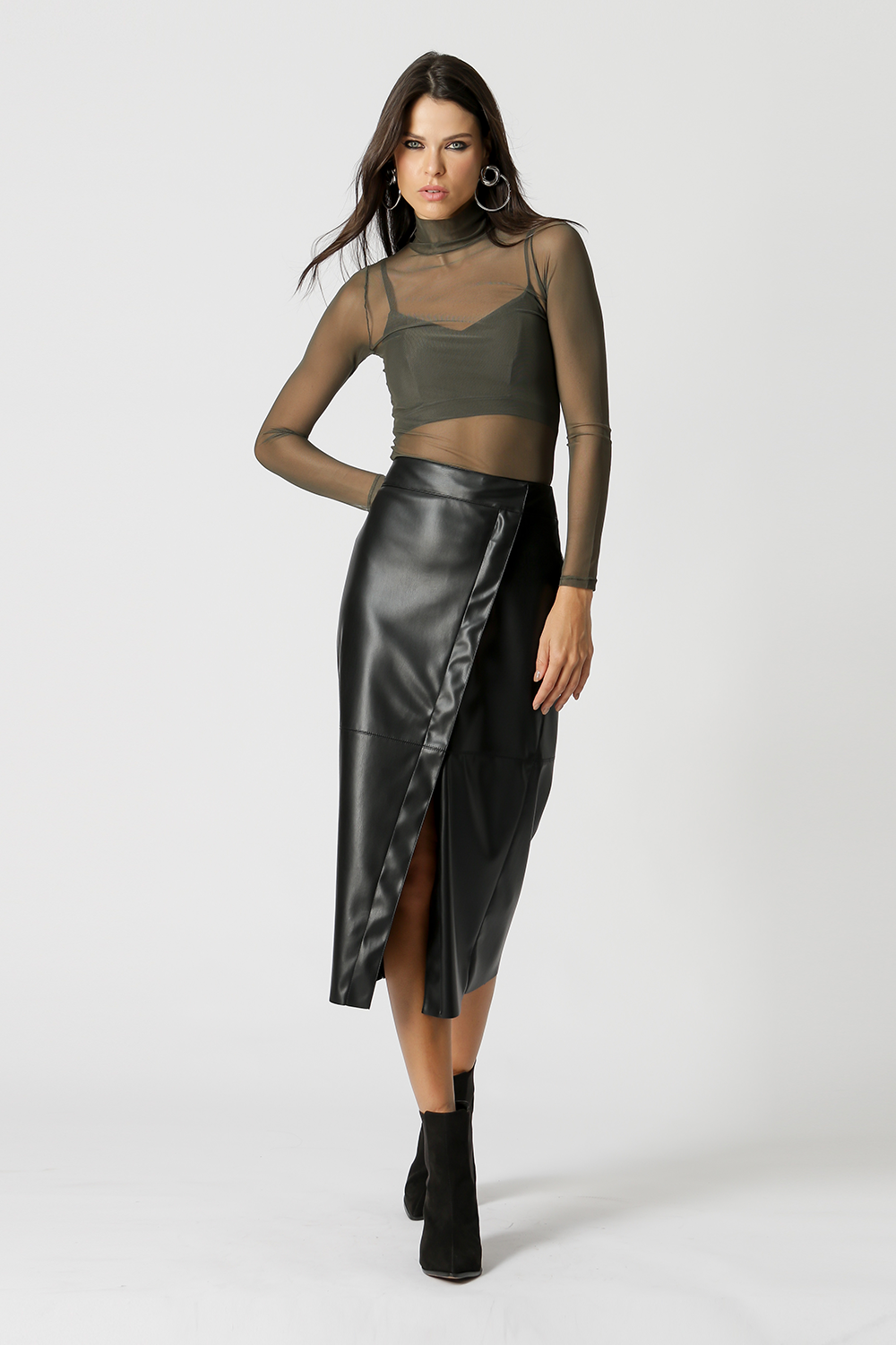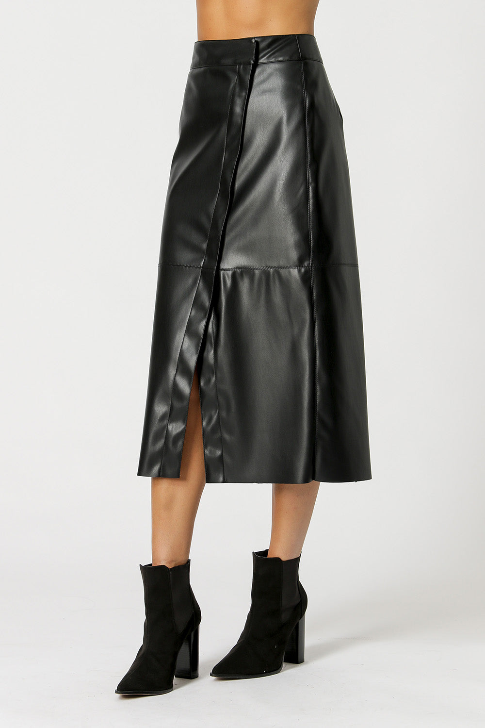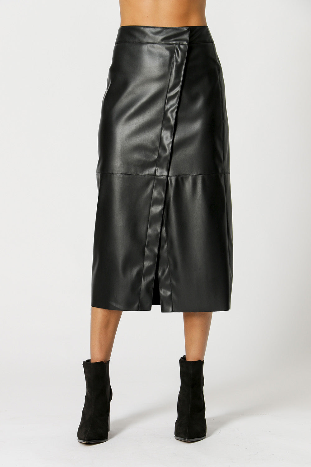 Falda midi con cremallera en la parte delantera. Fabricado en tela de piel sintética. Un modelo elegante que realmente realza el look laboral.