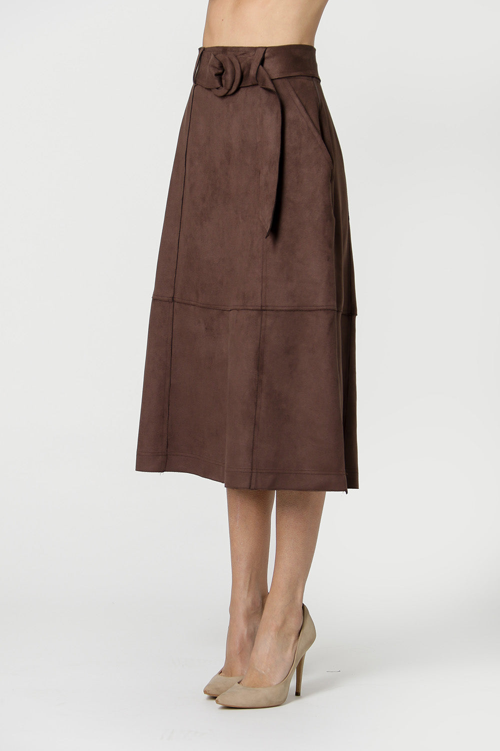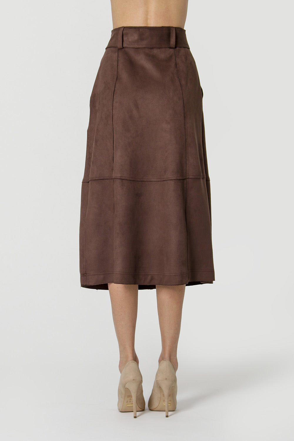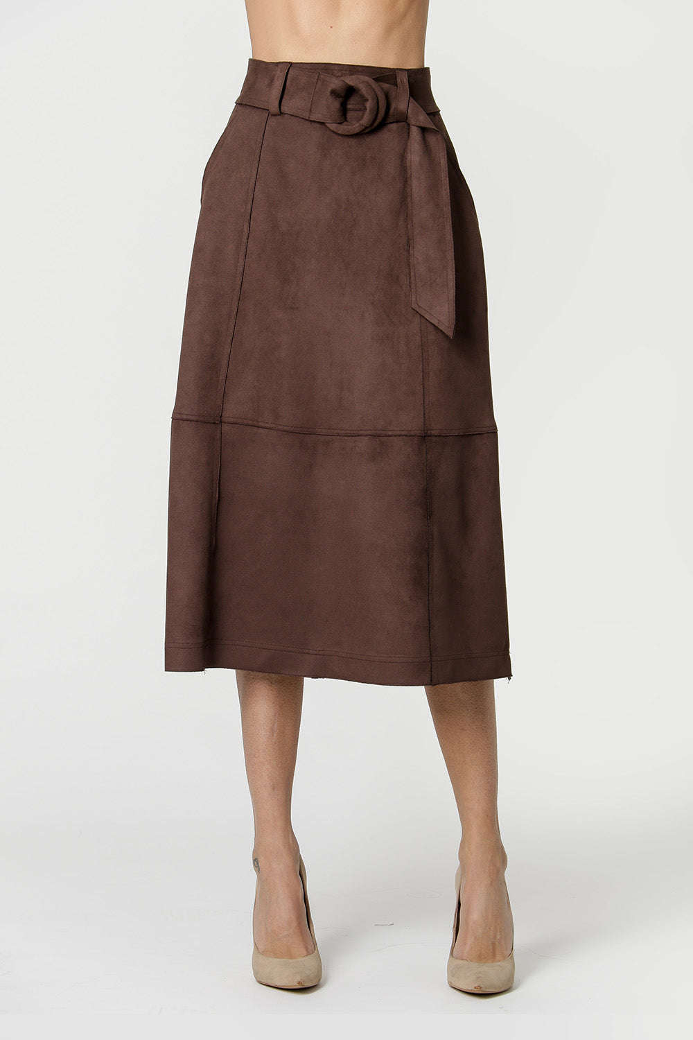 Falda midi con corte evasé confeccionada en tejido ante. Detalle de barras alambradas, recortes con doble costura, banda con hebilla. Pieza clave para hacer tu look más elegante.