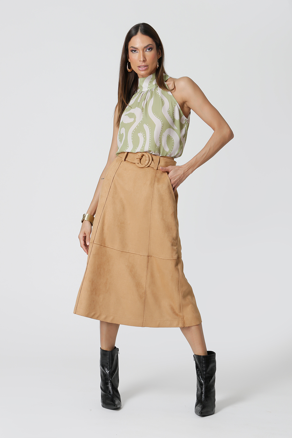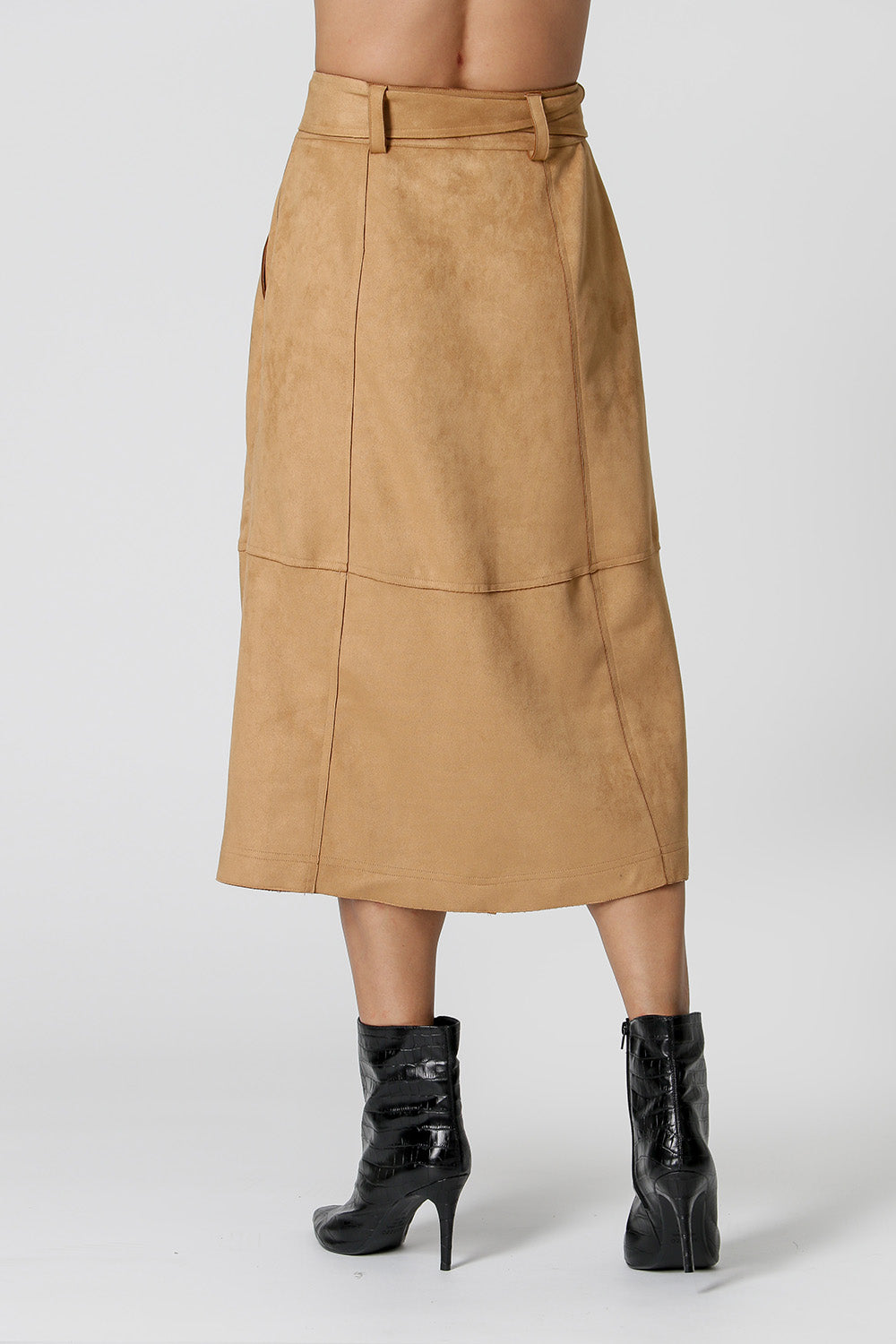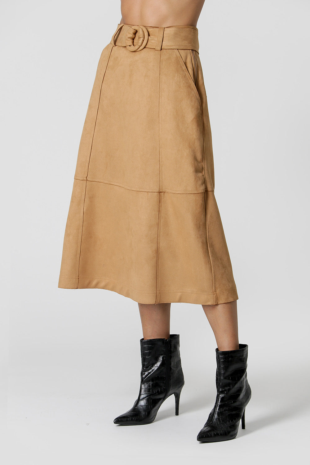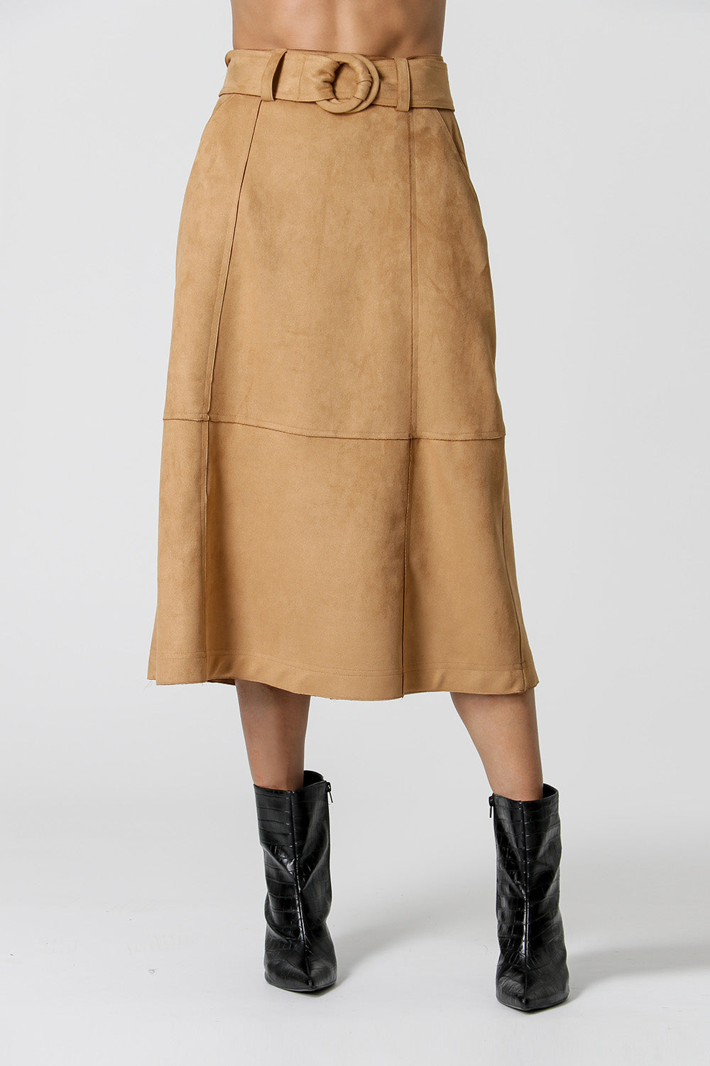 Falda midi con corte evasé confeccionada en tejido ante. Detalle de bajos con alambre, cortes con doble costura, cinturón con hebilla. Pieza clave para hacer tu look más elegante.
