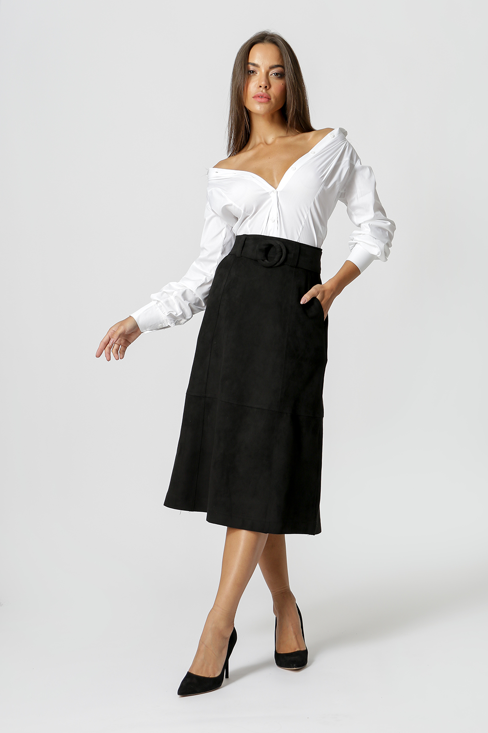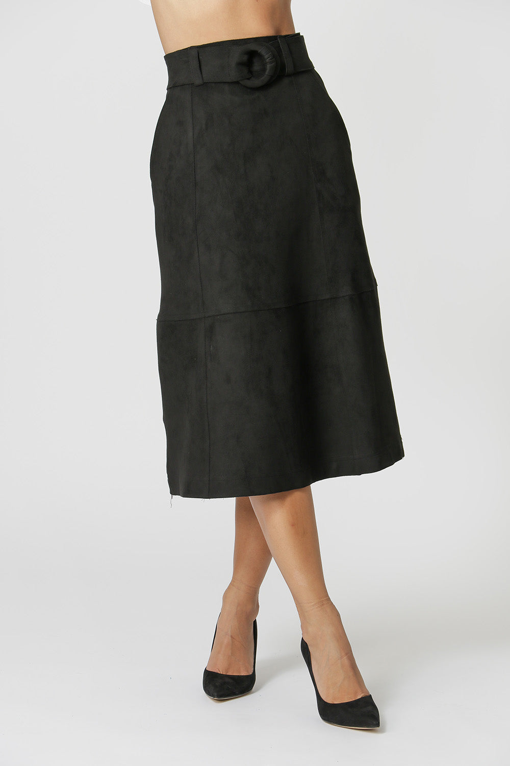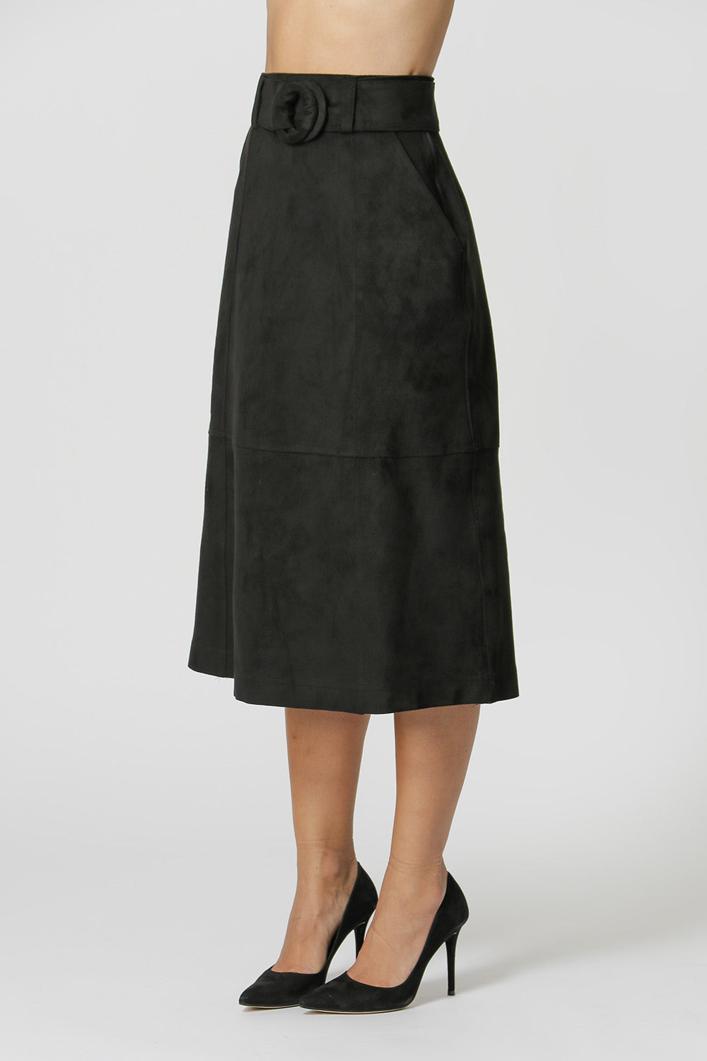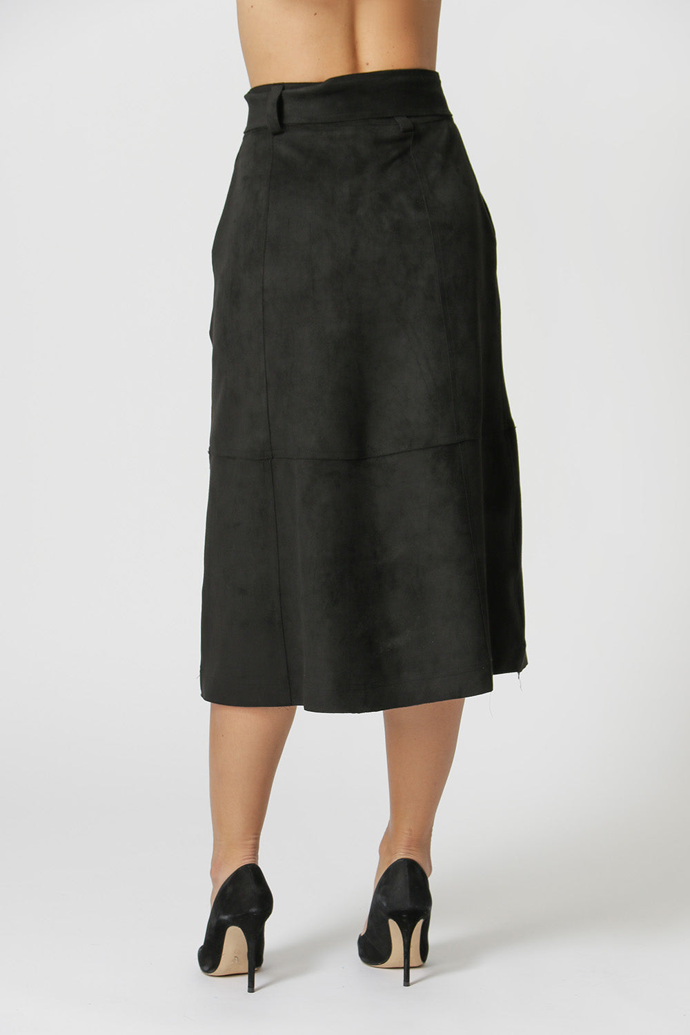 Falda midi con corte evasé confeccionada en tejido ante. Detalle de barras alambradas, recortes con doble costura, banda con hebilla. Pieza clave para hacer tu look más elegante.