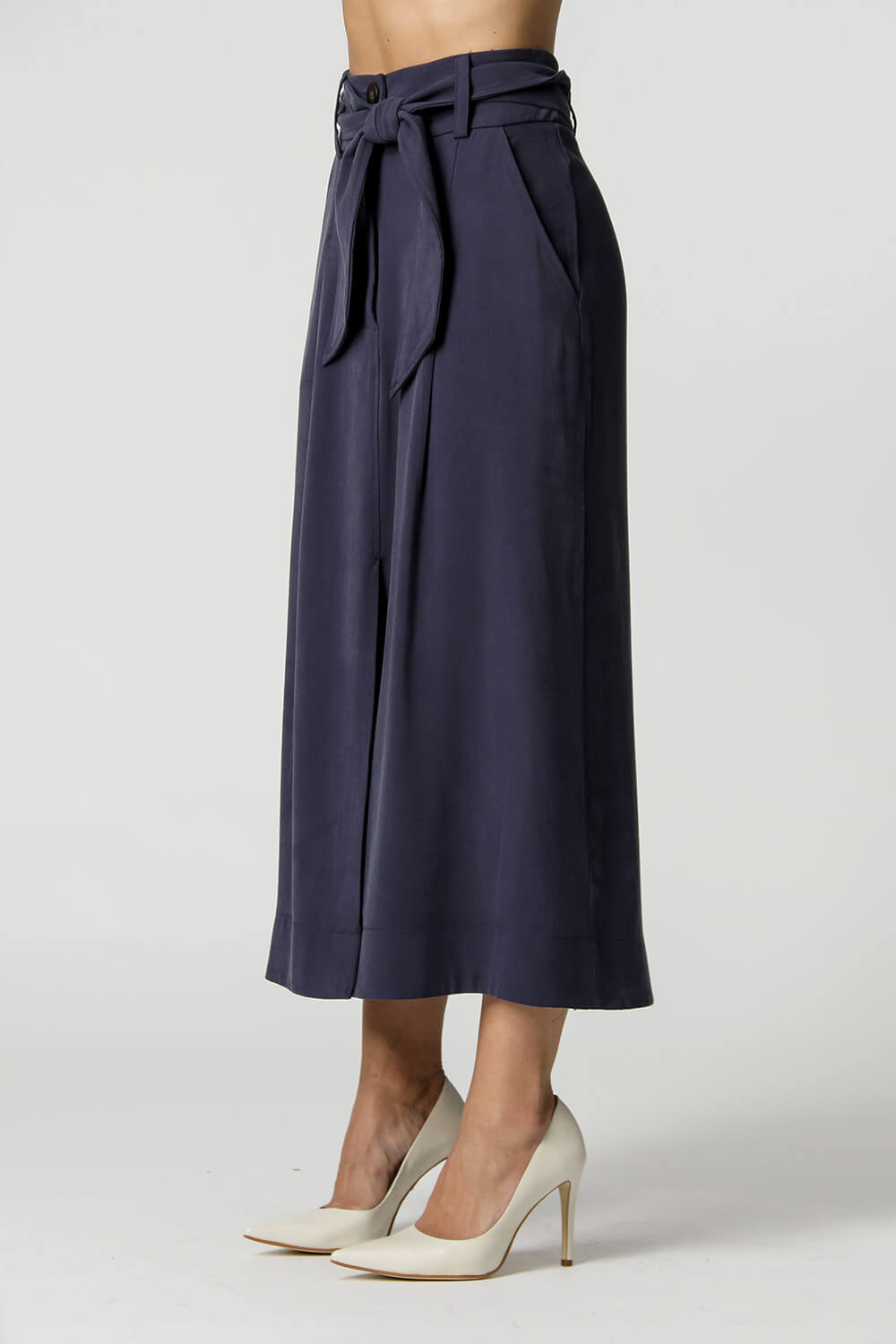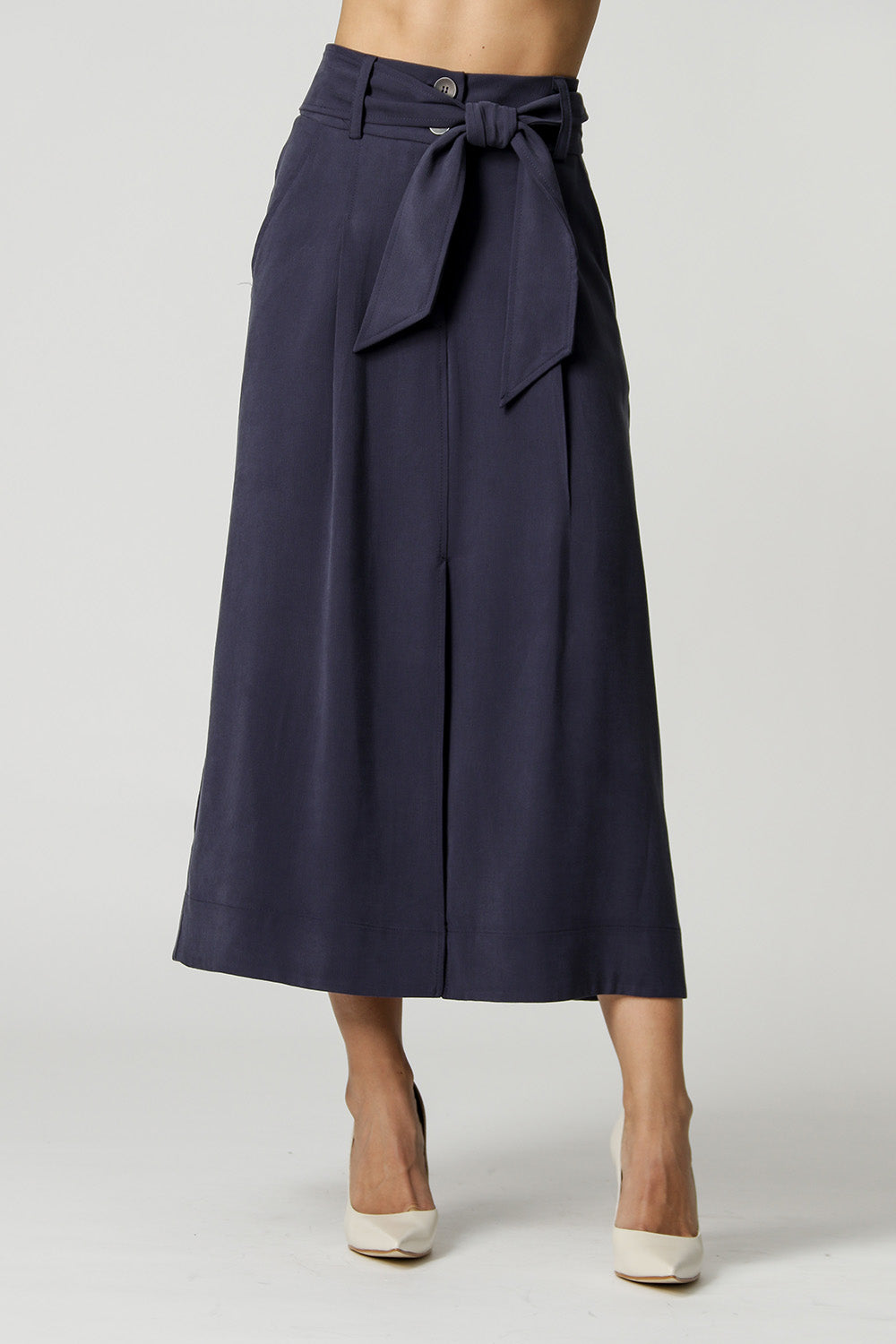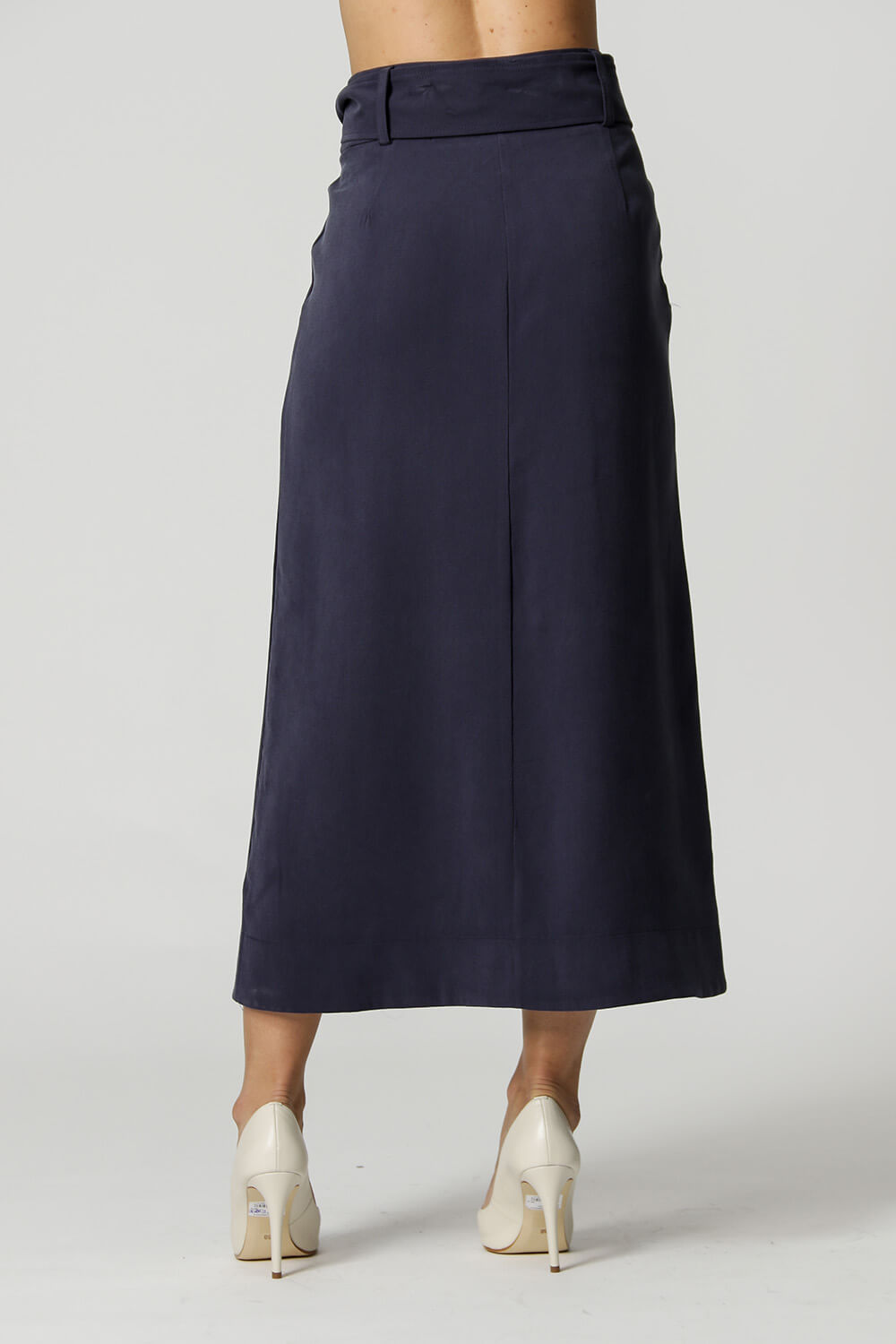 Falda midi con abertura delantera y cinturilla del mismo tejido con botones únicos. Modelo realizado en tejido Tencel de textura ligera. Un modelo que tiene el ajuste ideal para quienes buscan piezas holgadas que aporten comodidad al look, apuesta por esta pieza.