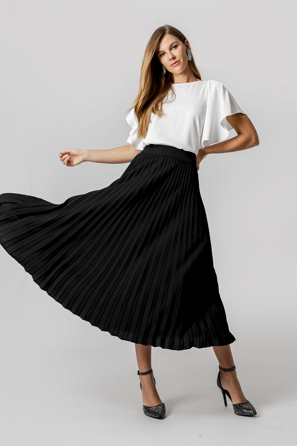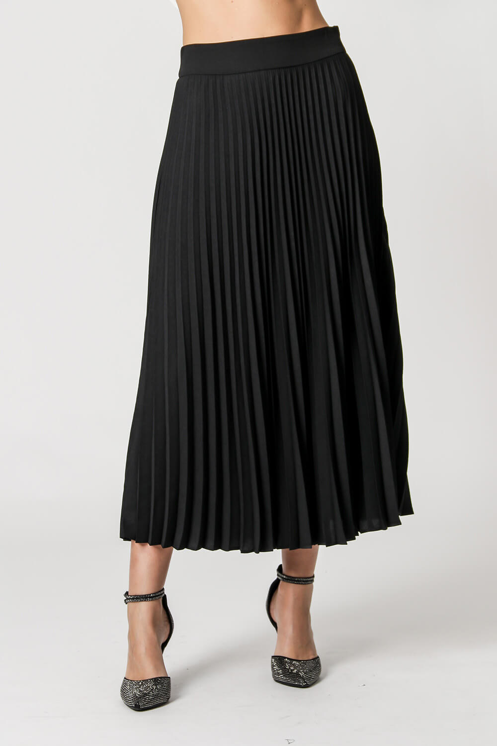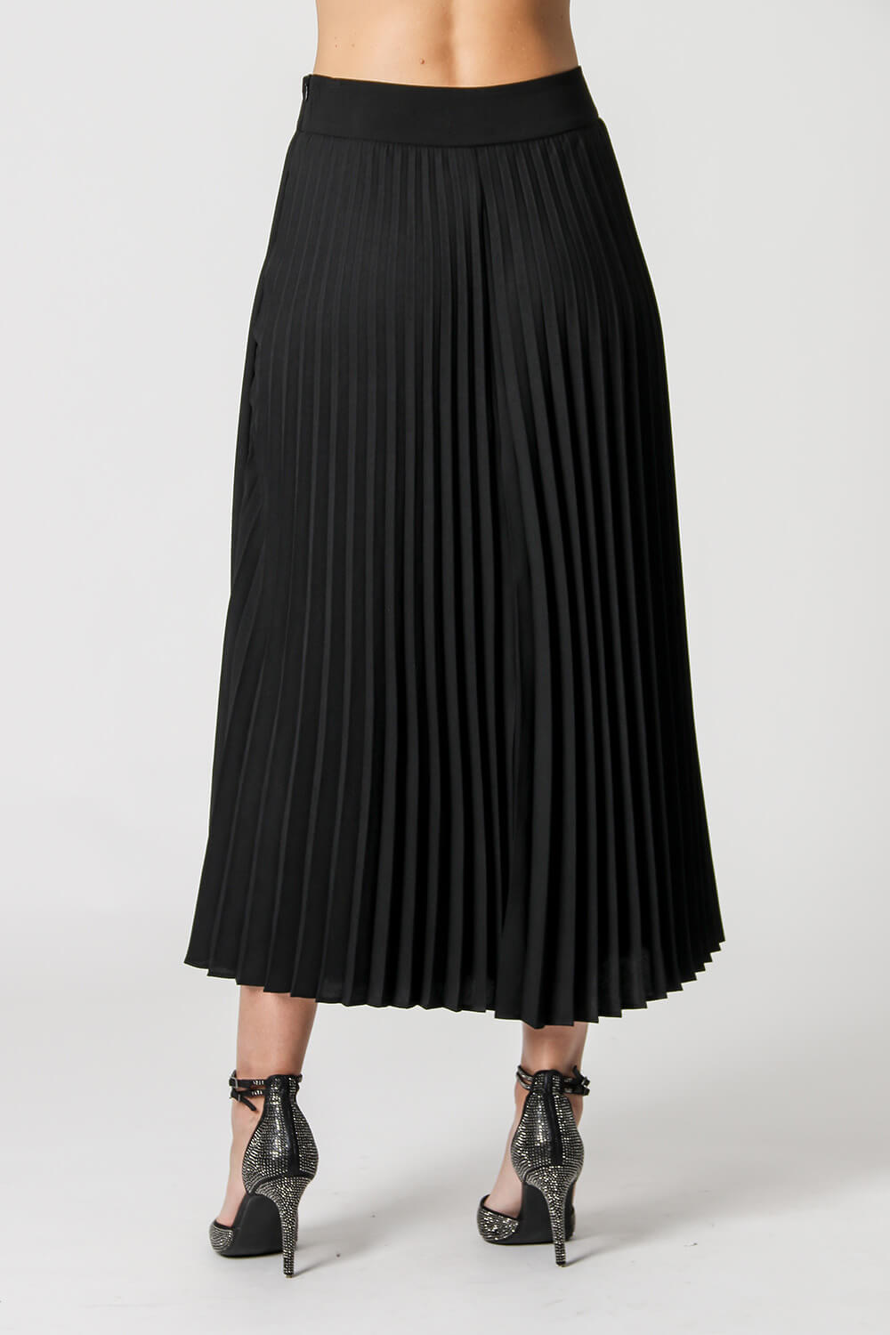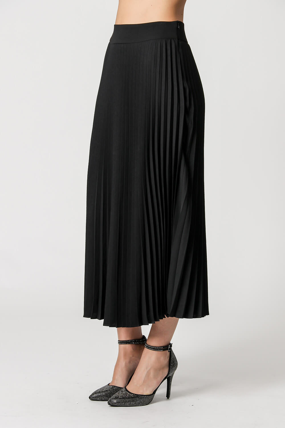 Falda midi plisada con cremallera lateral. Fabricado en tejido crepé fluido. Un modelo súper elegante para complementar tus looks casuales.