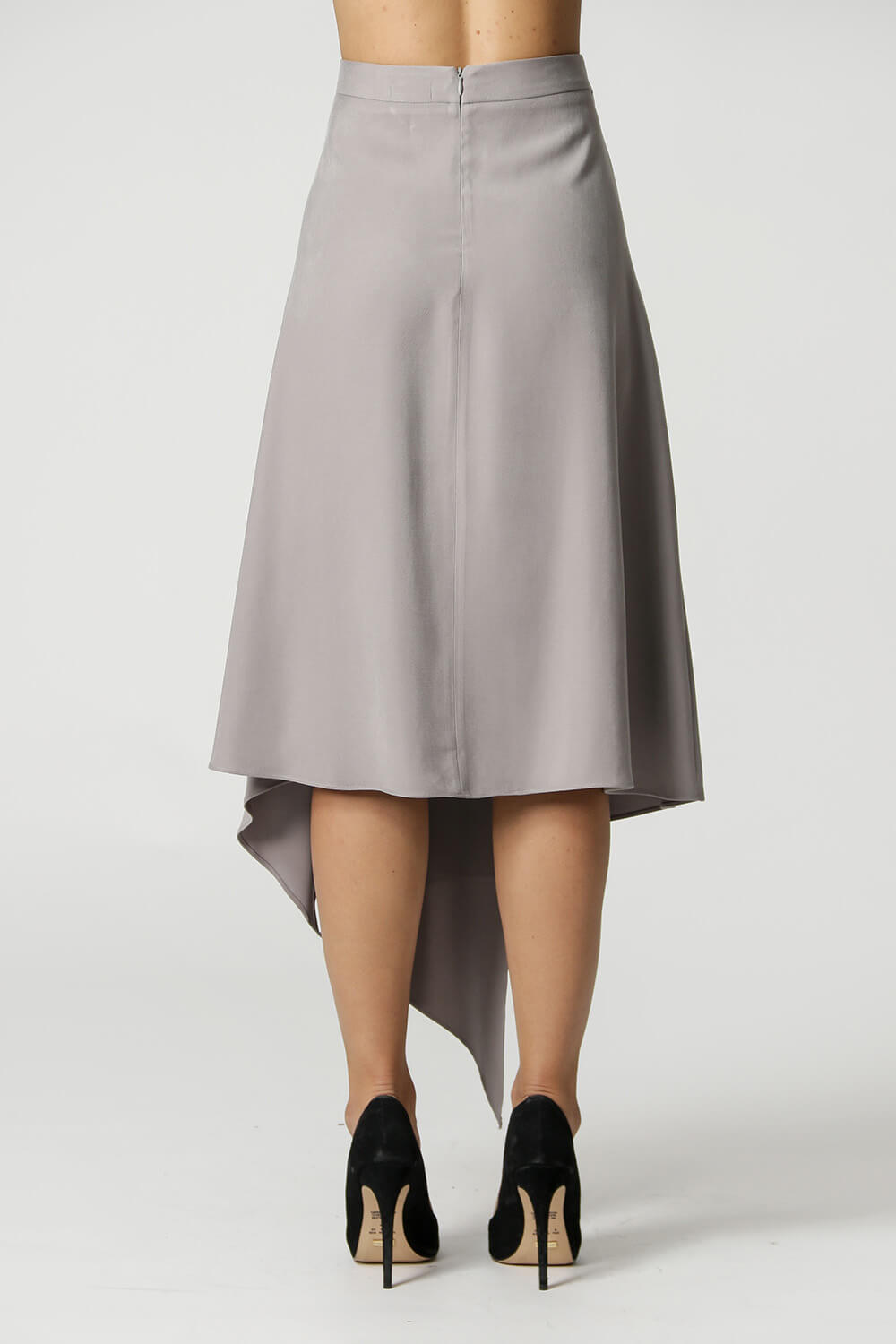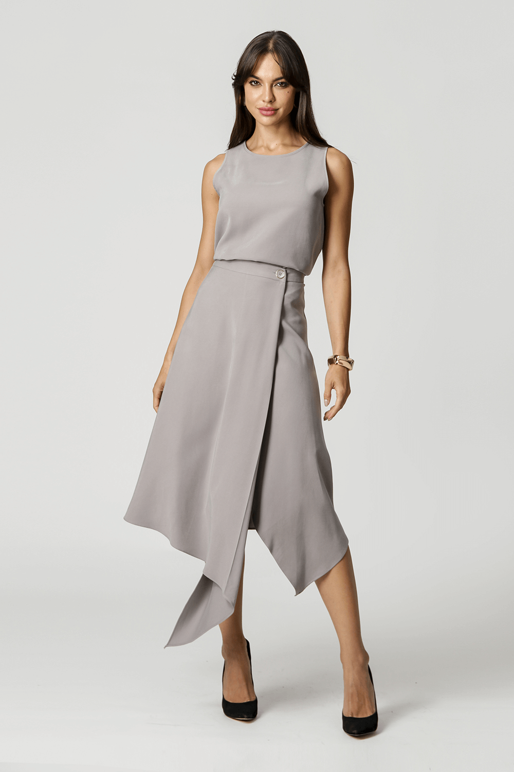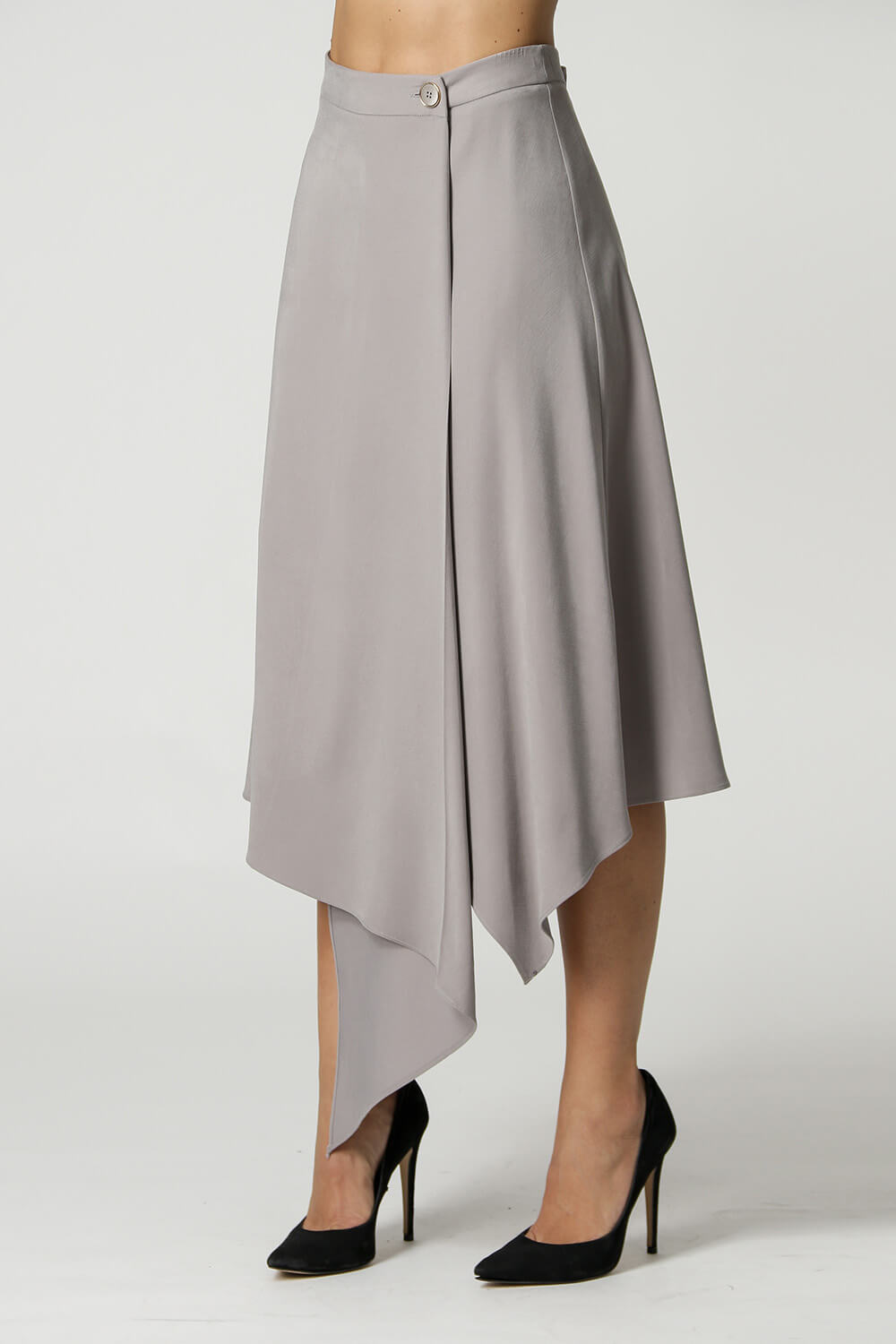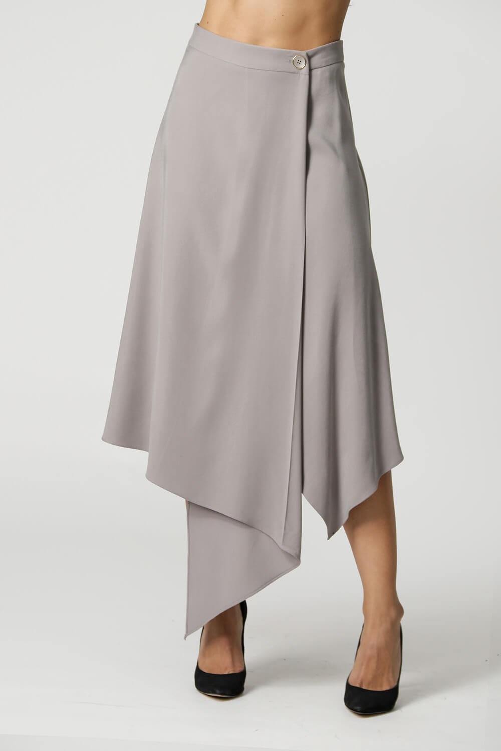 Falda midi cruzada con botón, cremallera invisible en la espalda. Pieza confeccionada en tejido tencel. Un modelo perfecto para ocasiones laborales.