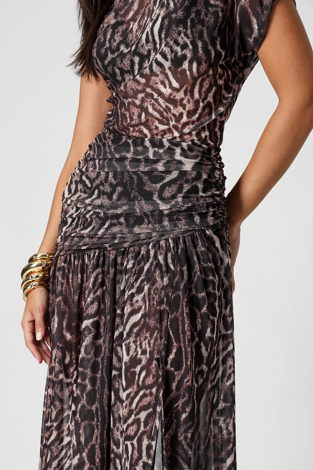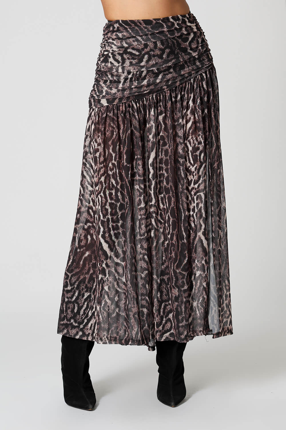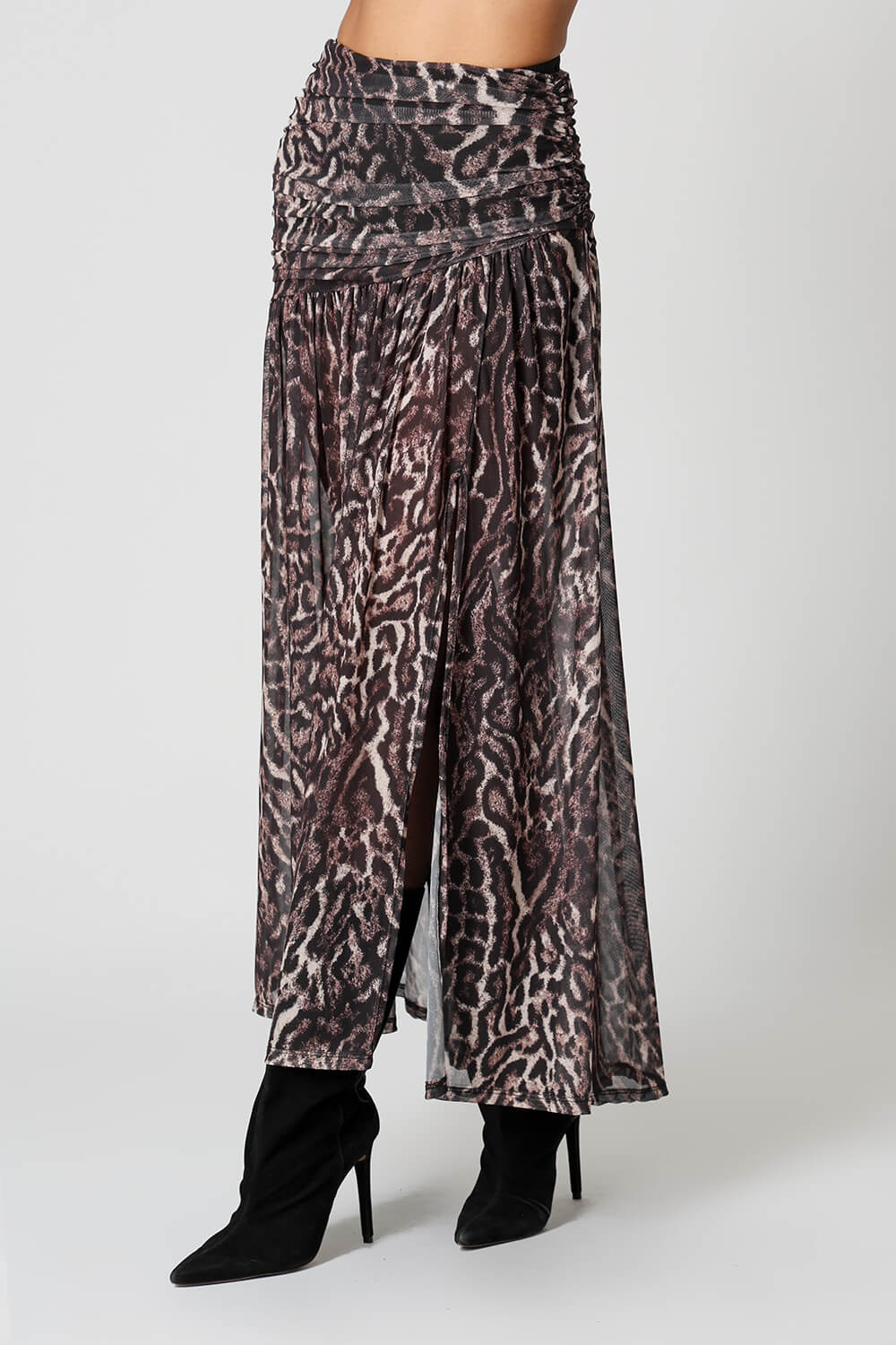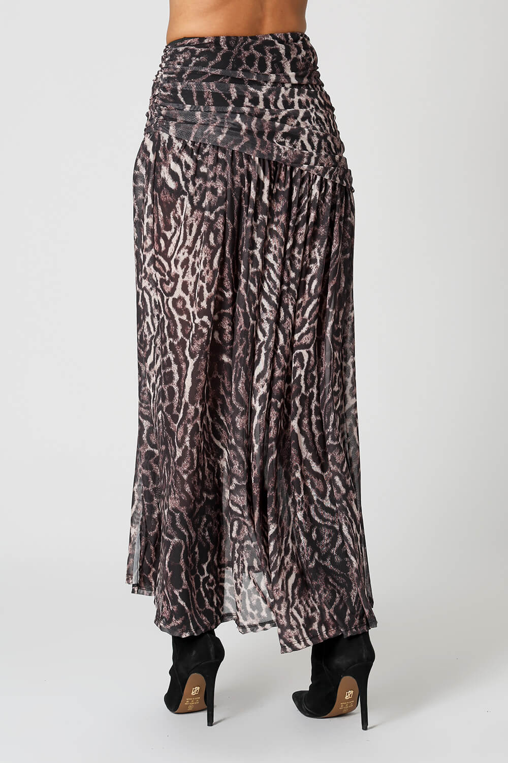 Saia em tule estampado com pala drapeada assimétrica e fenda frontal na perna esquerda. Leve e sofisticada, perfeita para looks modernos e elegantes.