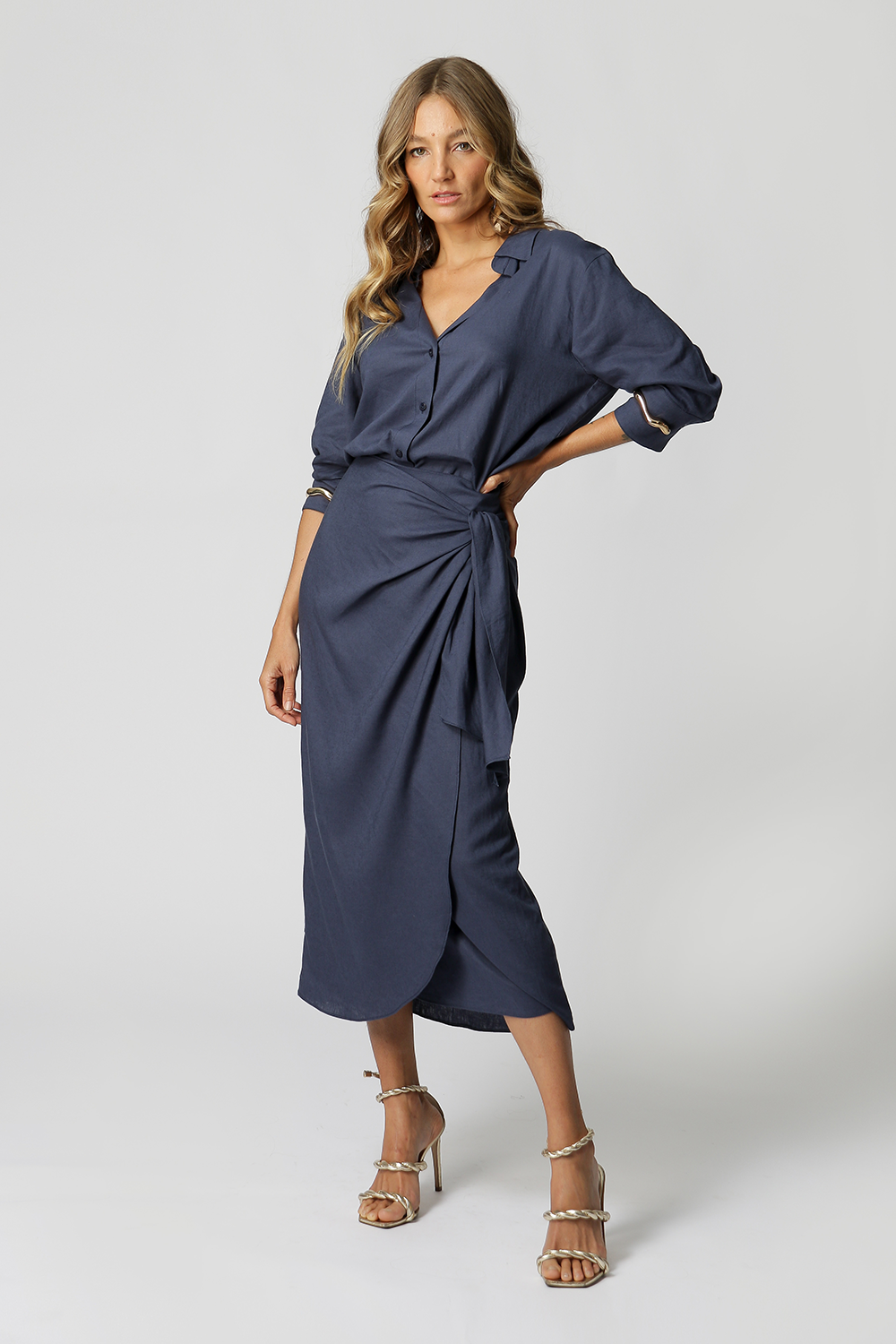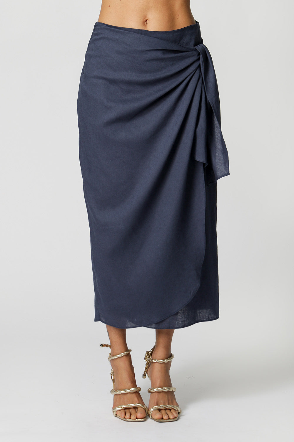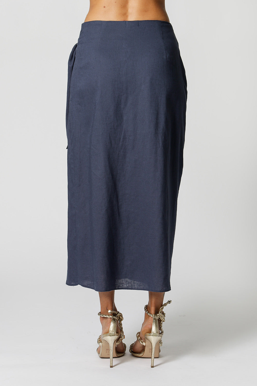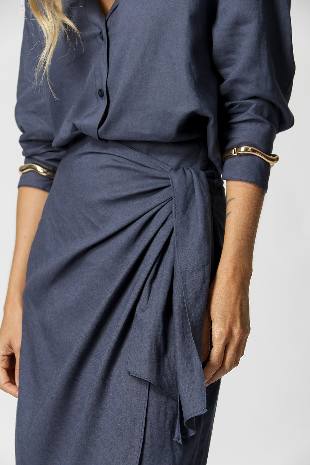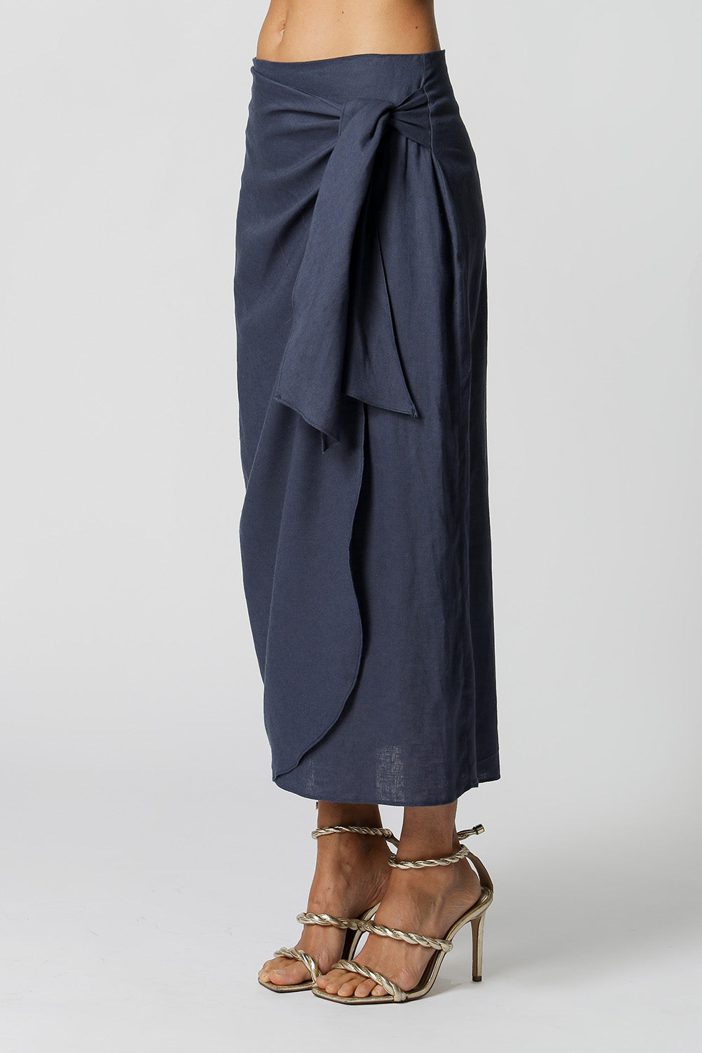 Falda media con drapeado y lazo en el lateral. Fabricado en tejido de lino. Una pieza de forma cómoda y llena de encanto para looks casuales en tu día a día.