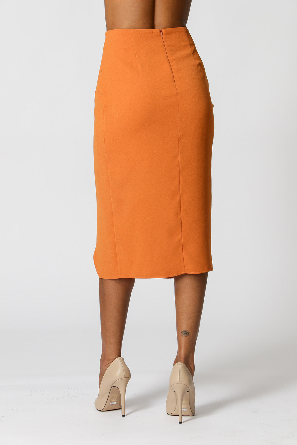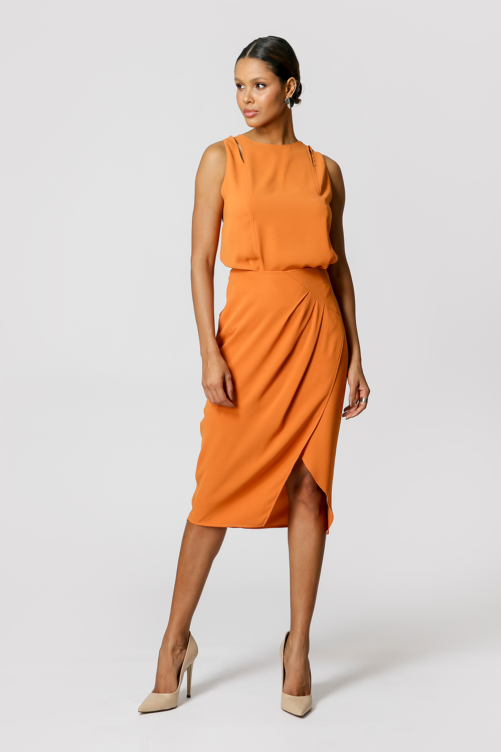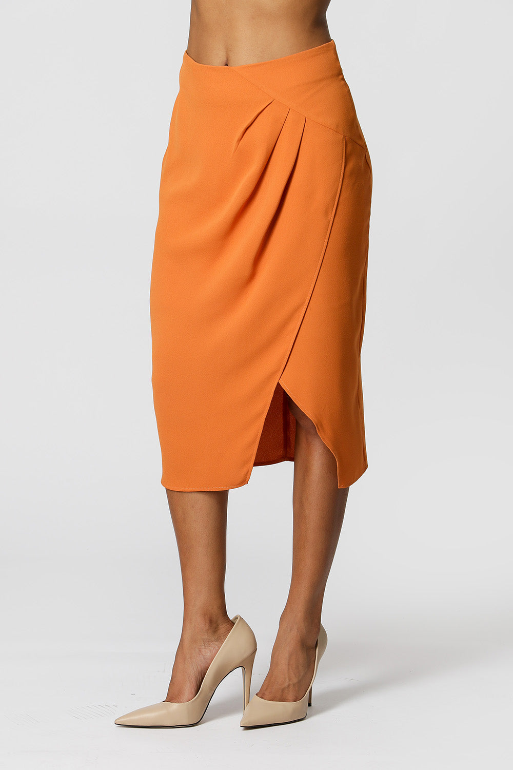 Falda confeccionada en crepe, asimétrica con pliegues y largo midi. ¡Una pieza elegante para que la lleves sin miedo! Ideal para looks de trabajo.
