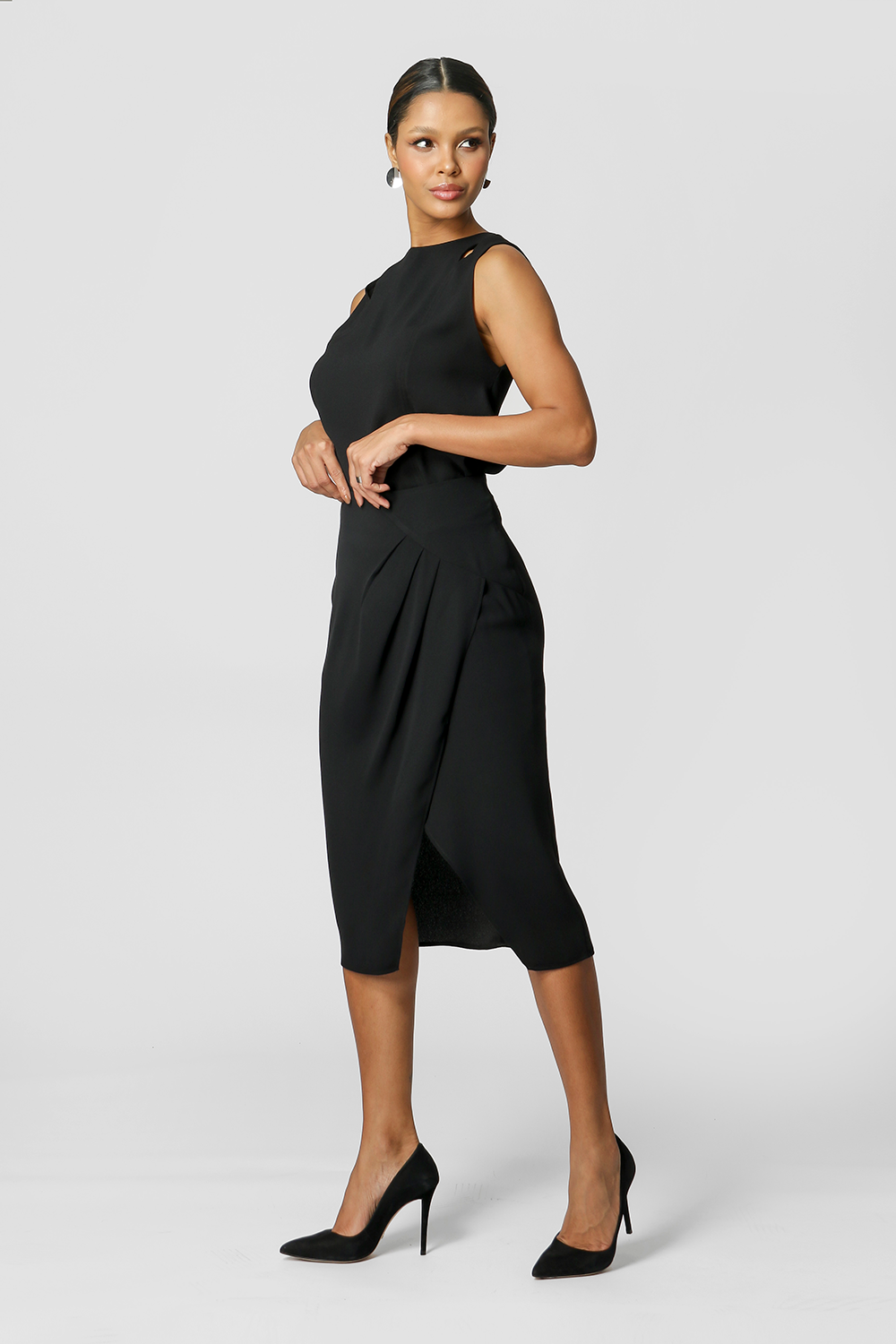 Falda confeccionada en crepe, asimétrica con pliegues y largo midi. ¡Una pieza elegante para que la lleves sin miedo! Ideal para looks de trabajo.