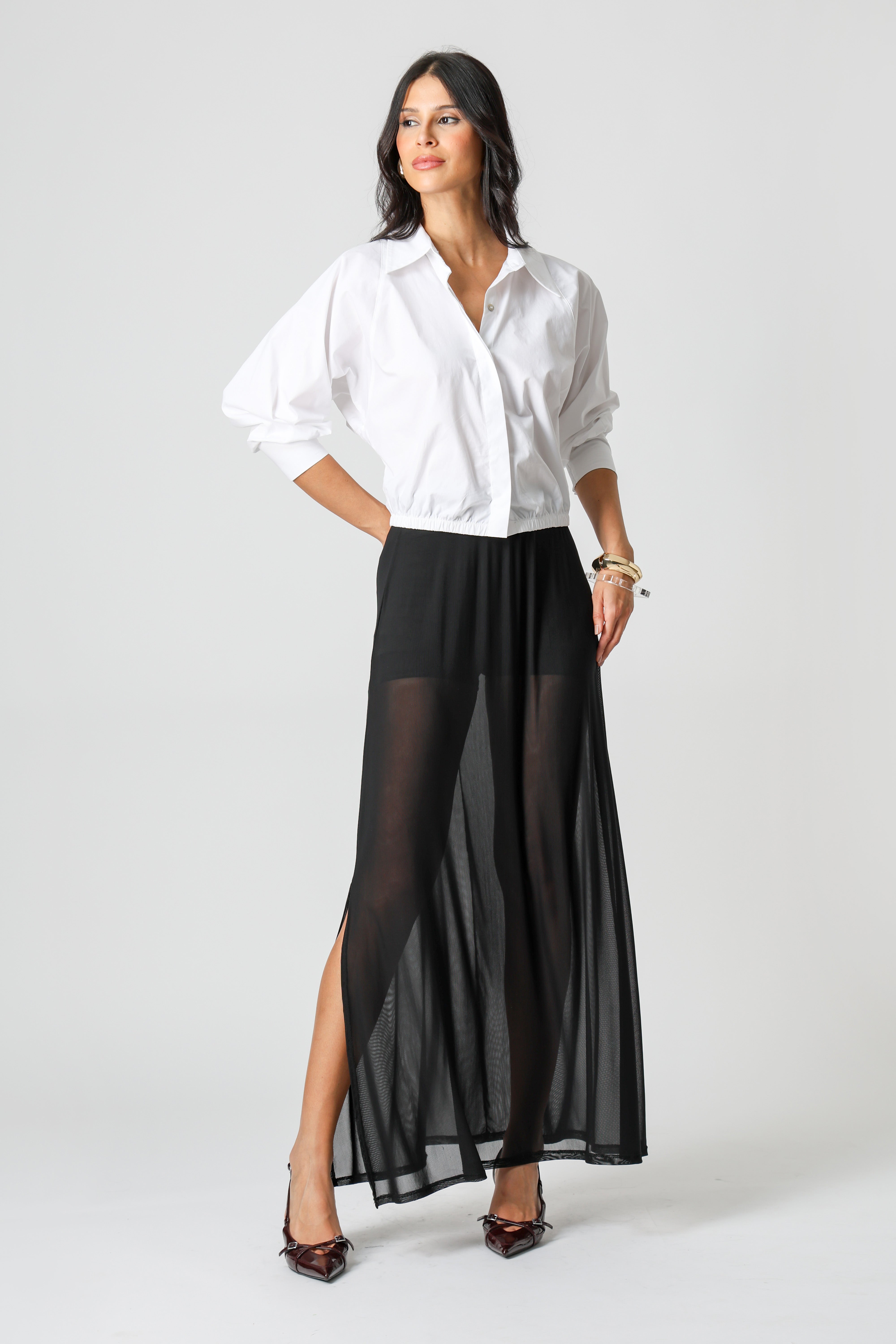 Leve, elegante e cheia de charme. A saia de tule com fenda valoriza o movimento e traz um toque sensual na medida certa. Perfeita para compor looks modernos, do casual ao sofisticado.