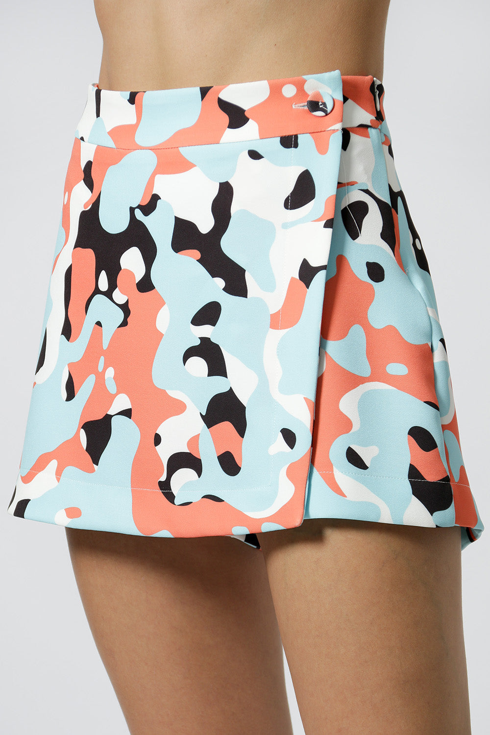 Falda corta confeccionada en sastrería estampada, con cierre de botón y cremallera. Pieza moderna y femenina perfecta para esta temporada.