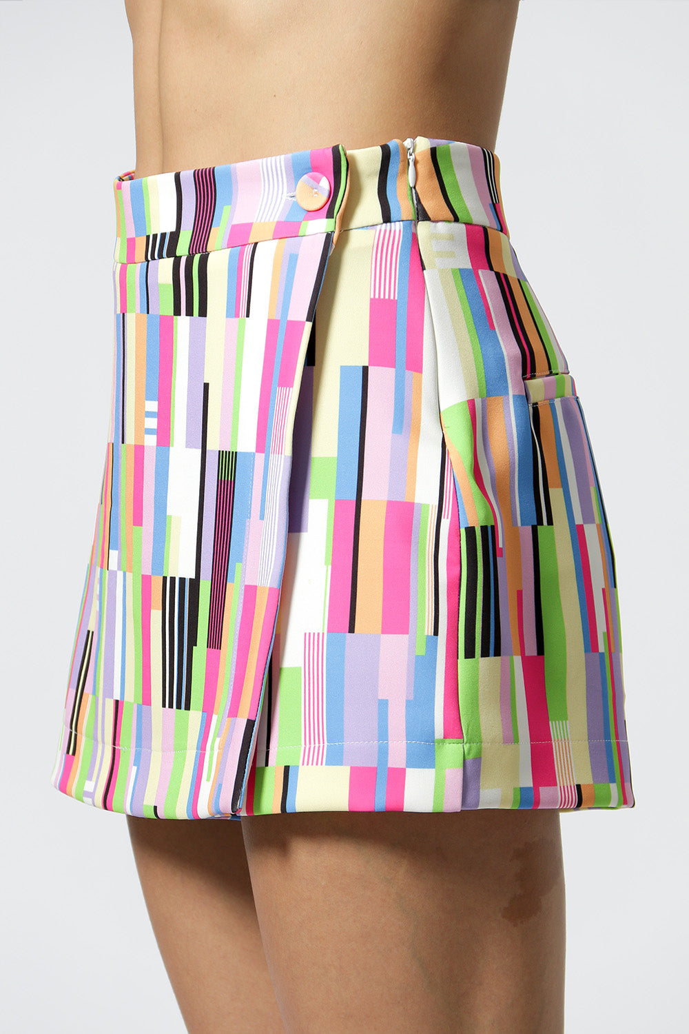 Falda corta confeccionada en sastrería estampada, con cierre de botón y cremallera. Pieza moderna y femenina perfecta para esta temporada.