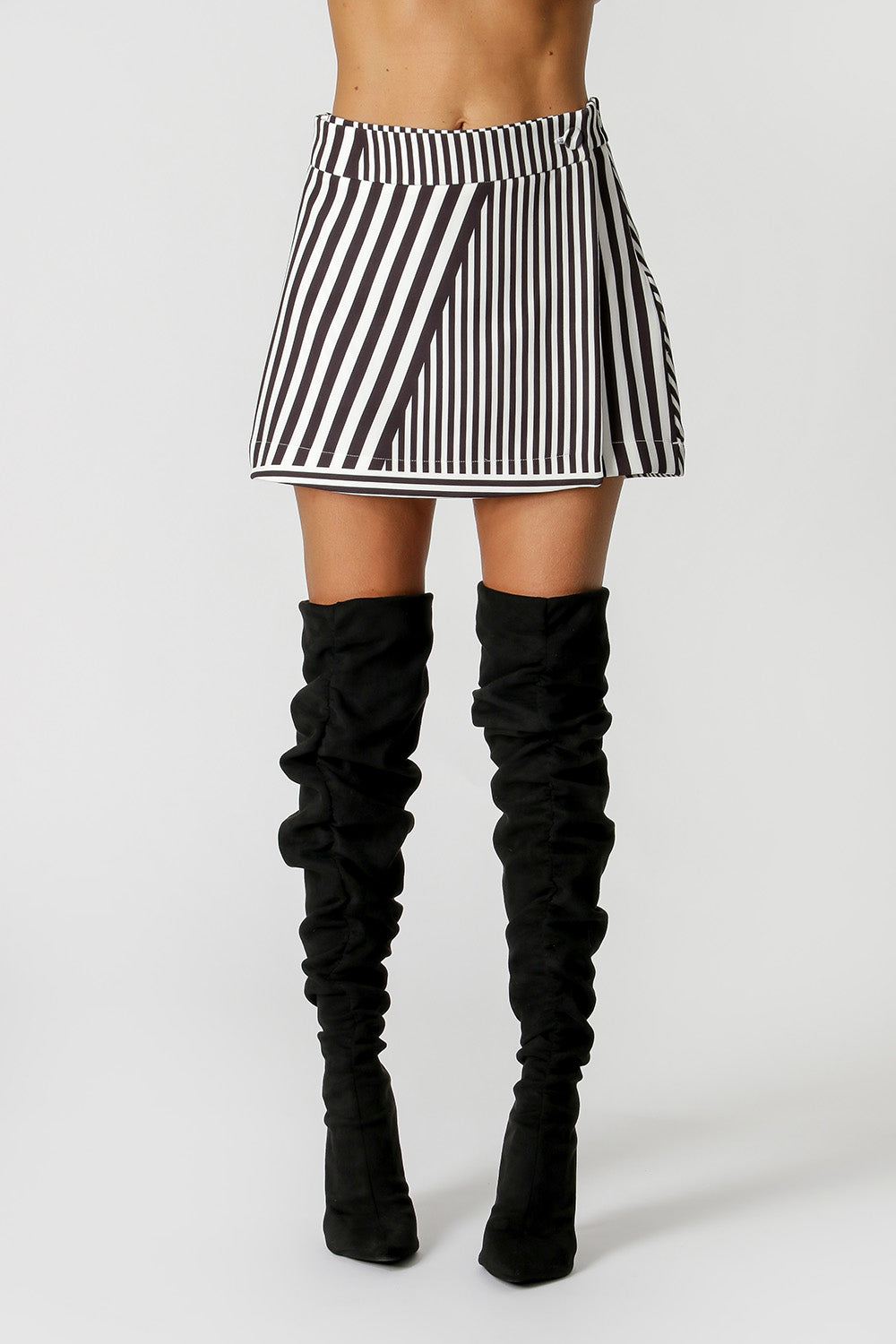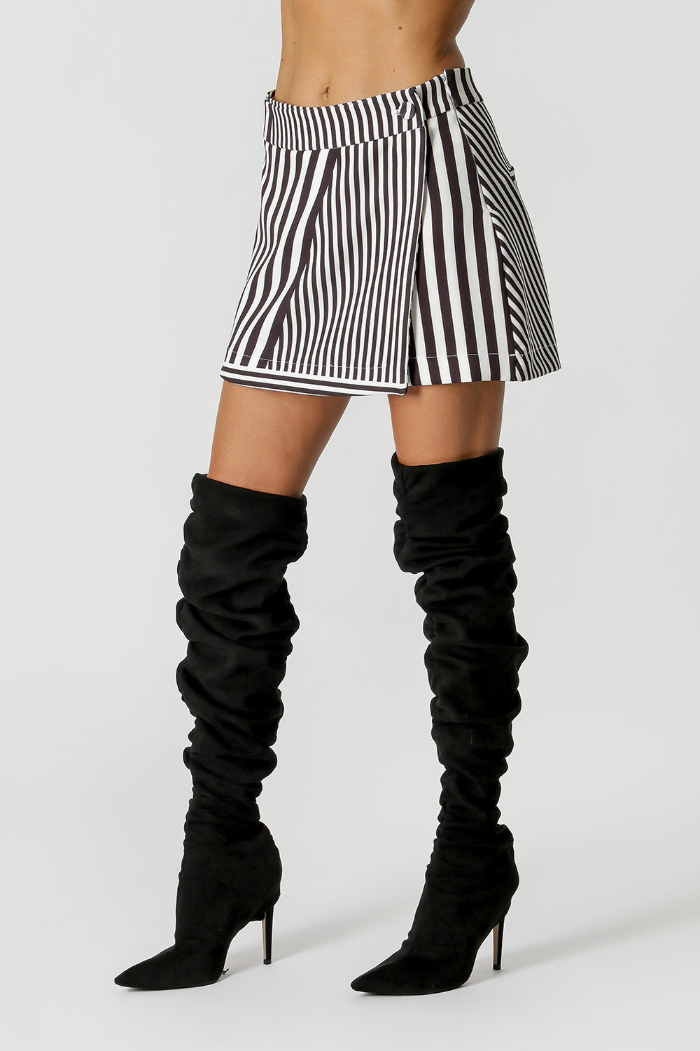 Falda corta confeccionada en sastrería estampada, con cierre de botón y cremallera. Pieza moderna y femenina perfecta para esta temporada.