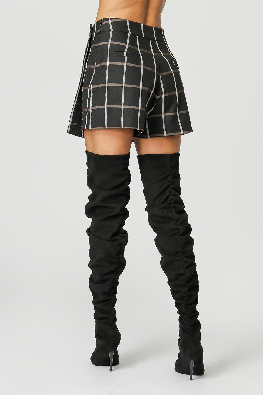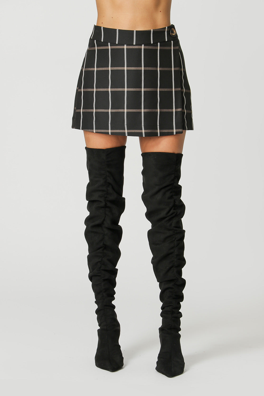 Falda corta confeccionada en cuadros, con cierre de botón y cremallera. Pieza moderna y elegante.