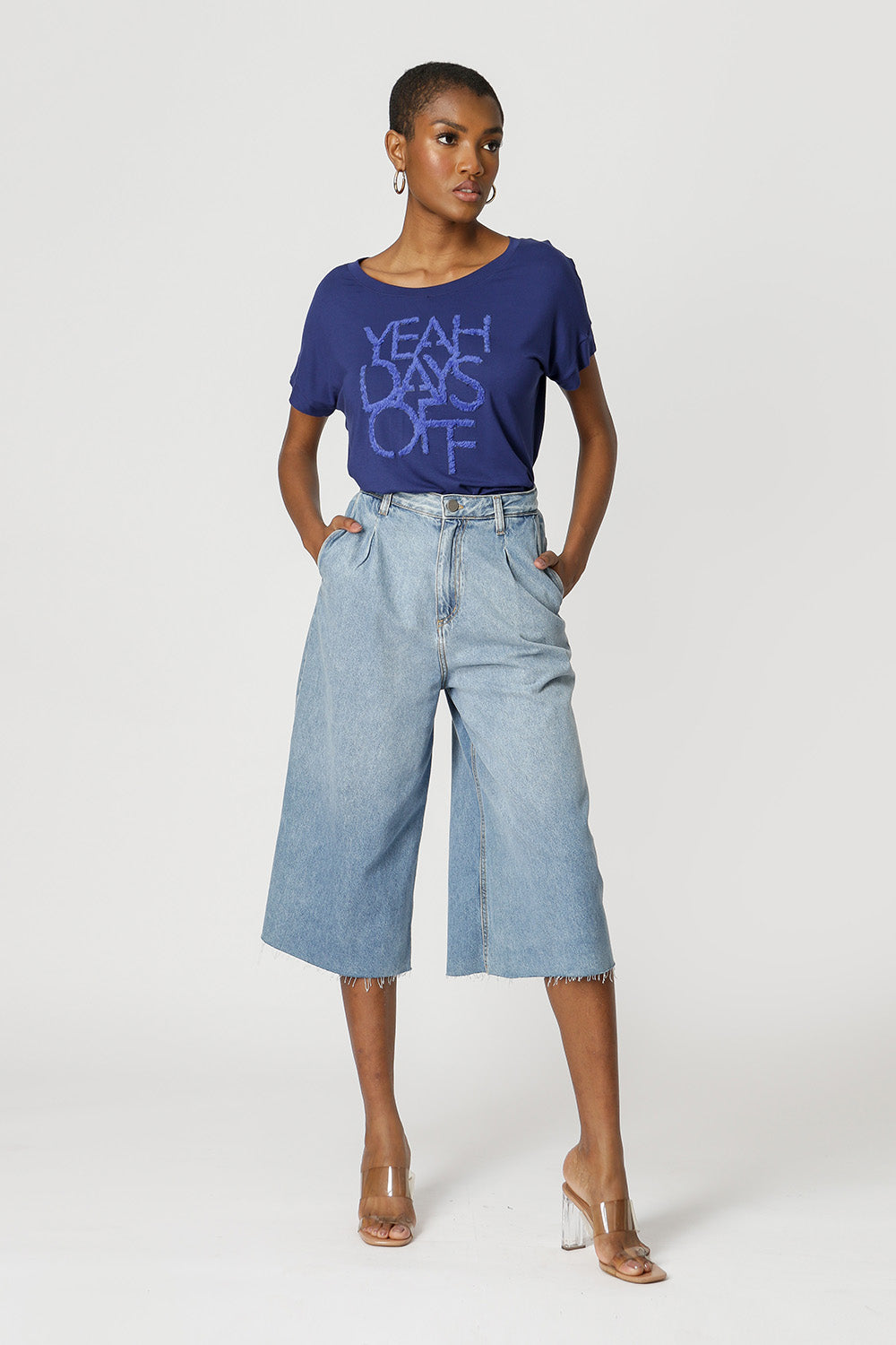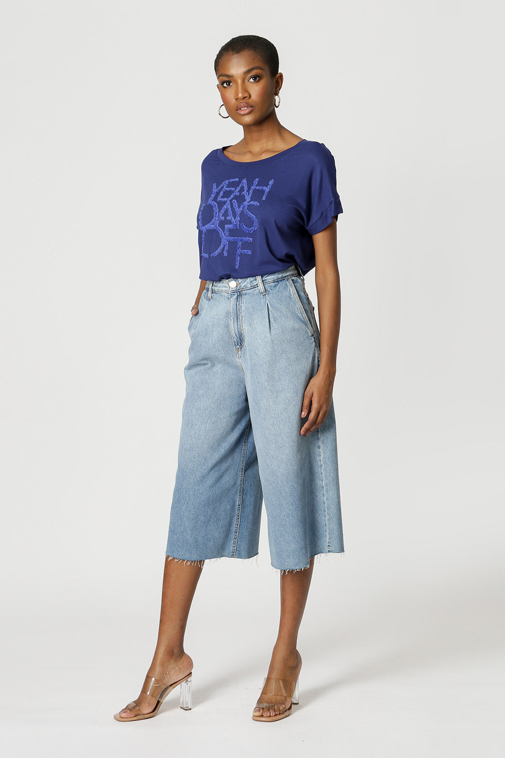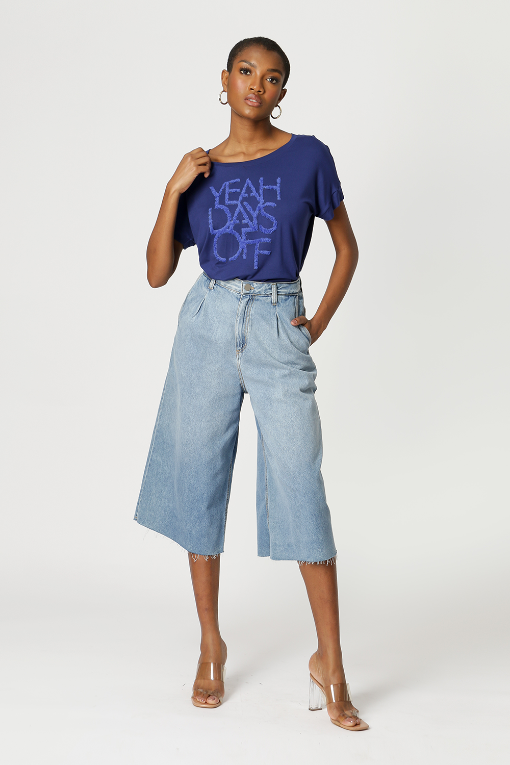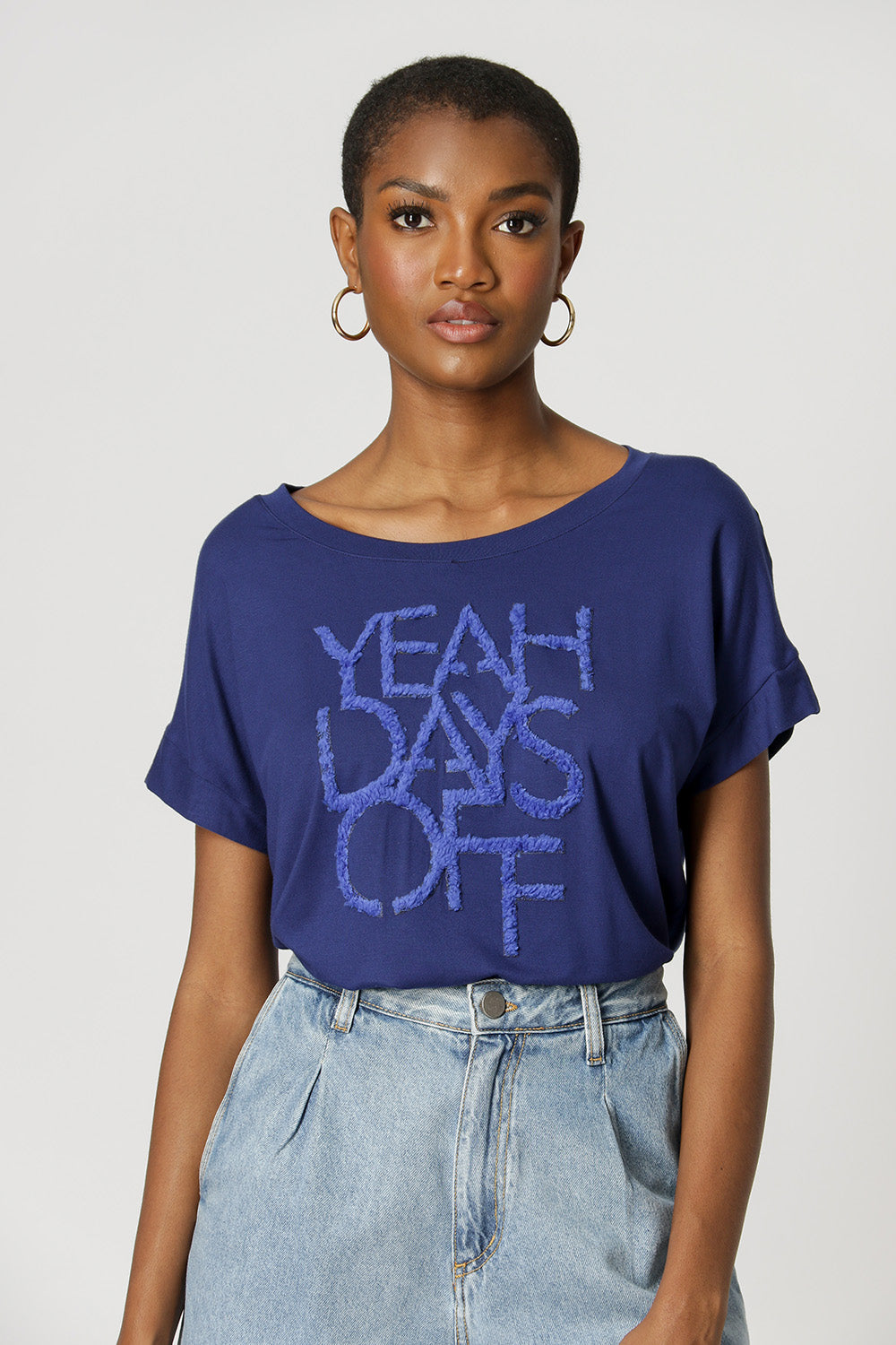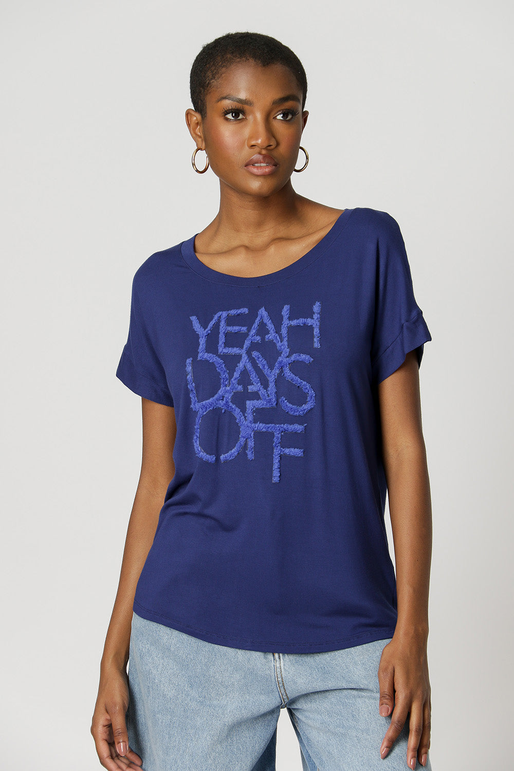 Camiseta con aplicación flocada, confeccionada en tejido fluido, largo largo. Ideal para looks casuales y relajados.