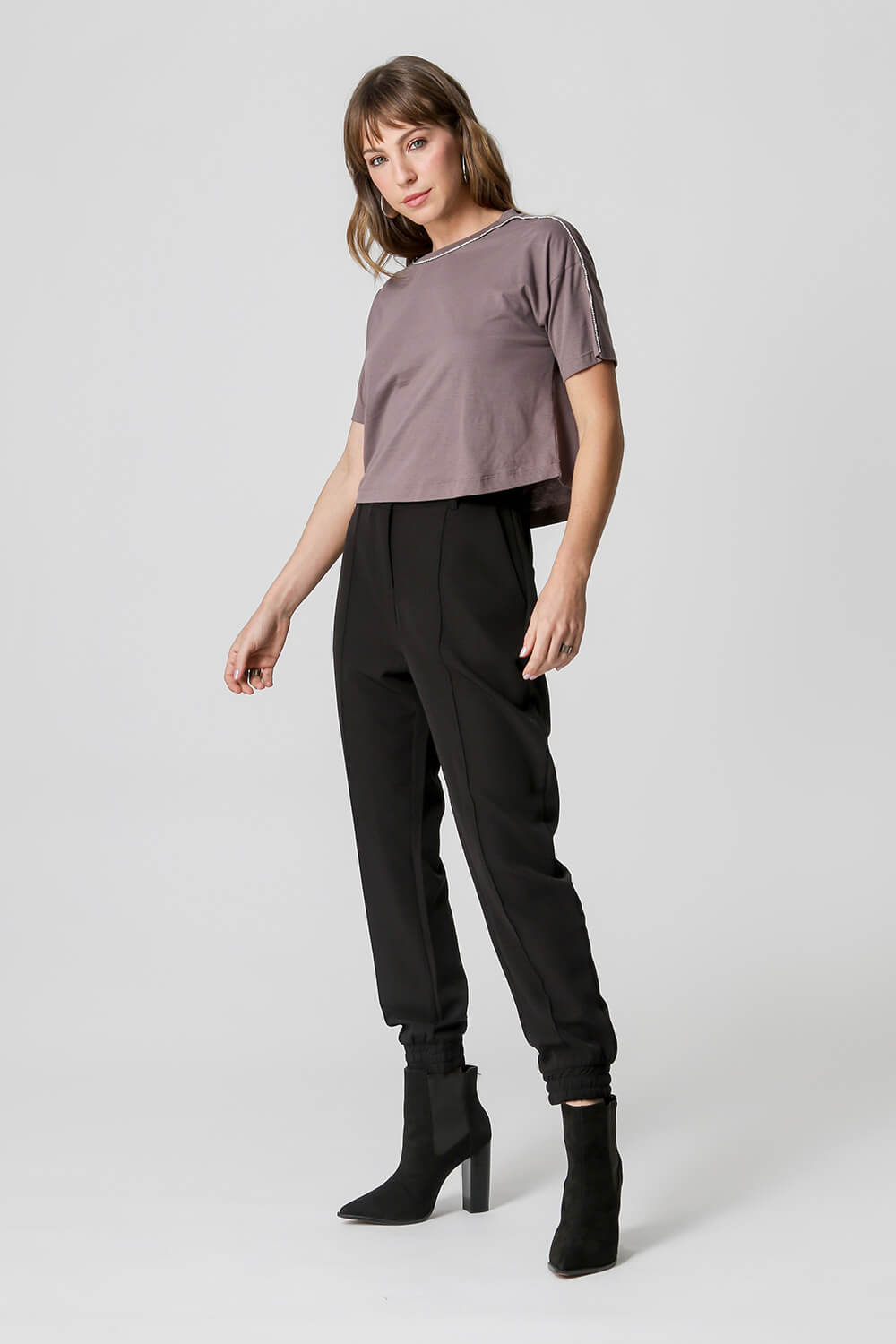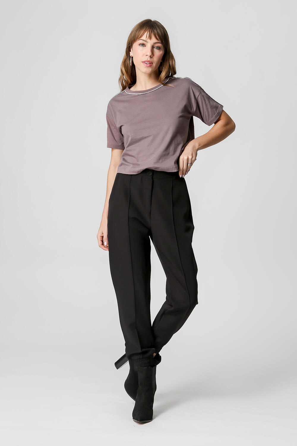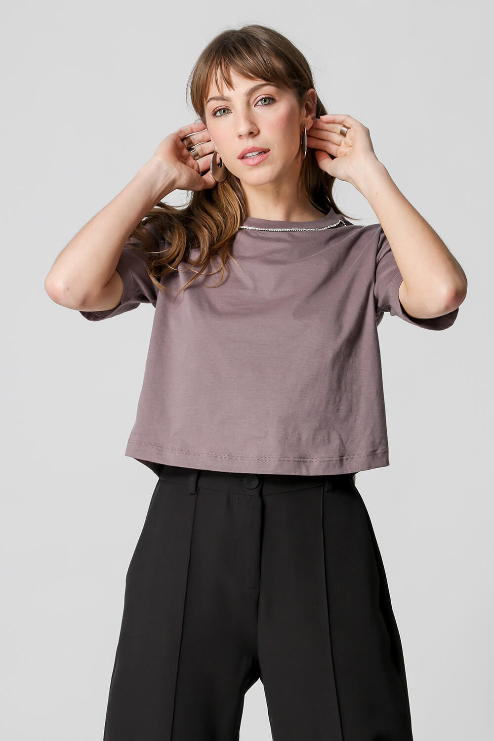 Camiseta con pedrería en el hombro. Hermosa pieza que se puede usar con piezas de sastrería, creando un look casual.
