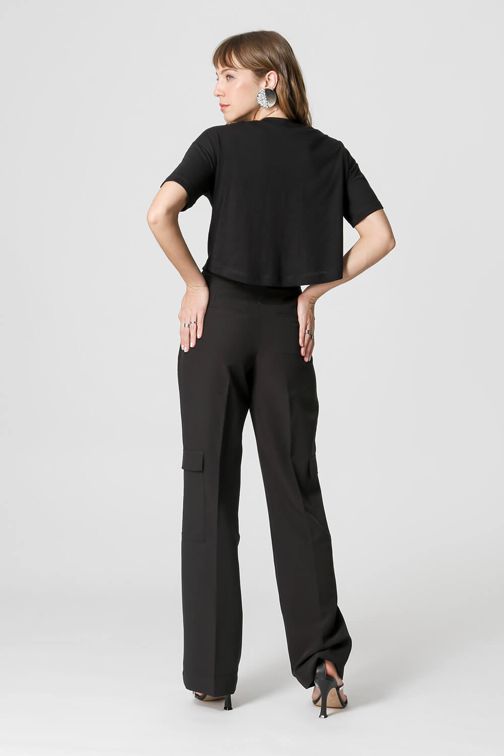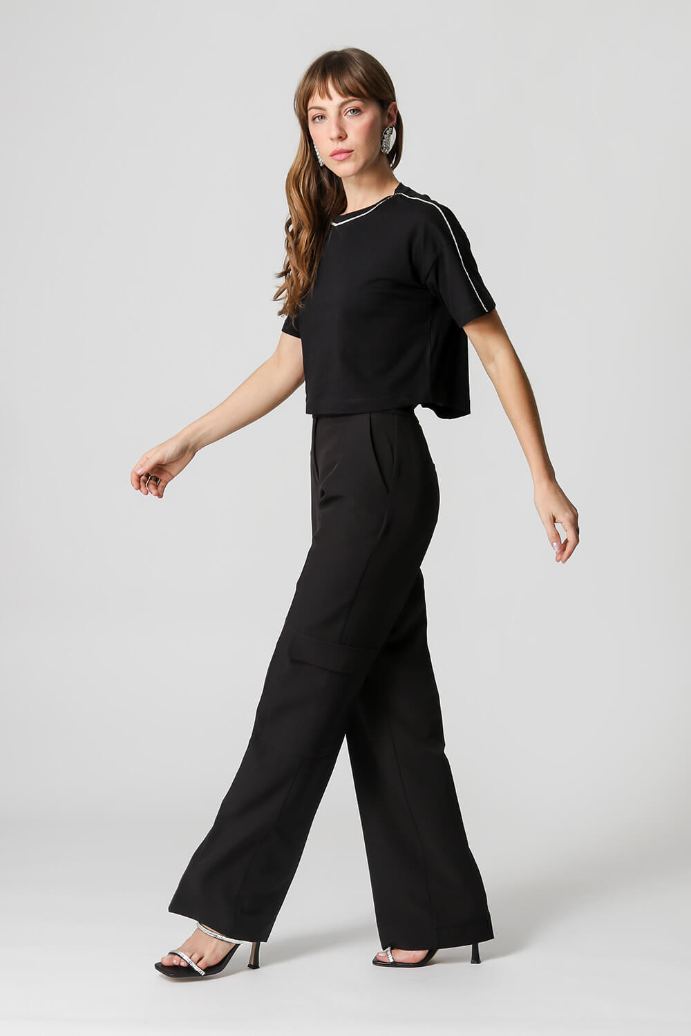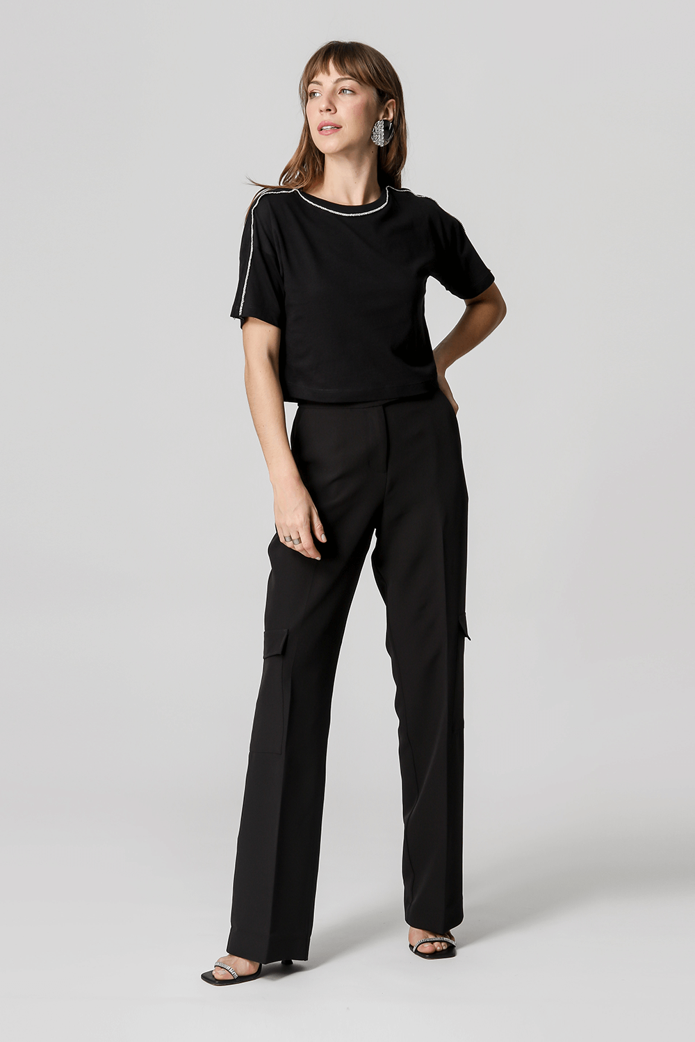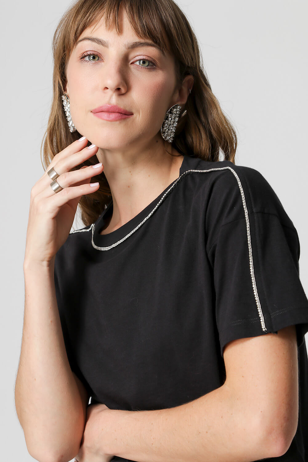 Camiseta con pedrería en el hombro. Hermosa pieza que se puede usar con piezas de sastrería, creando un look casual.