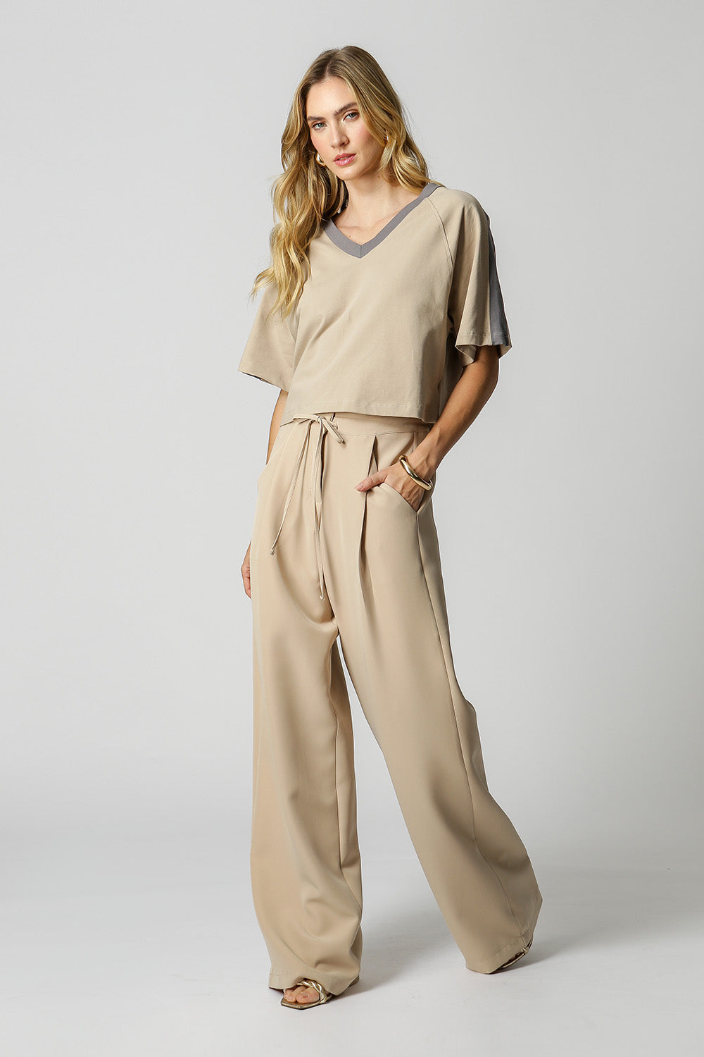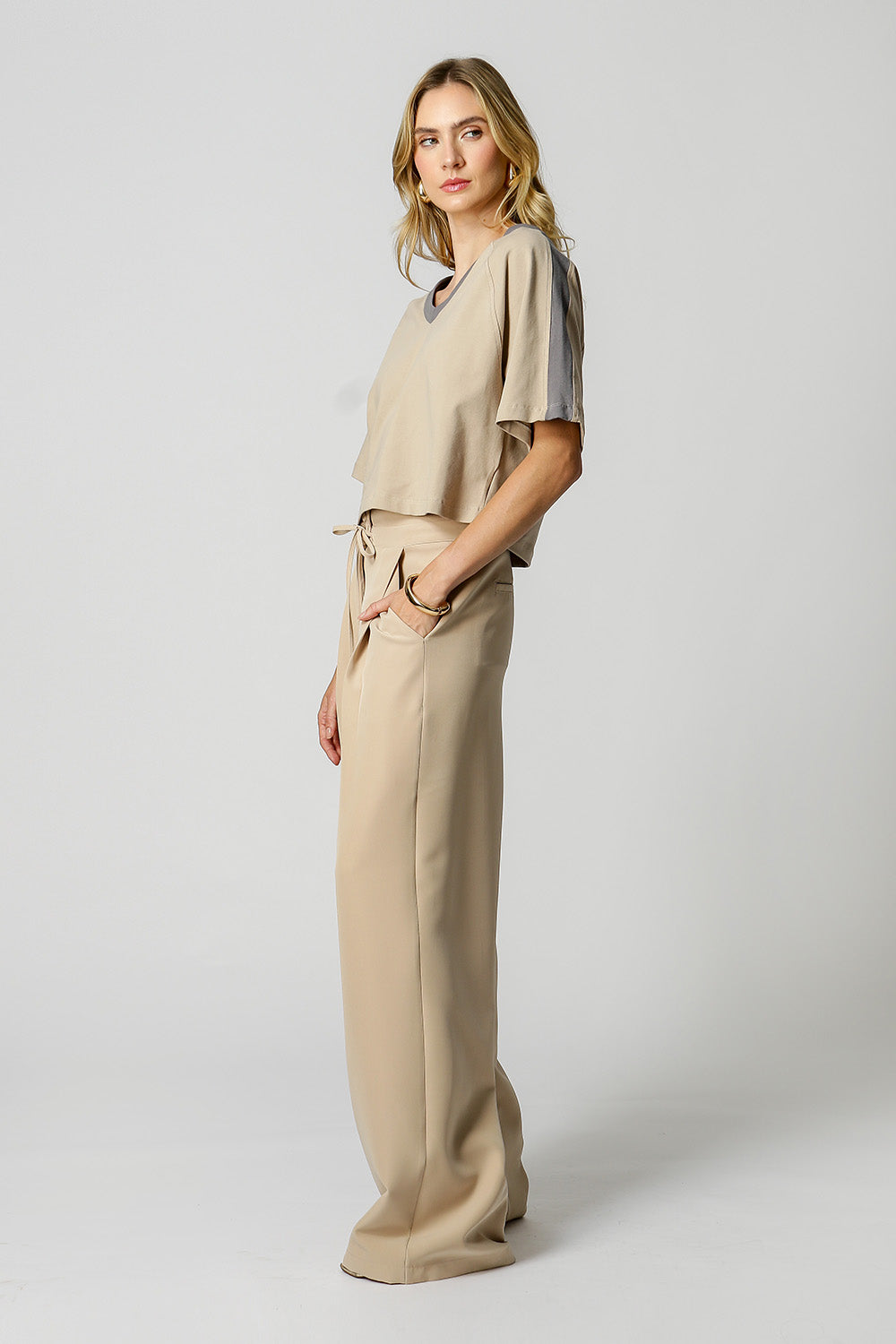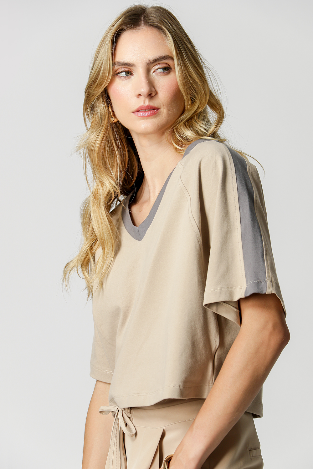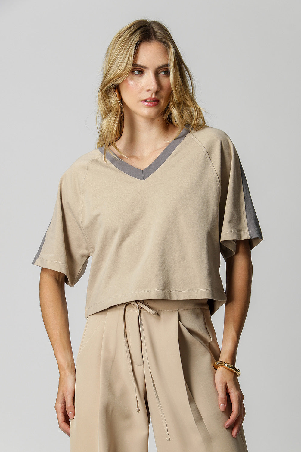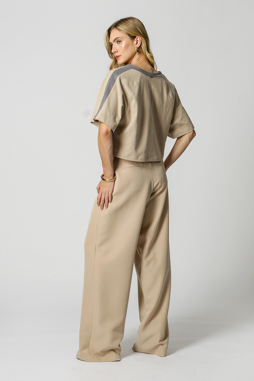 Detalle de hombro en contraste y ajuste relajado.