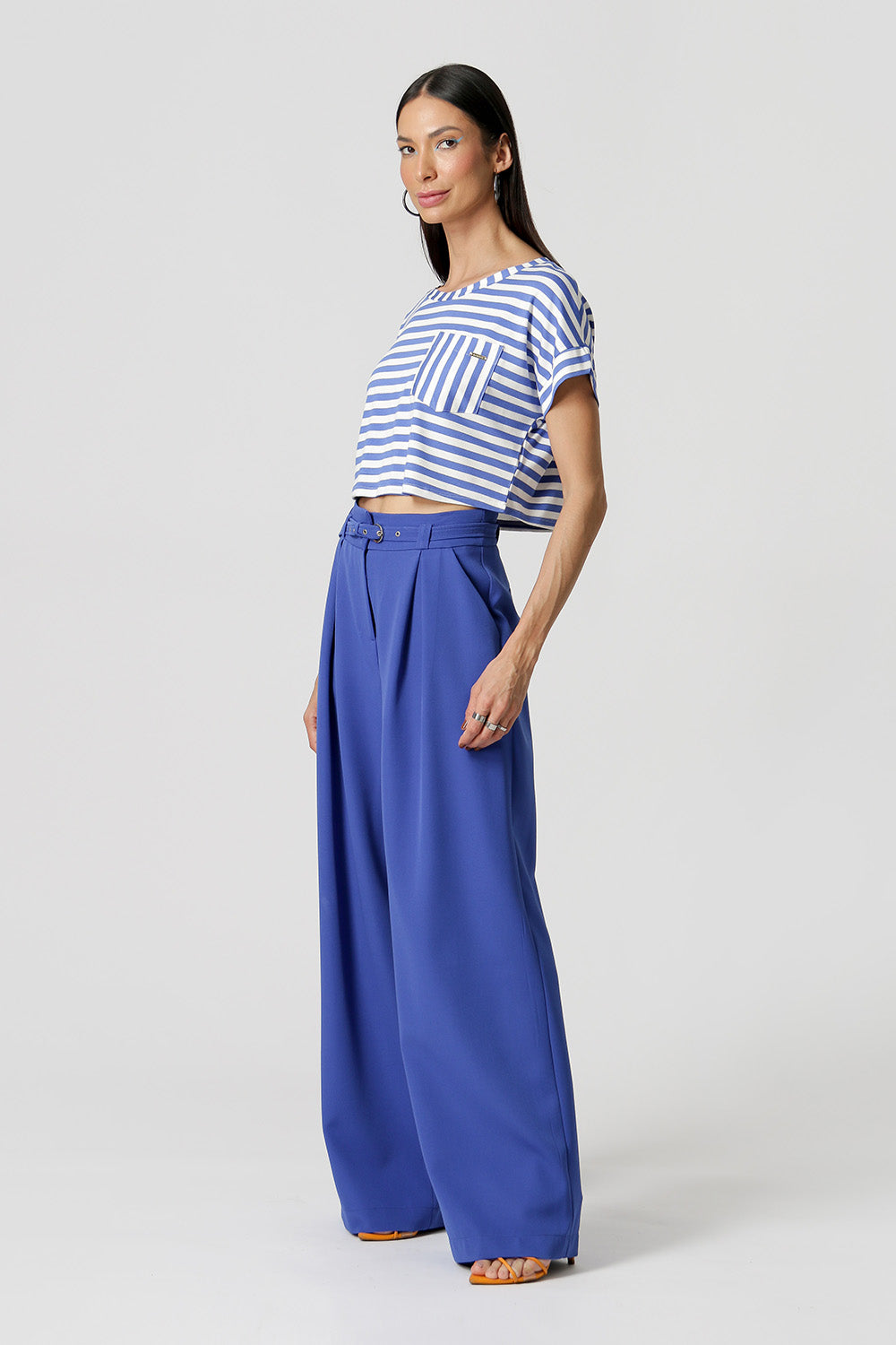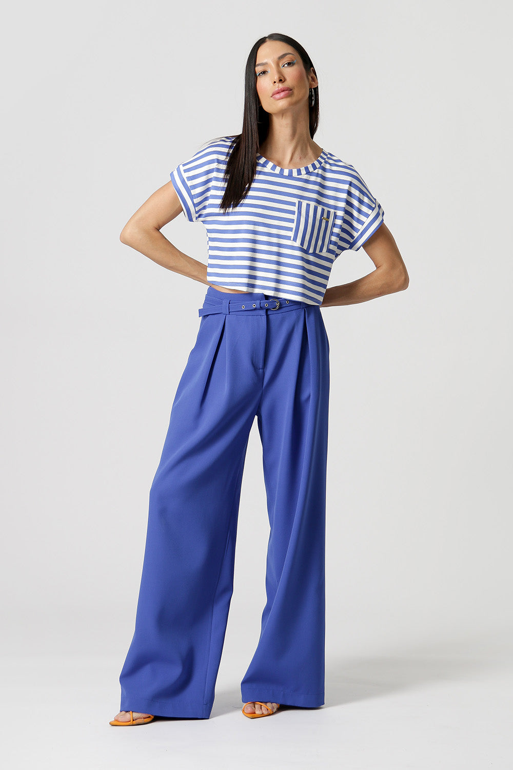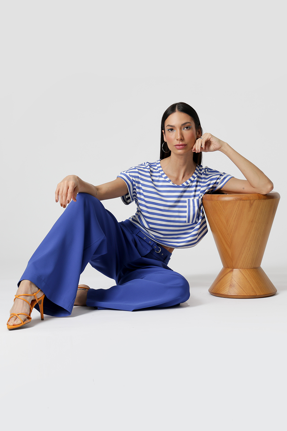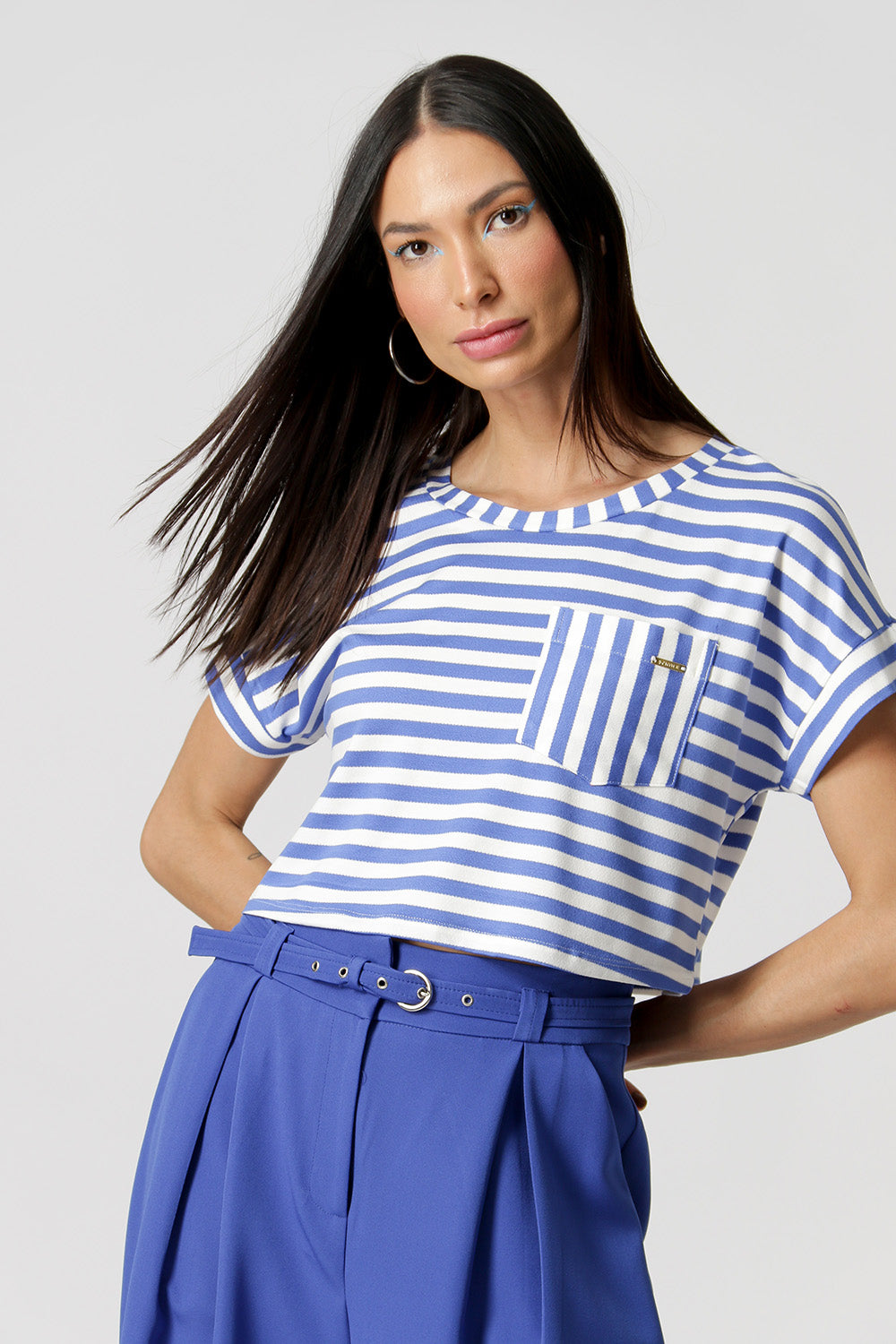 Camiseta cropped con bolsillo frontal confeccionada en tejido de rayas, una pieza casual súper práctica y cómoda.