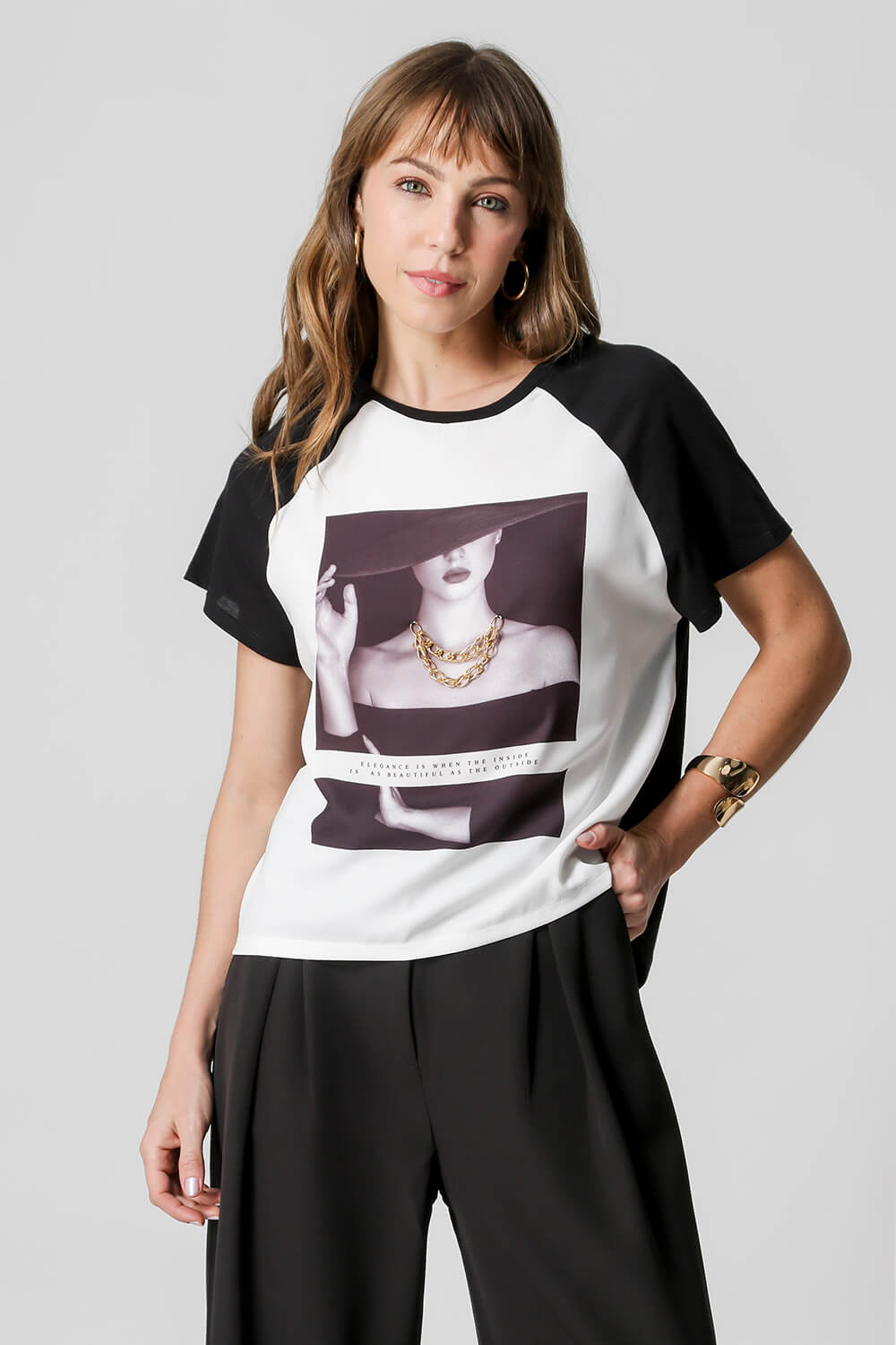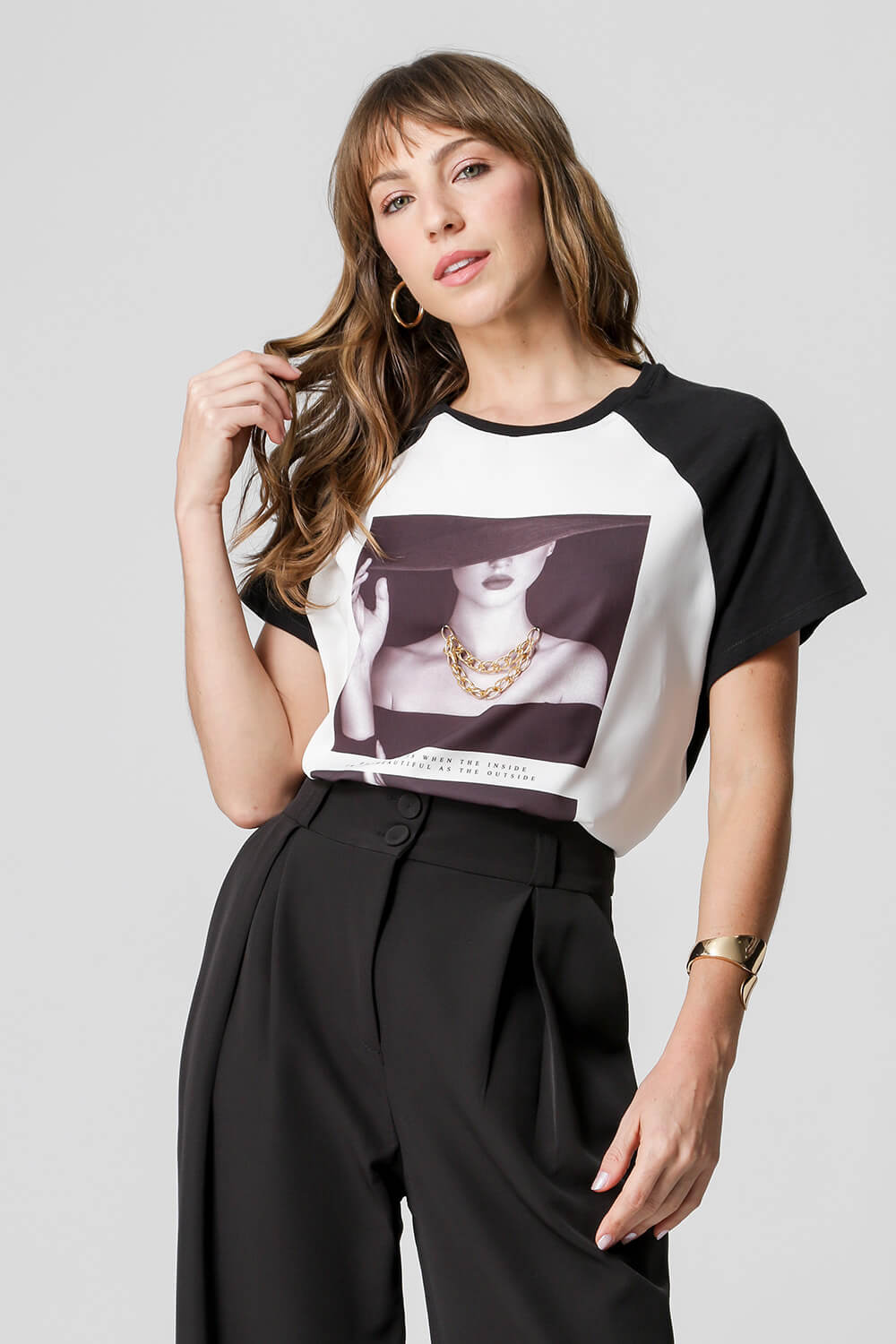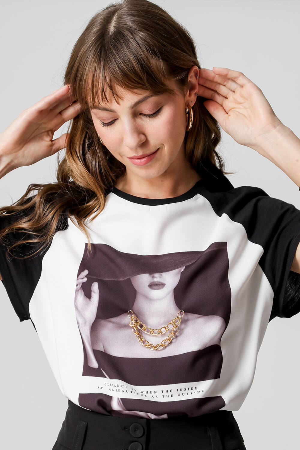 Camiseta de Manga Corta, con mezcla de tejidos, la parte delantera es en tejido twill crepe y la manga y espalda en malla ultrafina para mayor comodidad y buen ajuste. Ideal para looks casuales y relajados.