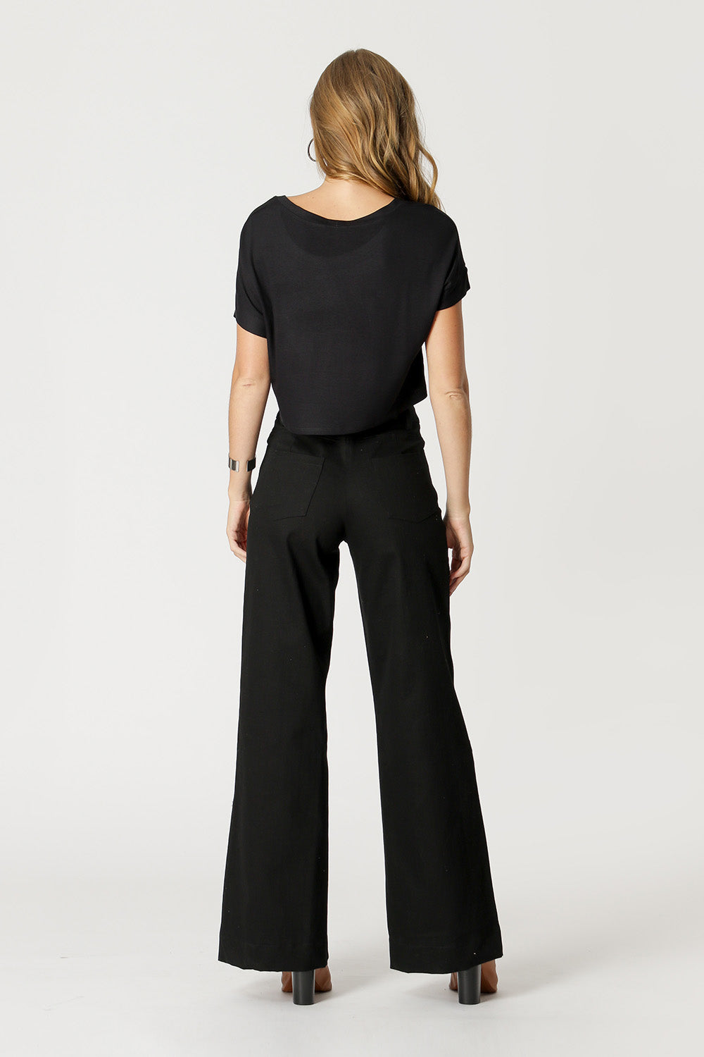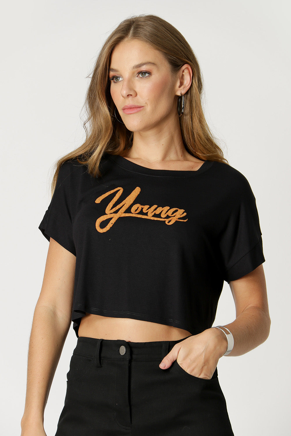Camiseta con aplicación de camuflaje en la parte delantera, confeccionada en punto max, largo cropped. Hermosa pieza que se puede usar con piezas de sastrería, creando un look casual.