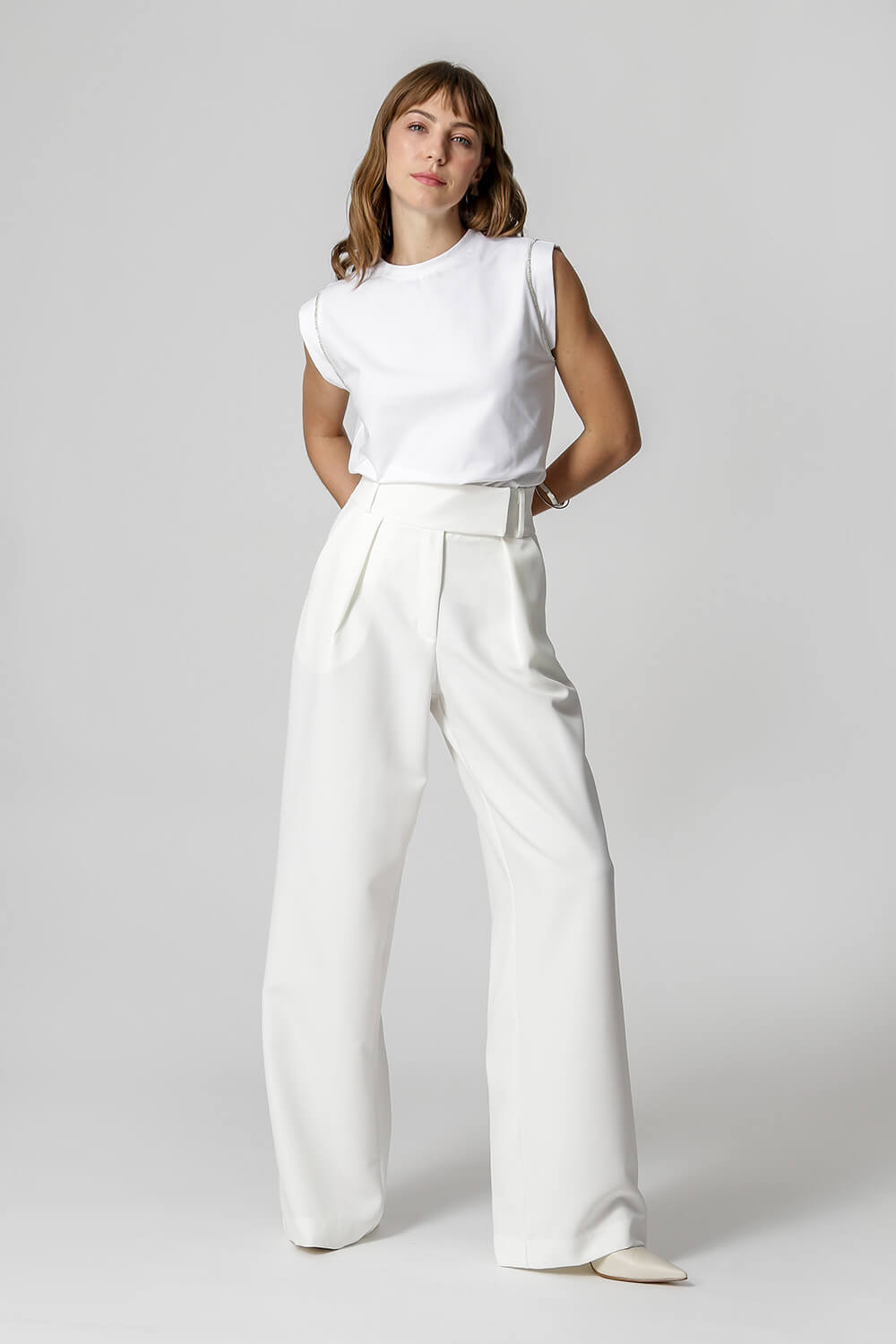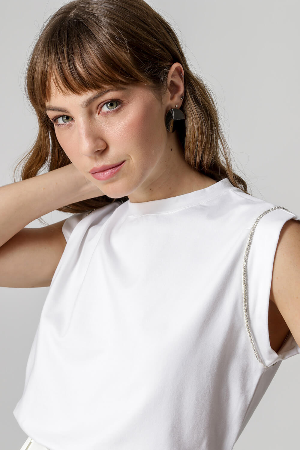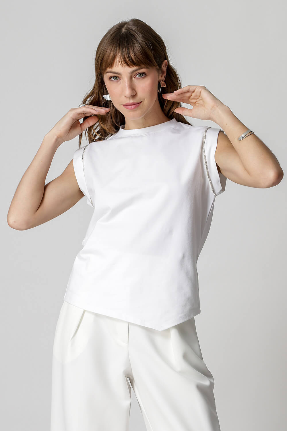 Camiseta con aplicación de pedrería. Hermosa pieza que puede usarse con trajes de sastre, entre otros, creando un look casual.