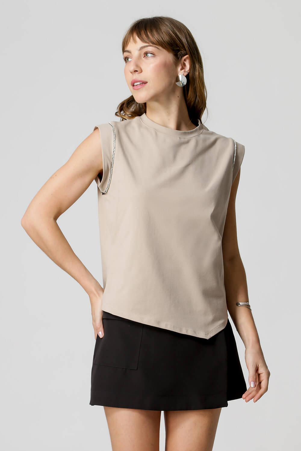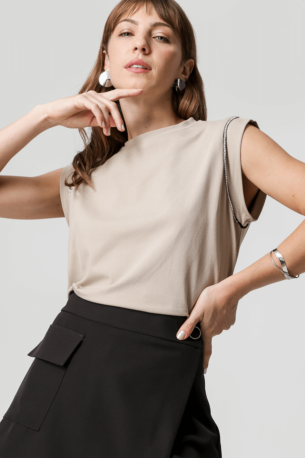 Camiseta con aplicación de pedrería. Hermosa pieza que puede usarse con trajes de sastre, entre otros, creando un look casual.