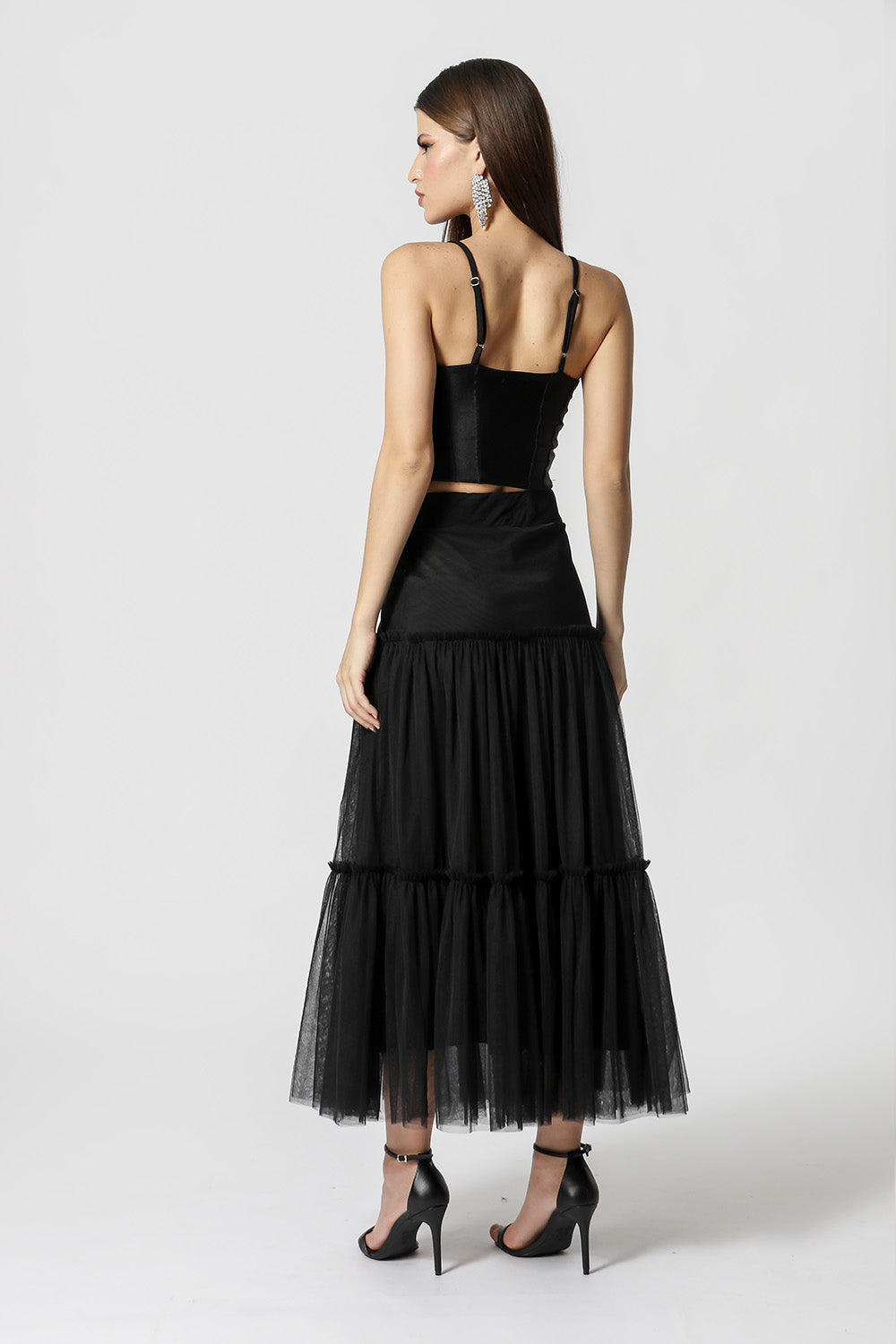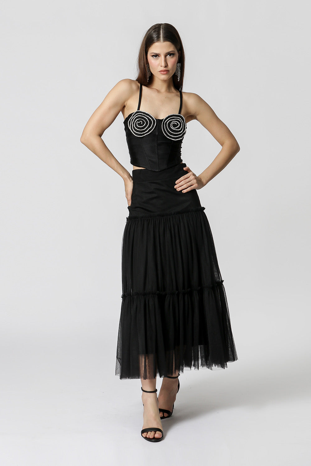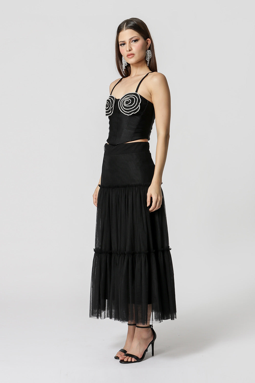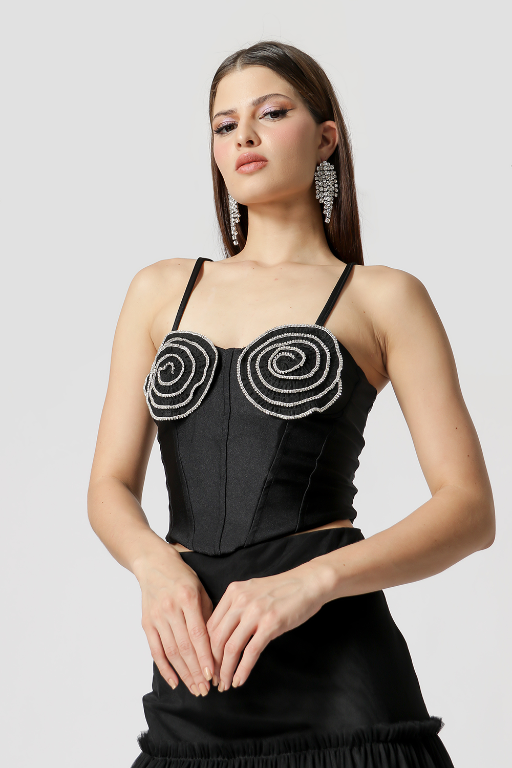 Top corsé con detalle de flor de pedrería en el busto y tirante ajustable. Fabricado en tejido de malla metálica. Una pieza con un estilo diferente, glamurosa para quienes les gusta salir de noche y rockear su look.