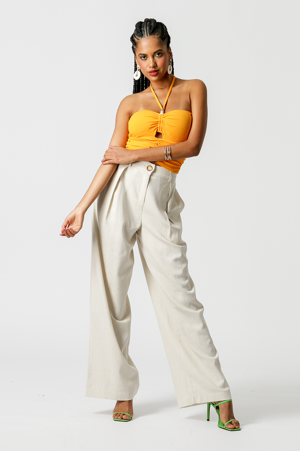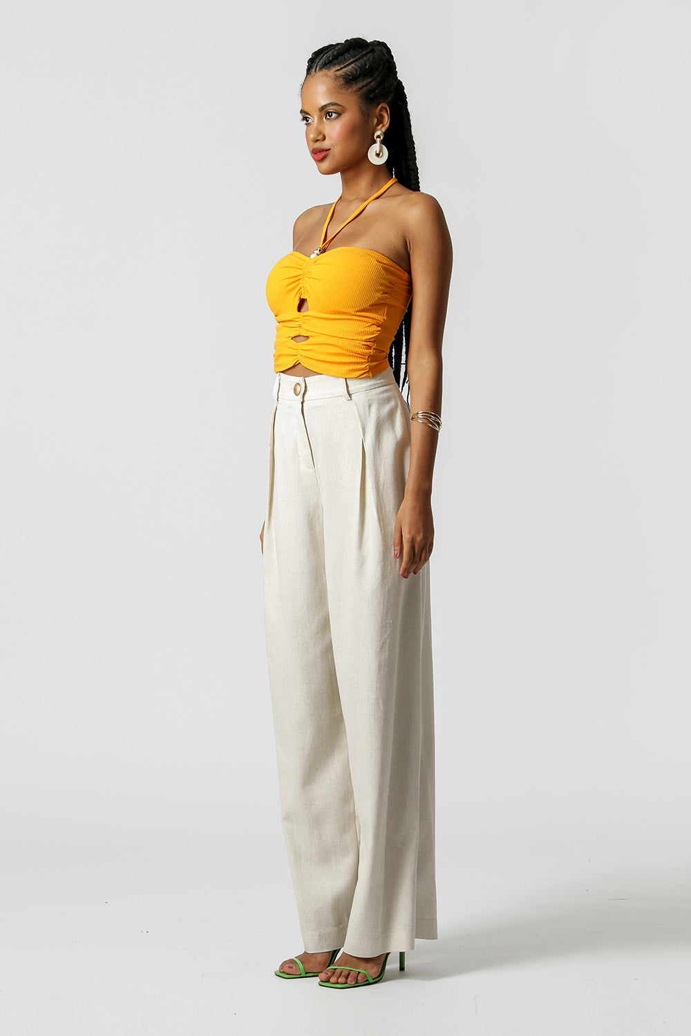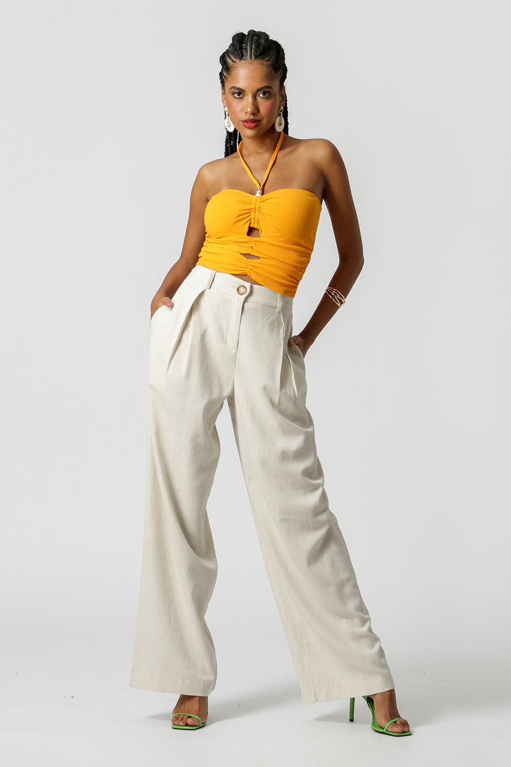 Top corto de corte ajustado al cuerpo, confeccionado en punto canalé. Modelo todo fruncido, con cortes, tirantes finos con detalles en los tirantes y lleva copa. Pieza de tendencia que le dará un toque diferente a tu look de verano.