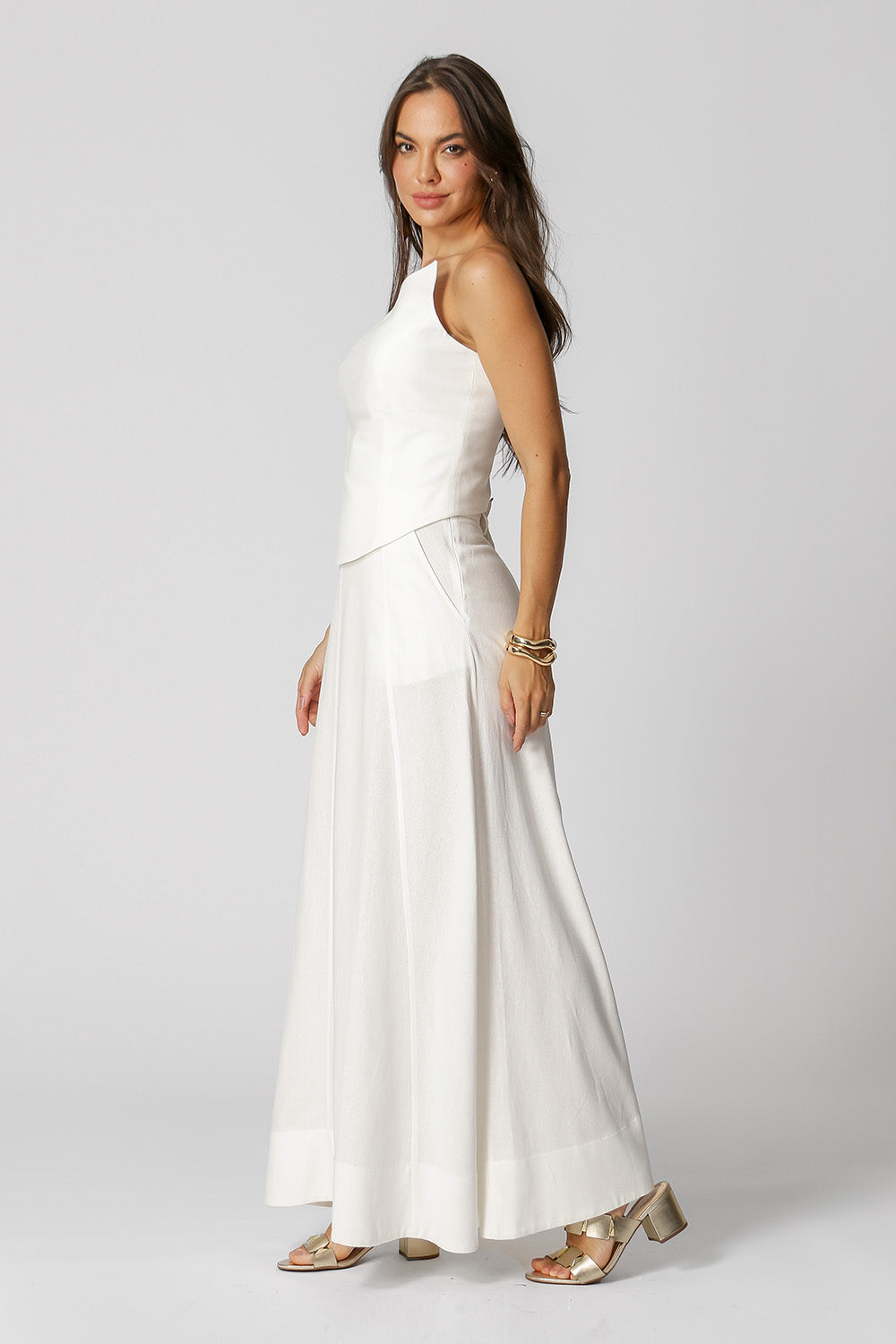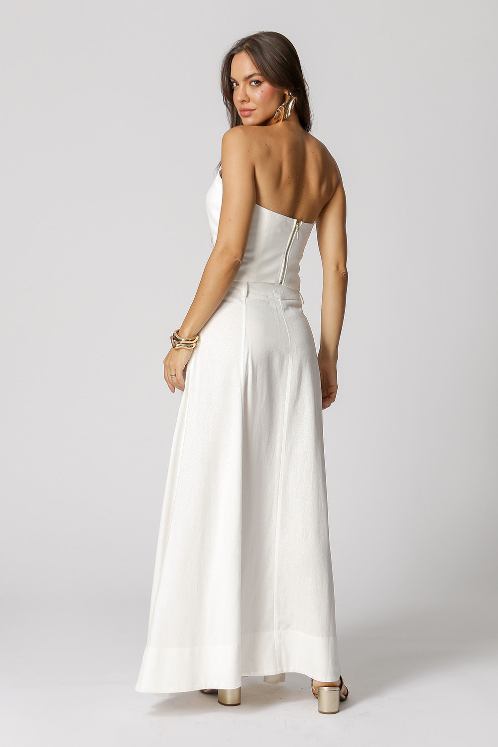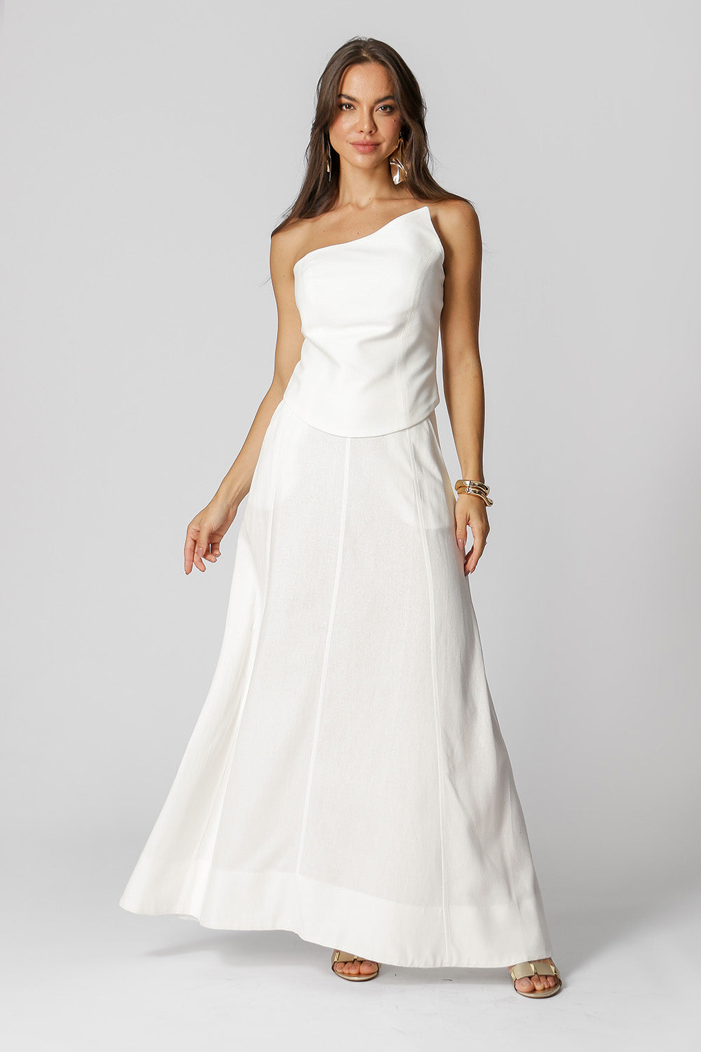 Top asimétrico sin tirantes y con cremallera en la espalda. Pieza confeccionada en lino viscosa. Un modelo súper actualizado, perfecto para crear diversos looks de noche.