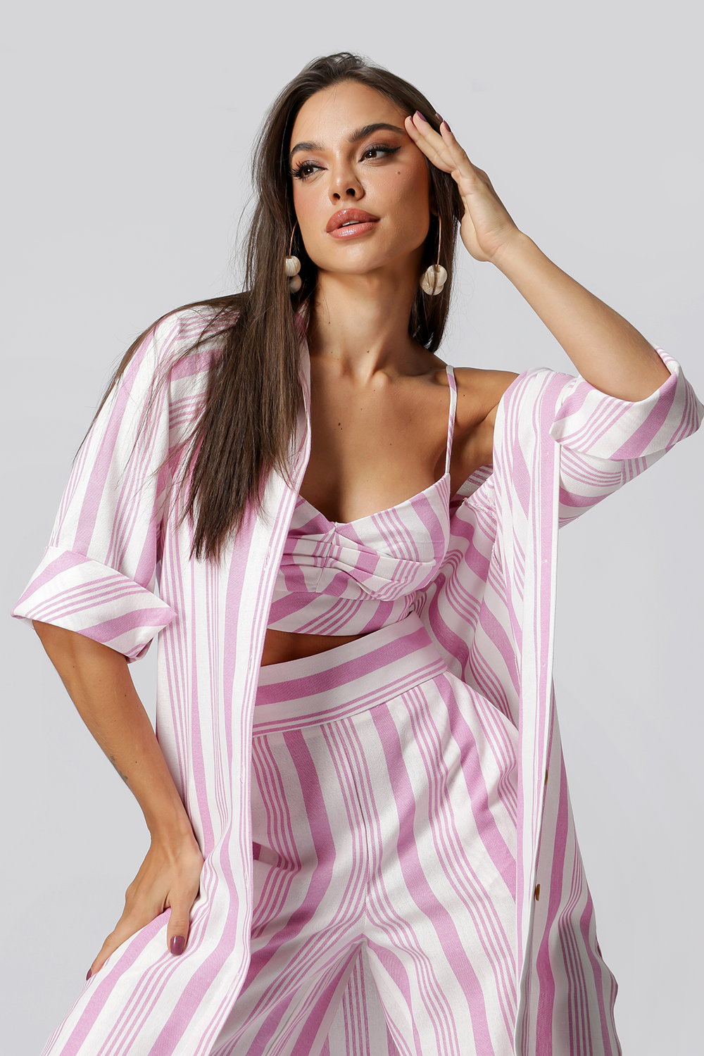 Top giratorio con tirantes ajustables y lazos en la espalda. Pieza realizada en tejido de Lino Rayado. Una pieza imprescindible en tu armario ya que es versátil y fácil de combinar con otros looks.