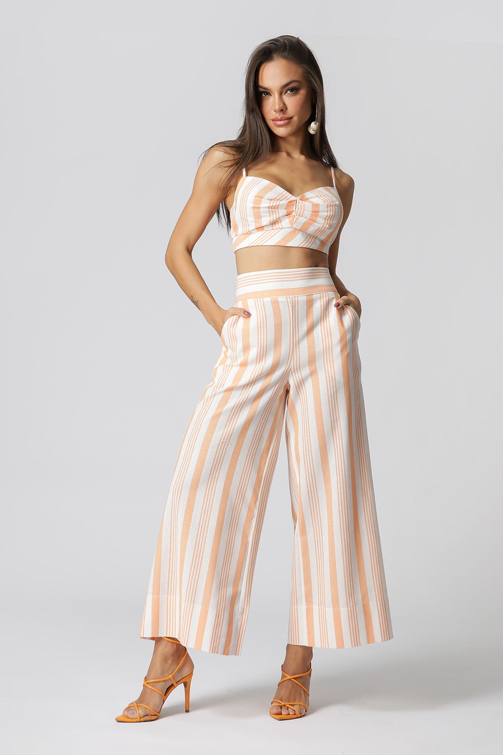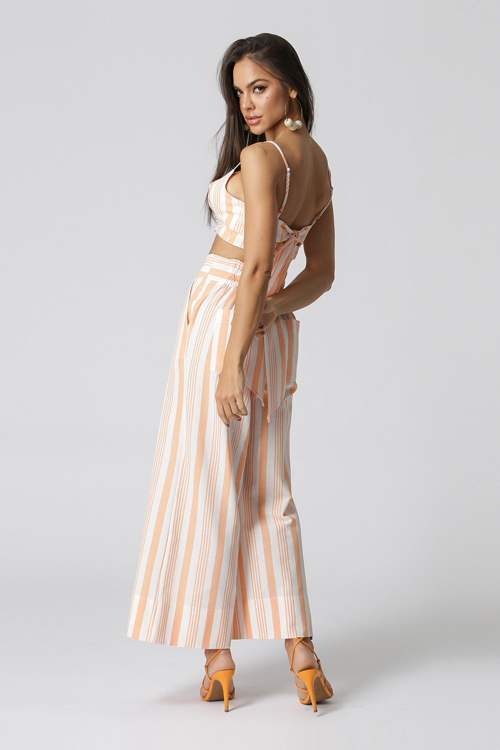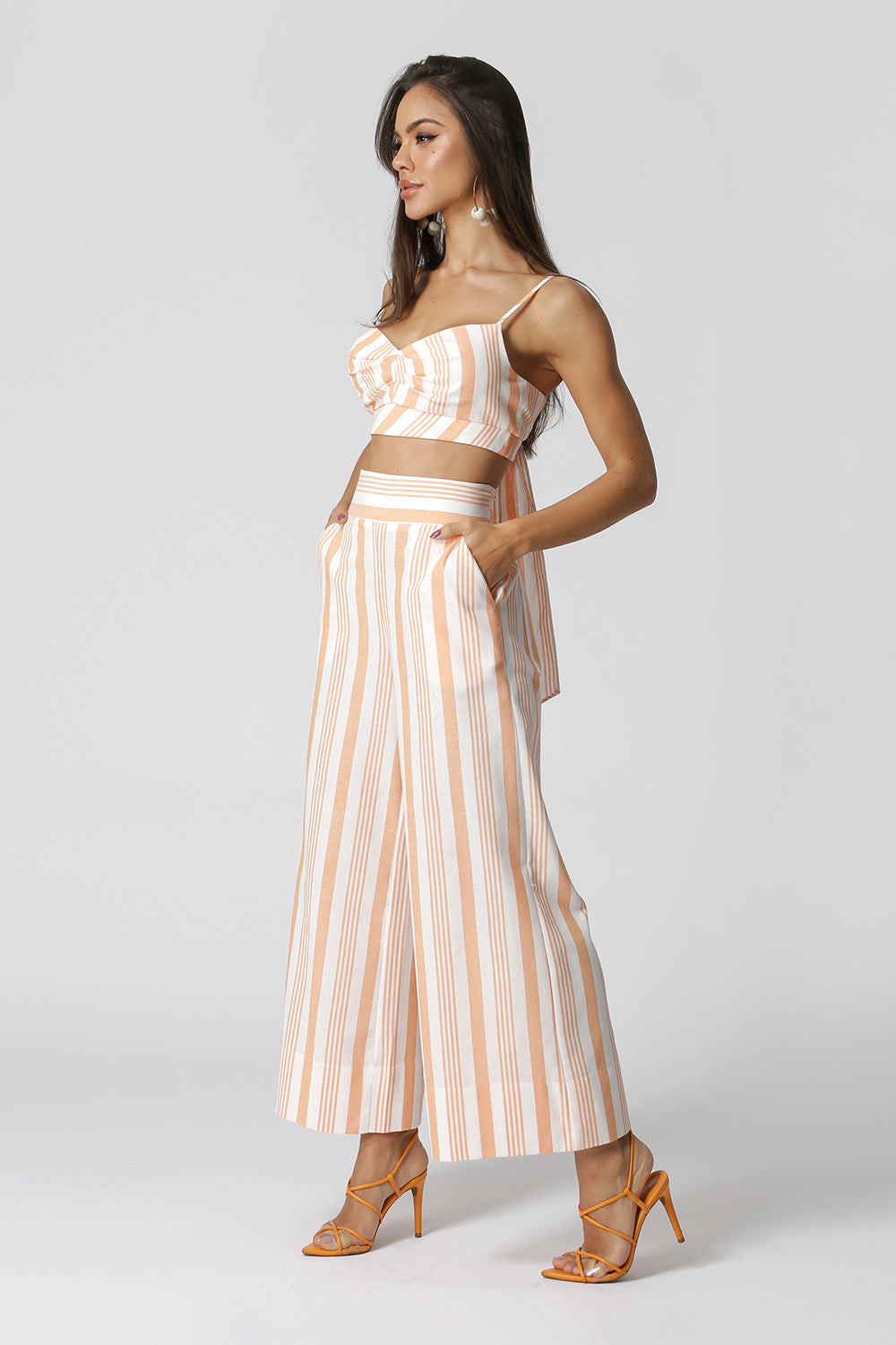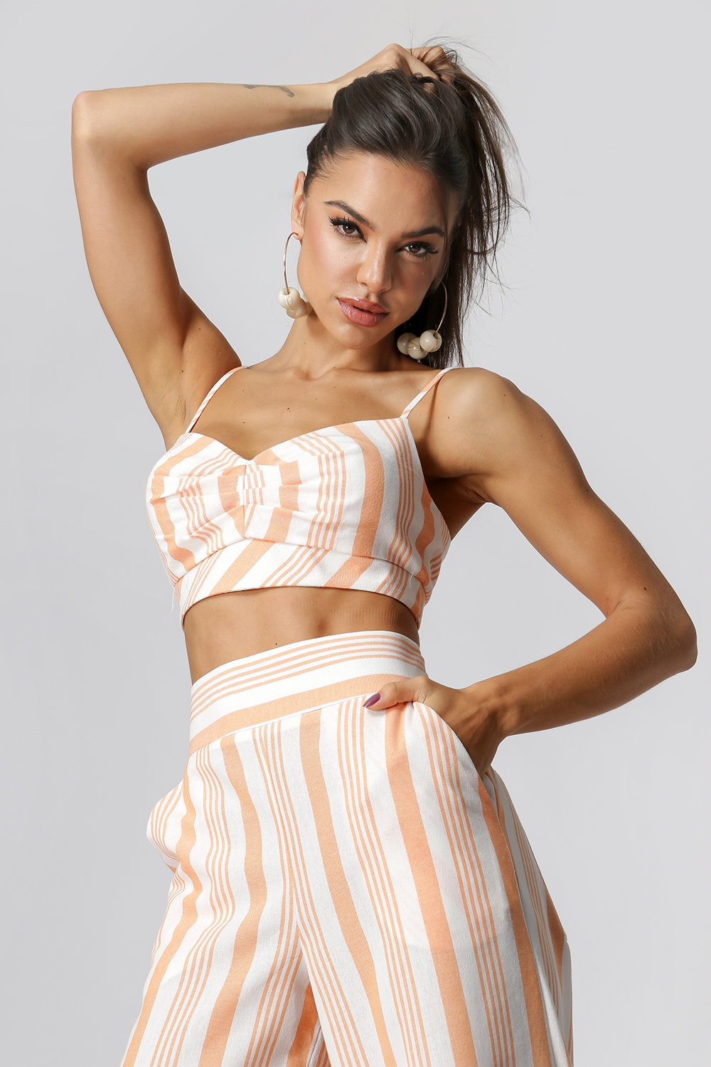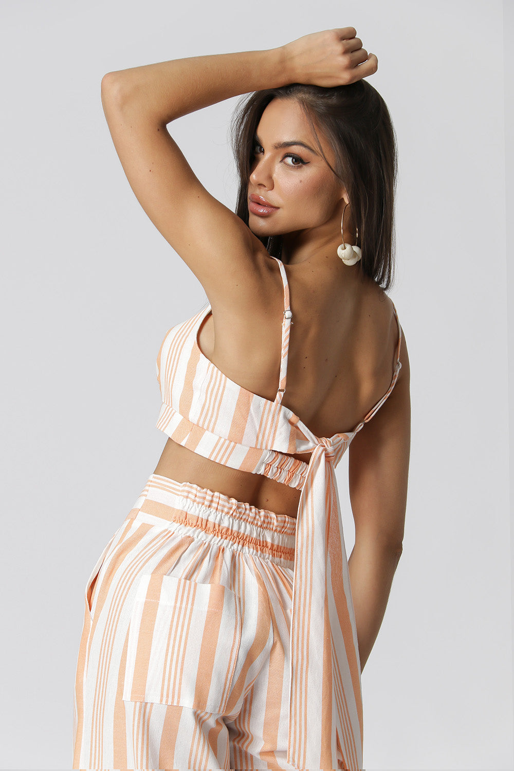 Top giratorio con tirantes ajustables y lazos en la espalda. Pieza realizada en tejido de Lino Rayado. Una pieza imprescindible en tu armario ya que es versátil y fácil de combinar con otros looks.