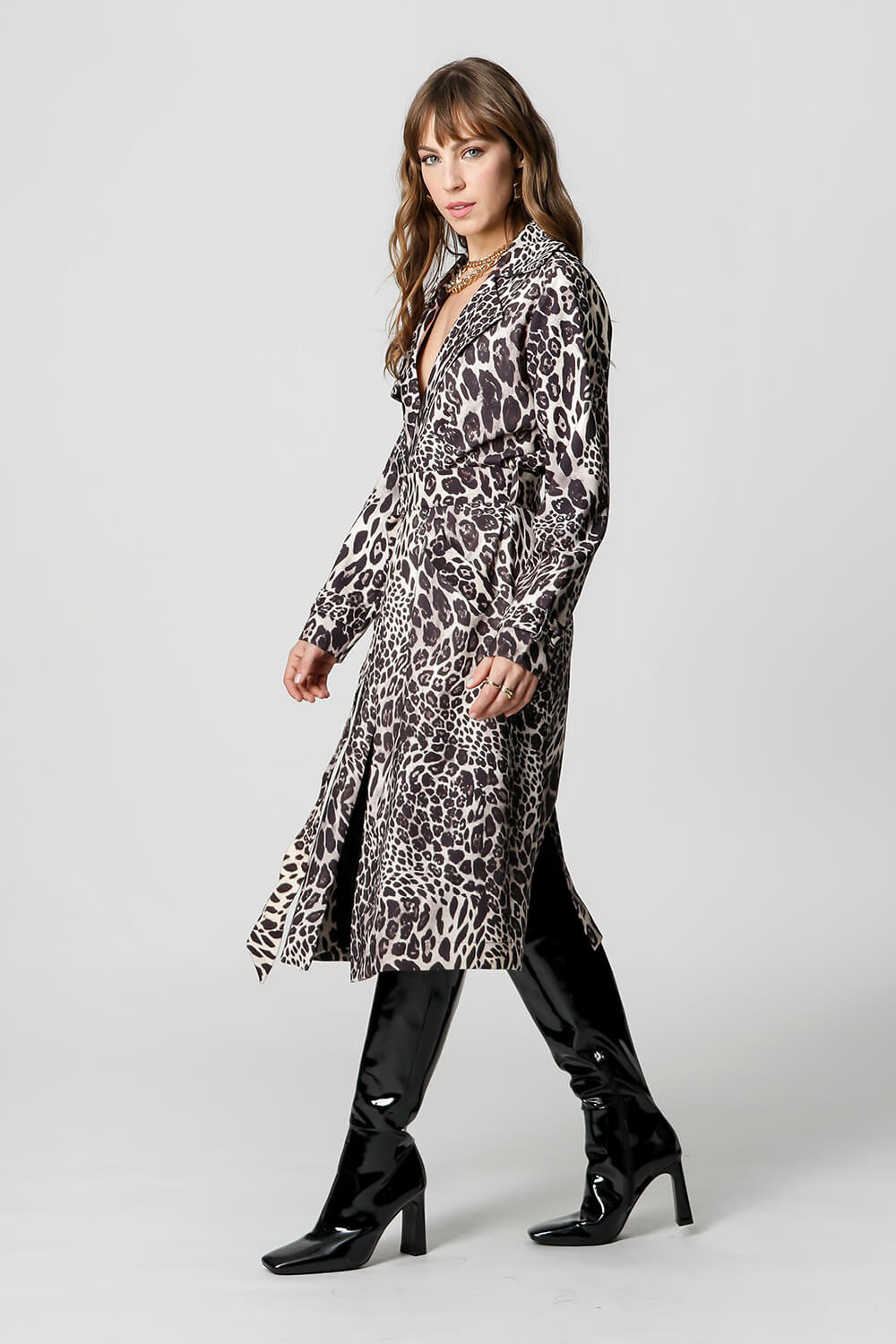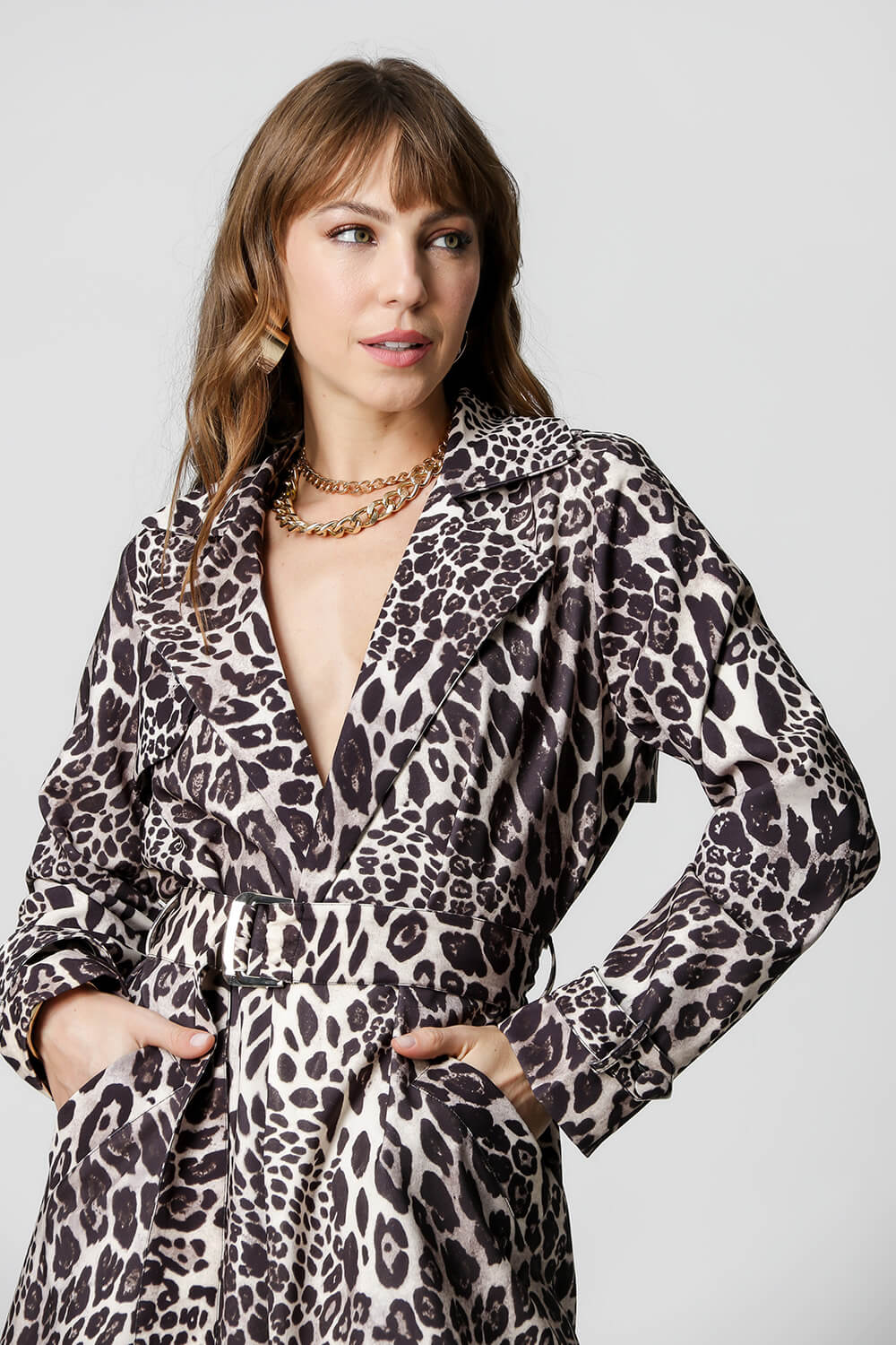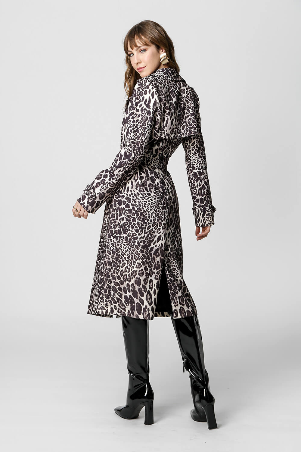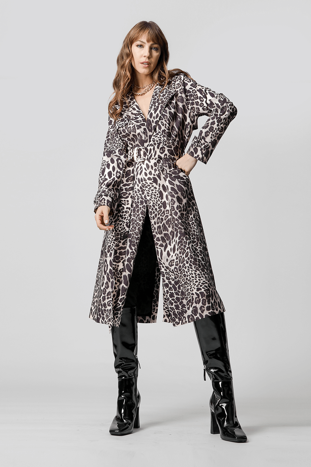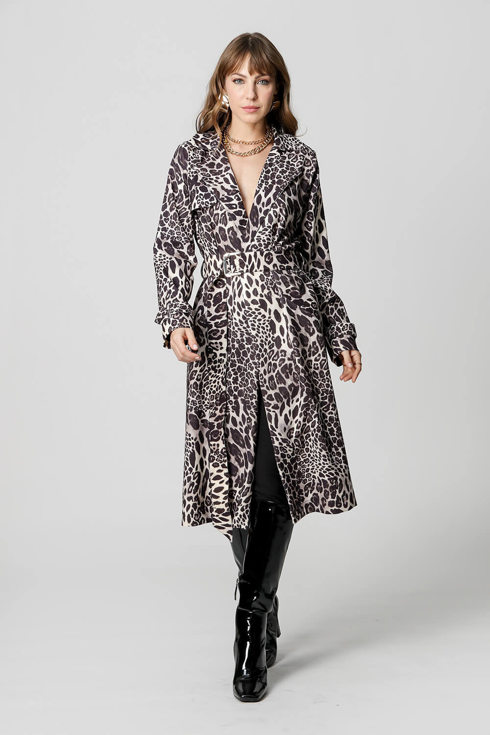 Gabardina con estampado animal, botones forrados y cinturón para atar a la cintura. Tendencia a componer varios looks, apuesta muy moderna.