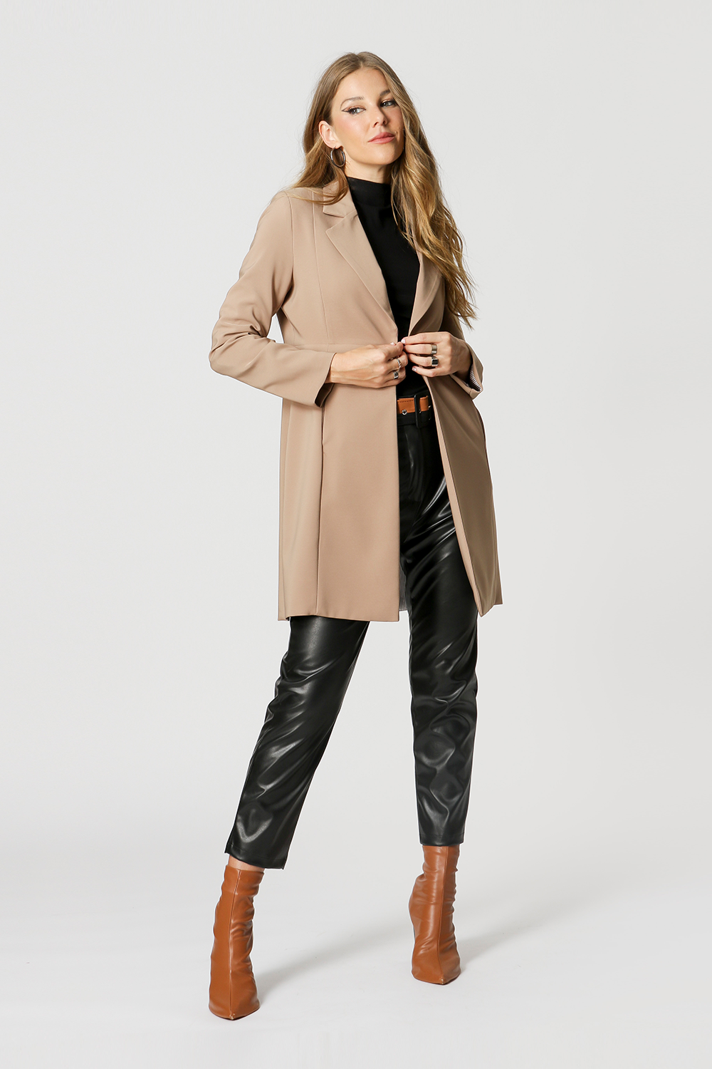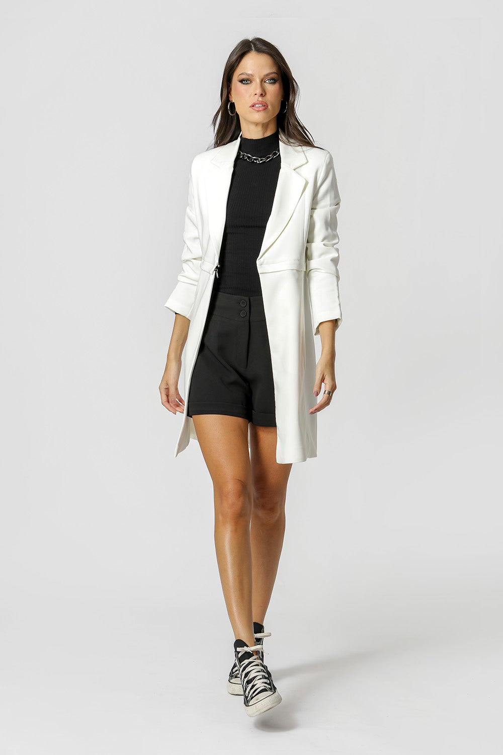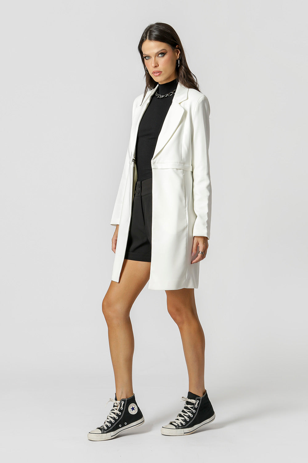 Trench coat de alfaiataria com forro diferenciado. Possui design multifuncional, com um zíper destacável podendo ser usado como trench ou como blazer cropped, um modelo 2 em 1 que multiplica suas possibilidades.