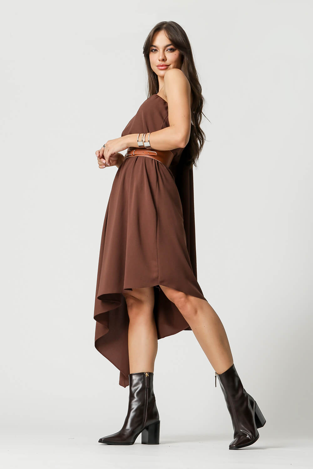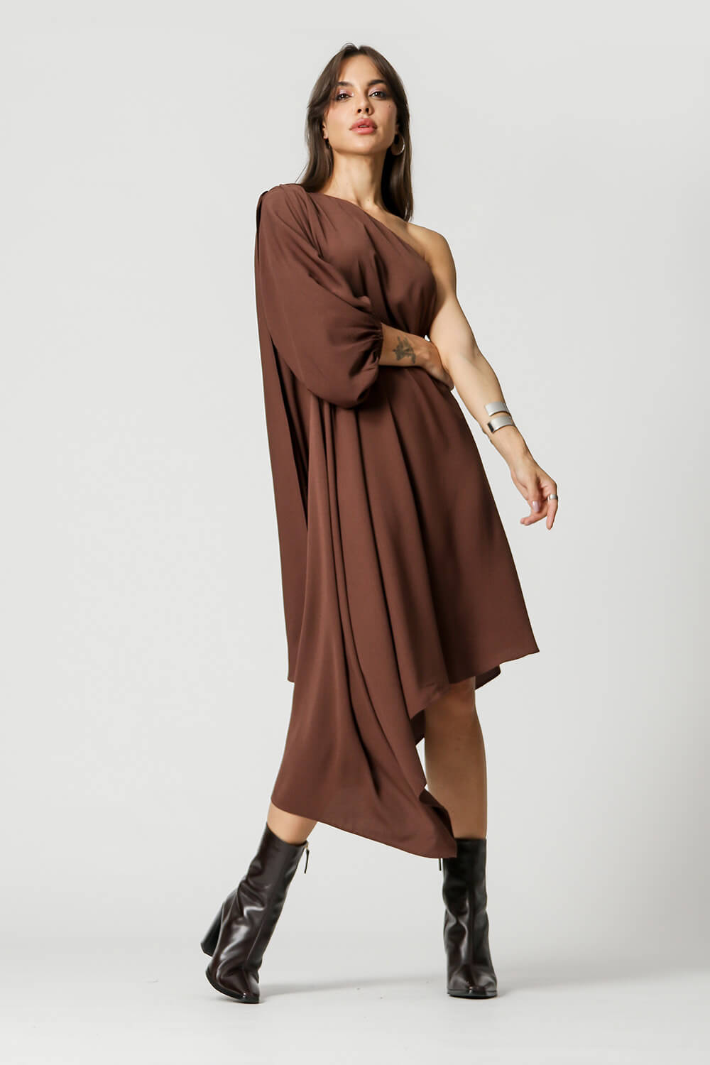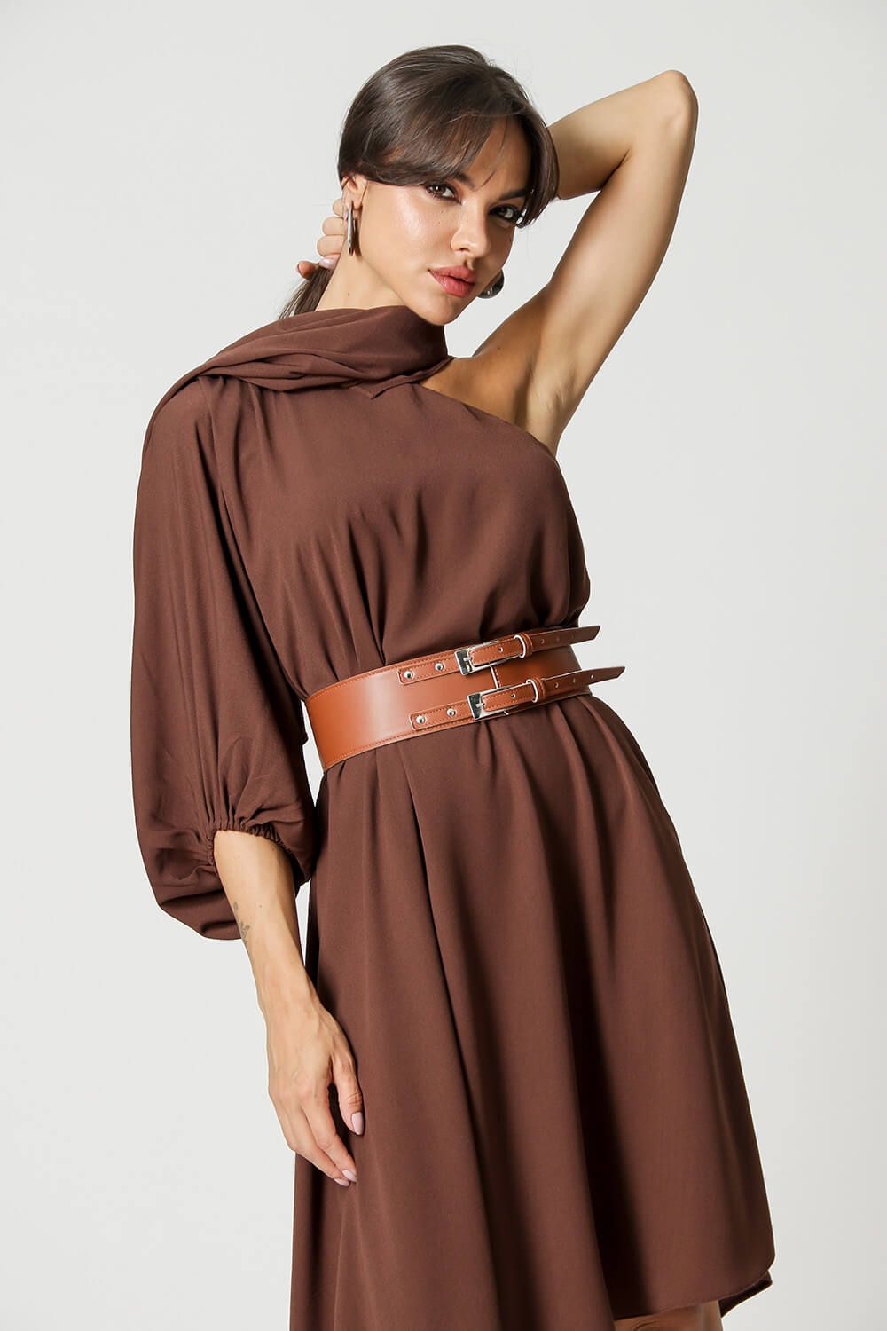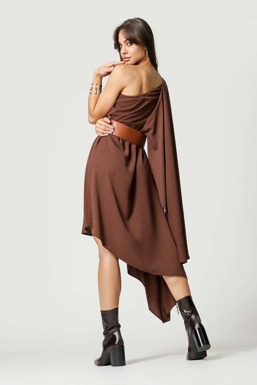 Vestido asimétrico con detalle de capa, mangas ligeramente abullonadas y cinturón con hebillas metálicas como complemento. Modelo realizado en tejido crepe de textura ligera. Es una pieza muy elegante, moderna y es perfecta para momentos casuales, apuesta por esta pieza.