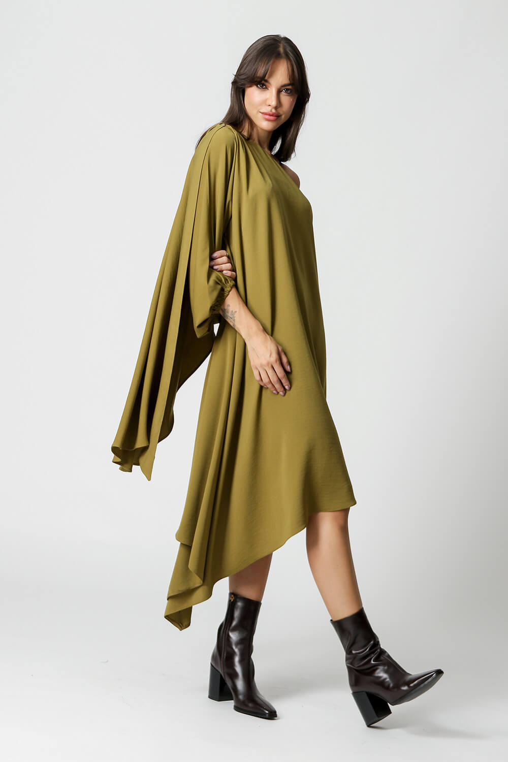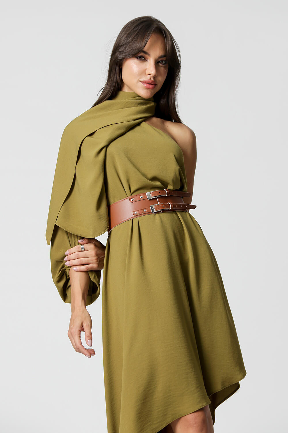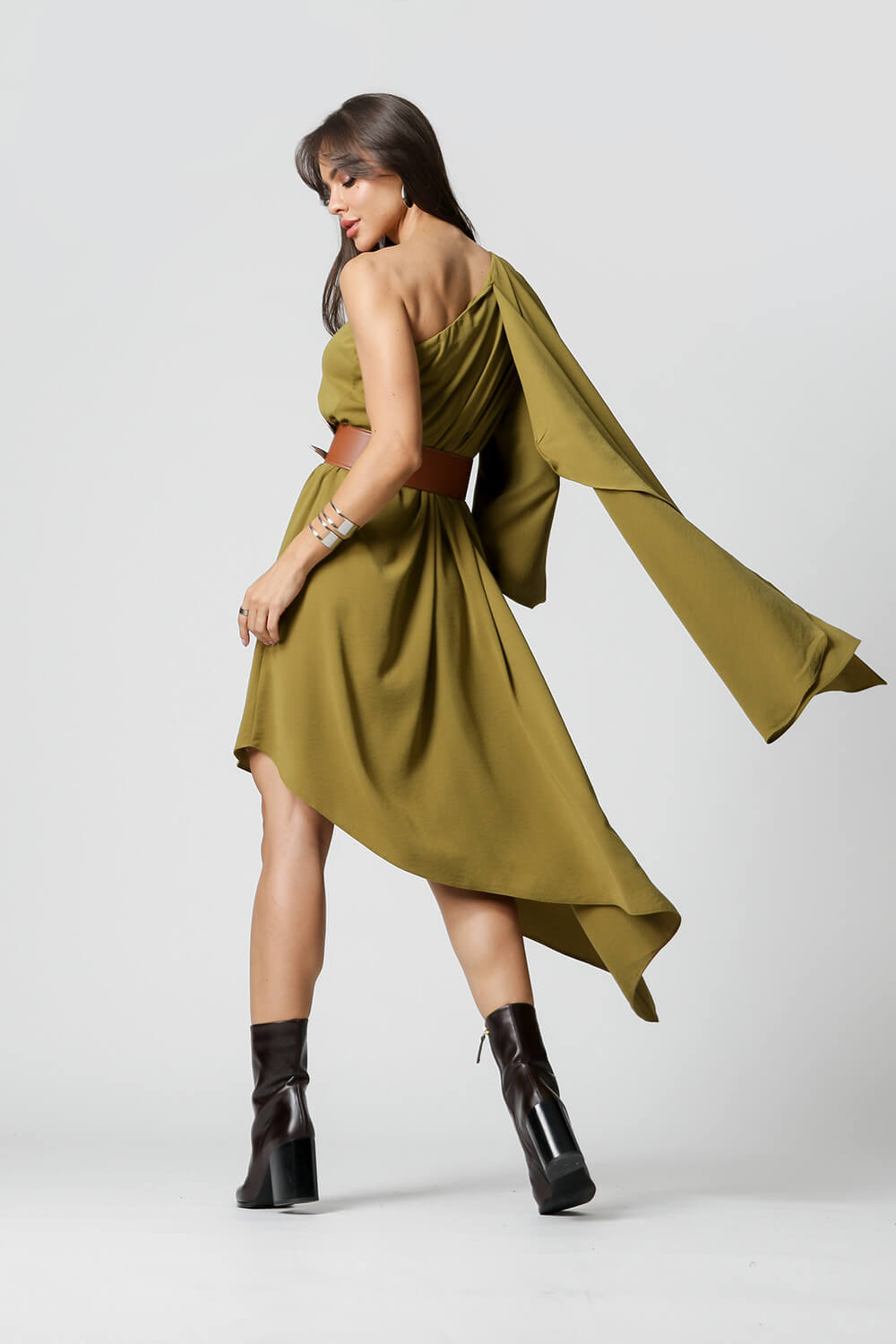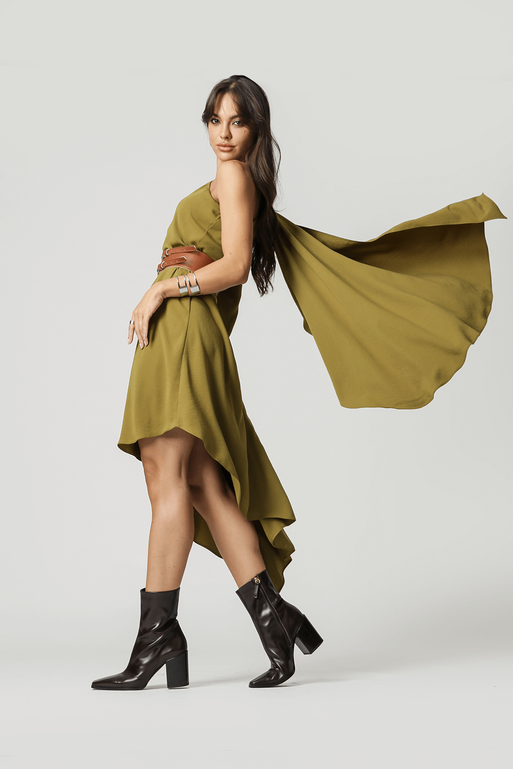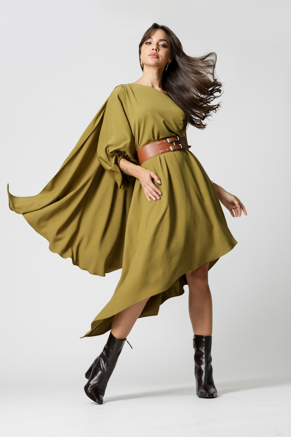 Vestido asimétrico con detalle de capa, mangas ligeramente abullonadas y cinturón con hebillas metálicas como complemento. Modelo realizado en tejido crepe de textura ligera. Es una pieza muy elegante, moderna y es perfecta para momentos casuales, apuesta por esta pieza.