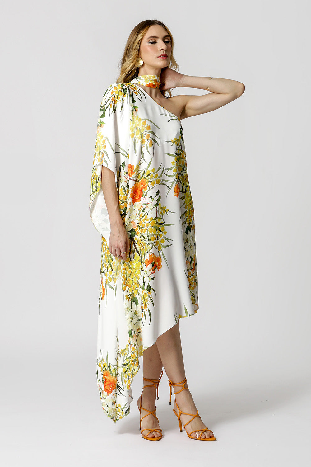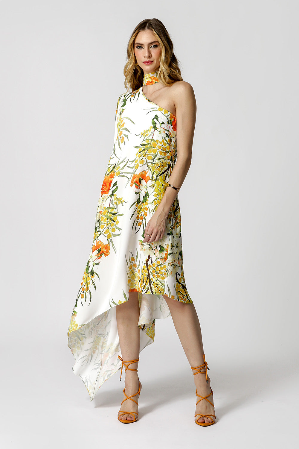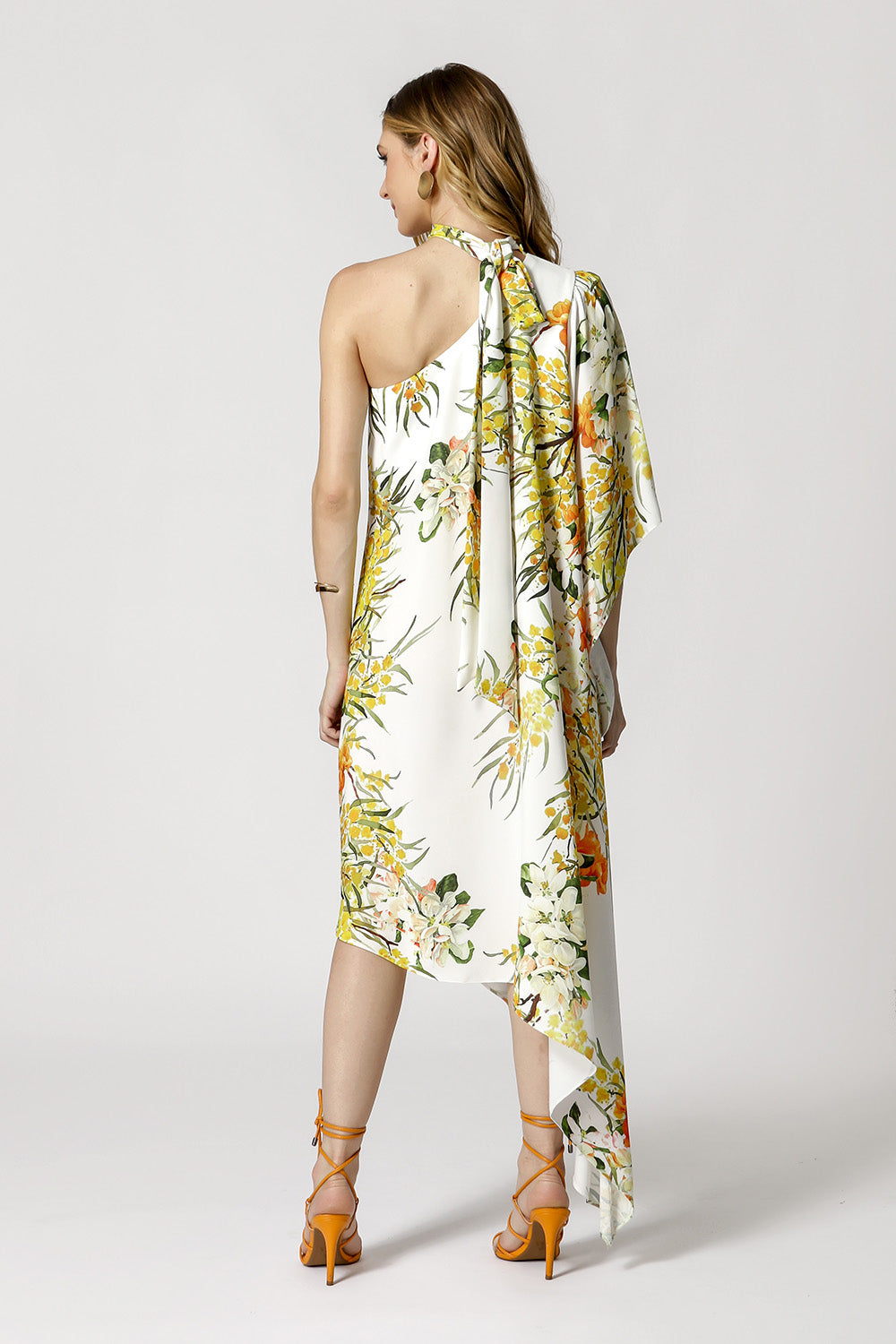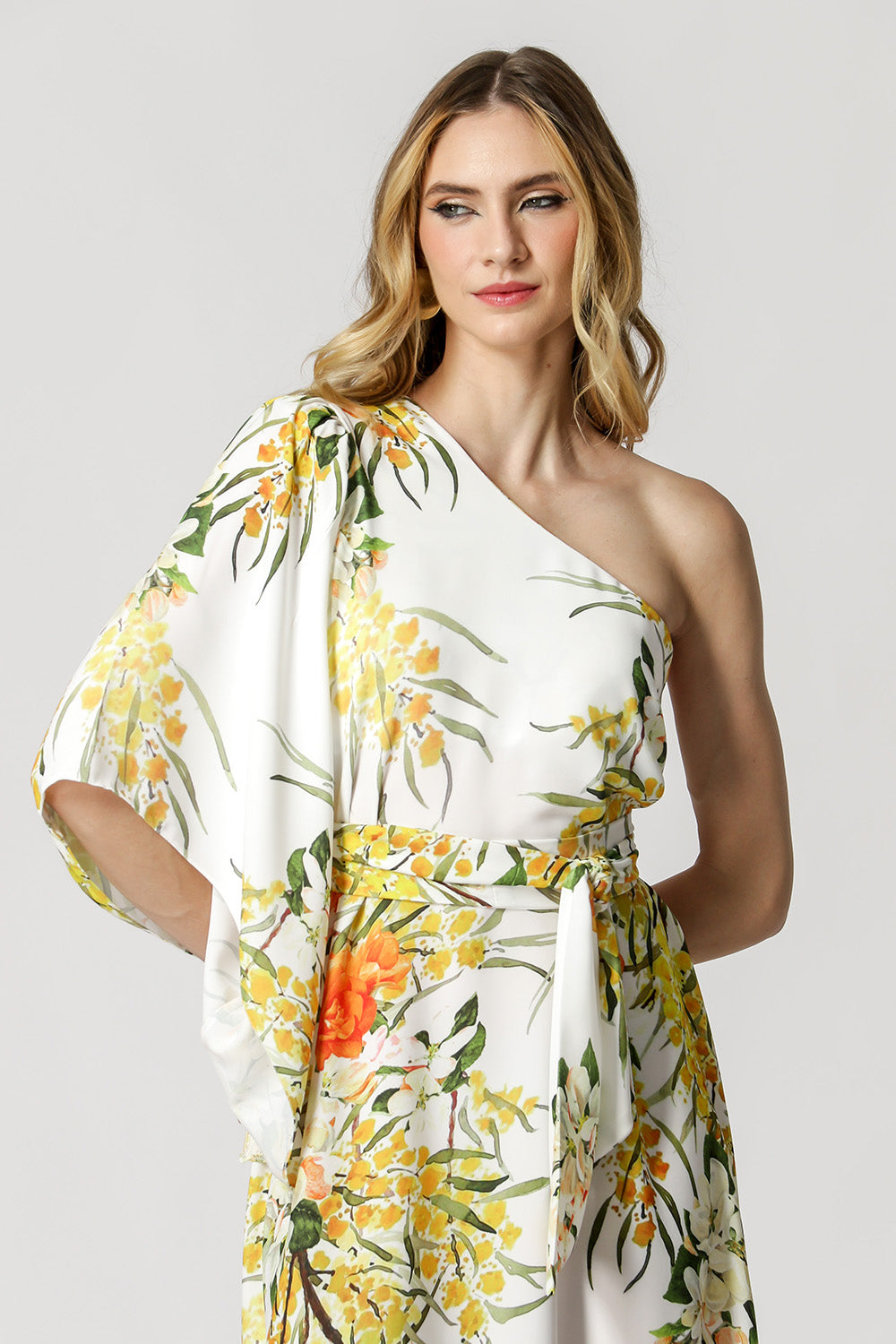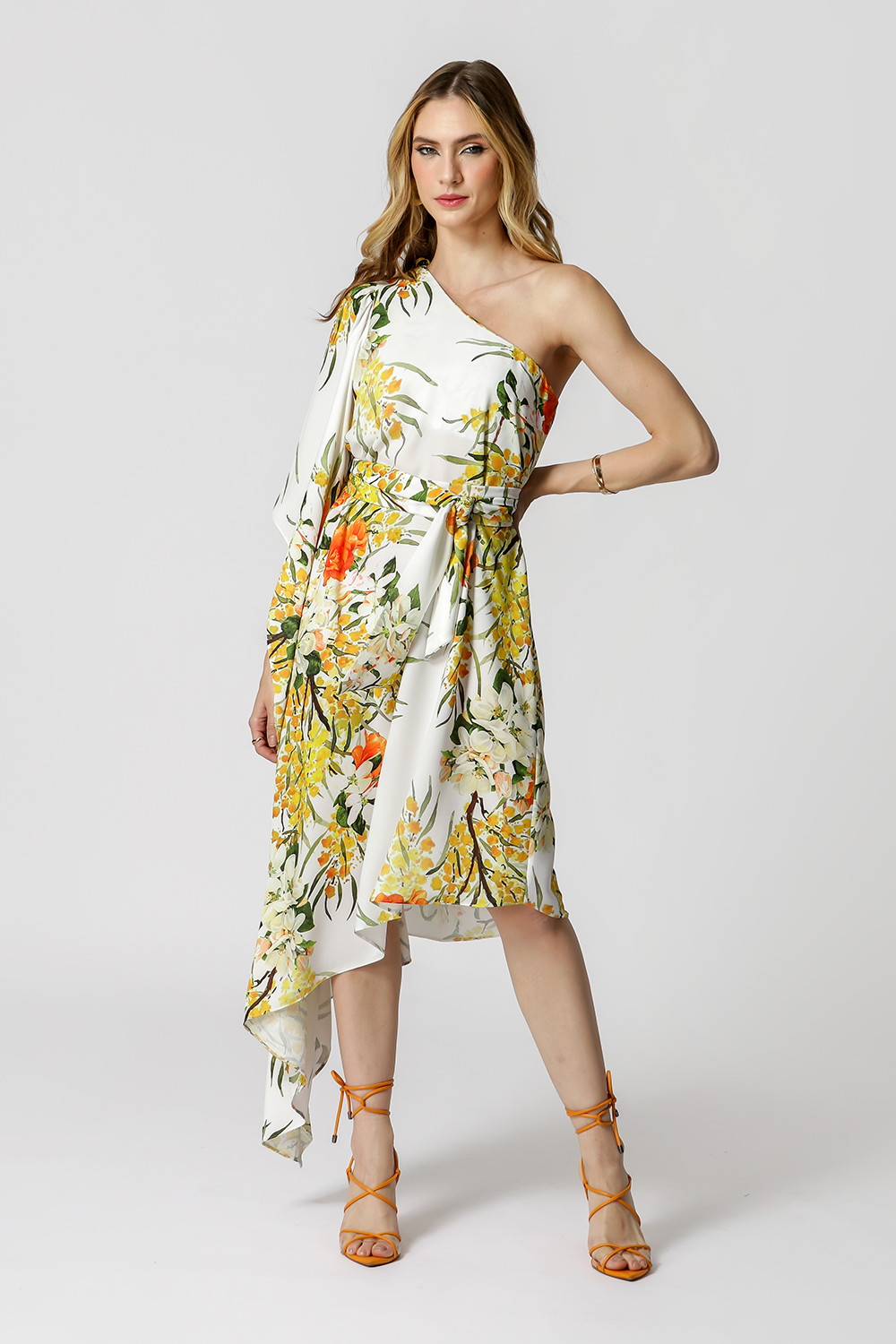 Vestido asimétrico con fajín del mismo tejido. Pieza confeccionada en tejido crepe fluido estampado. Un modelo elegante y sofisticado que realzará tu look de noche.