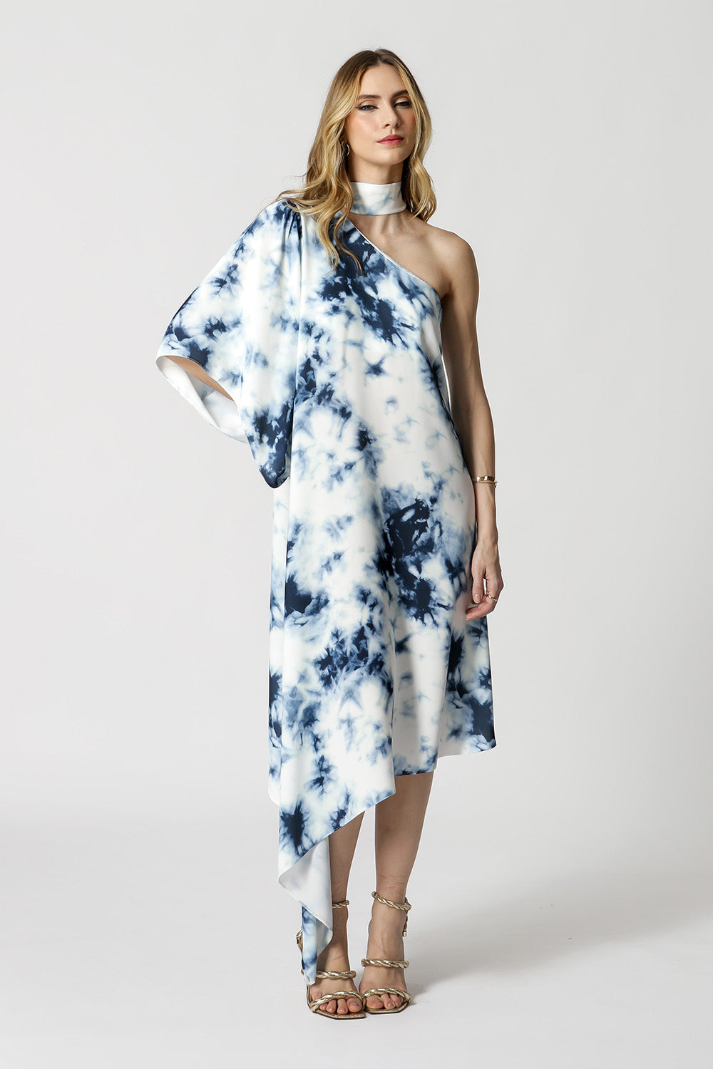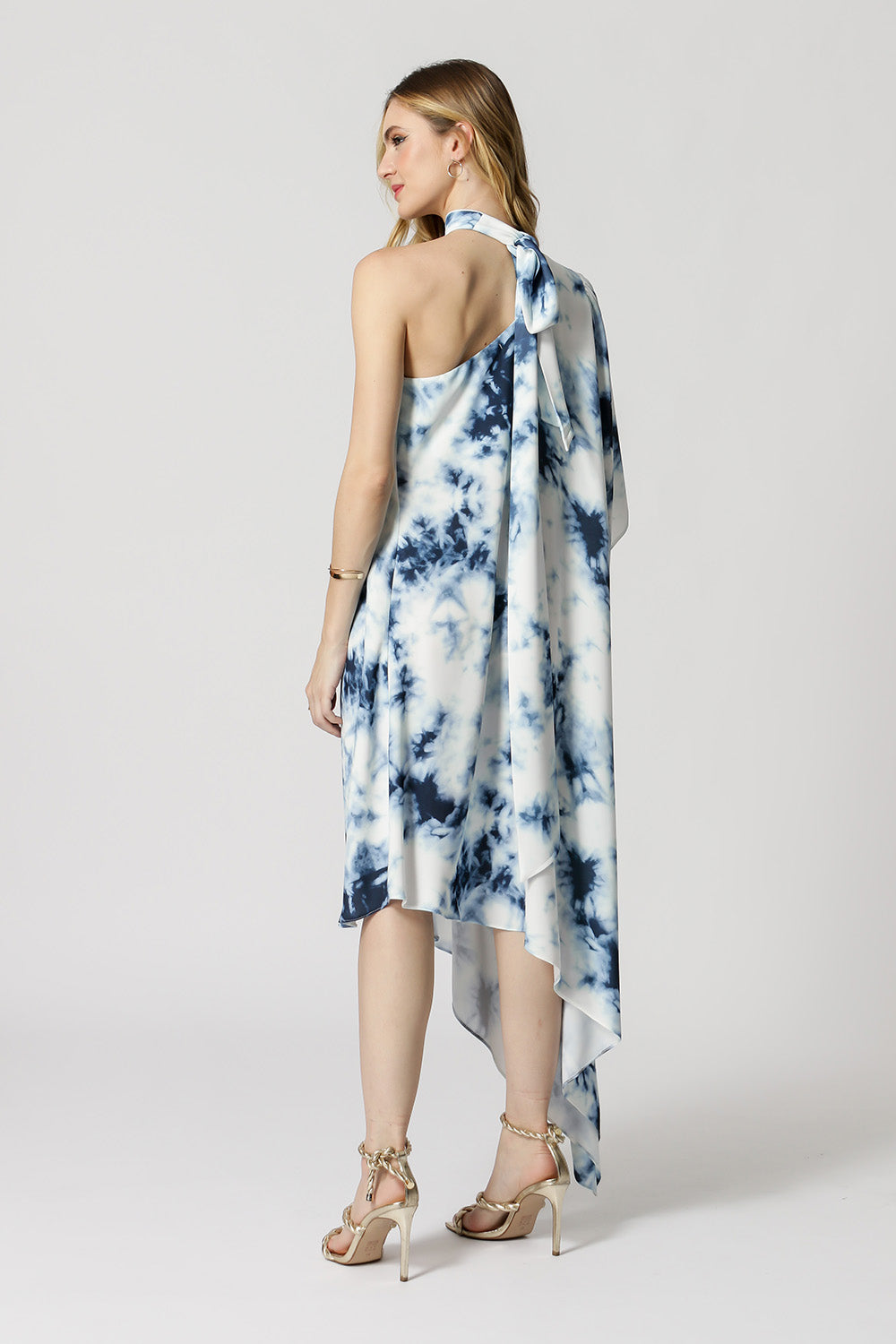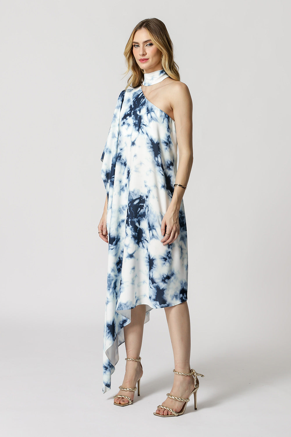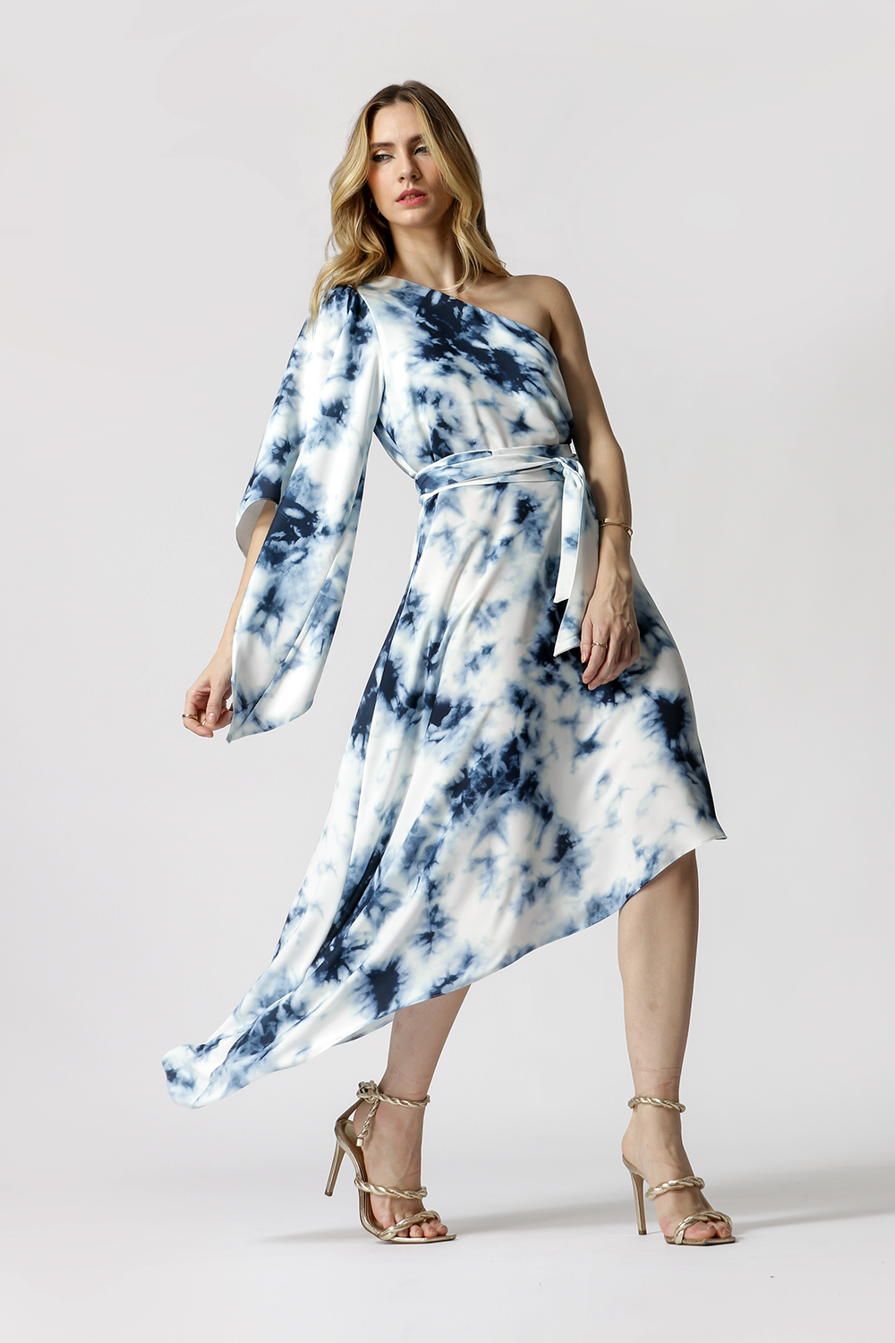 Vestido asimétrico con fajín del mismo tejido. Pieza confeccionada en tejido crepe fluido estampado. Un modelo elegante y sofisticado que realzará tu look de noche.