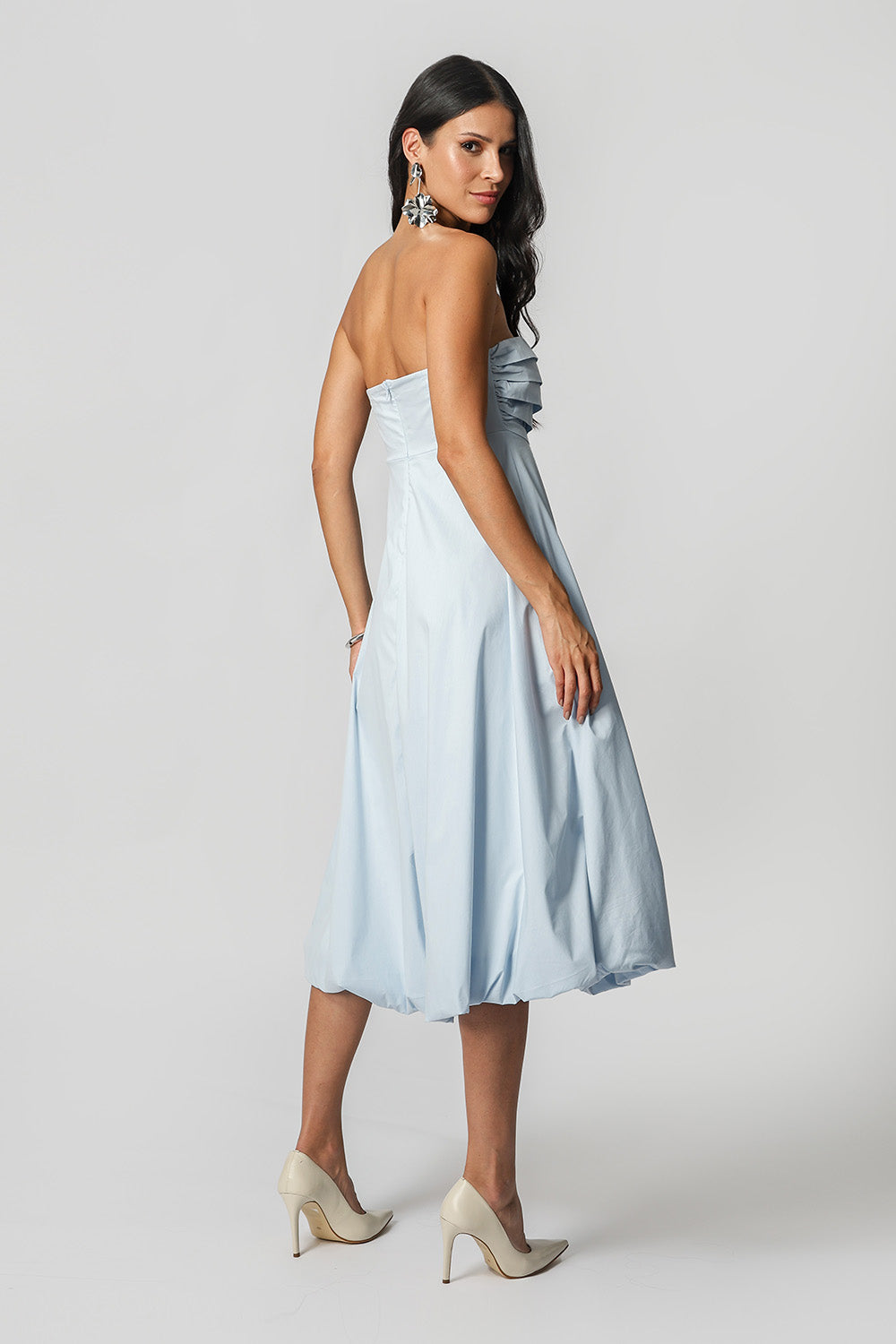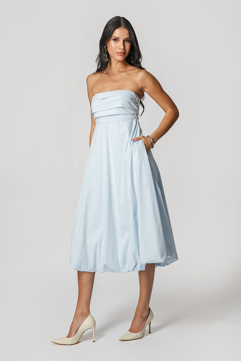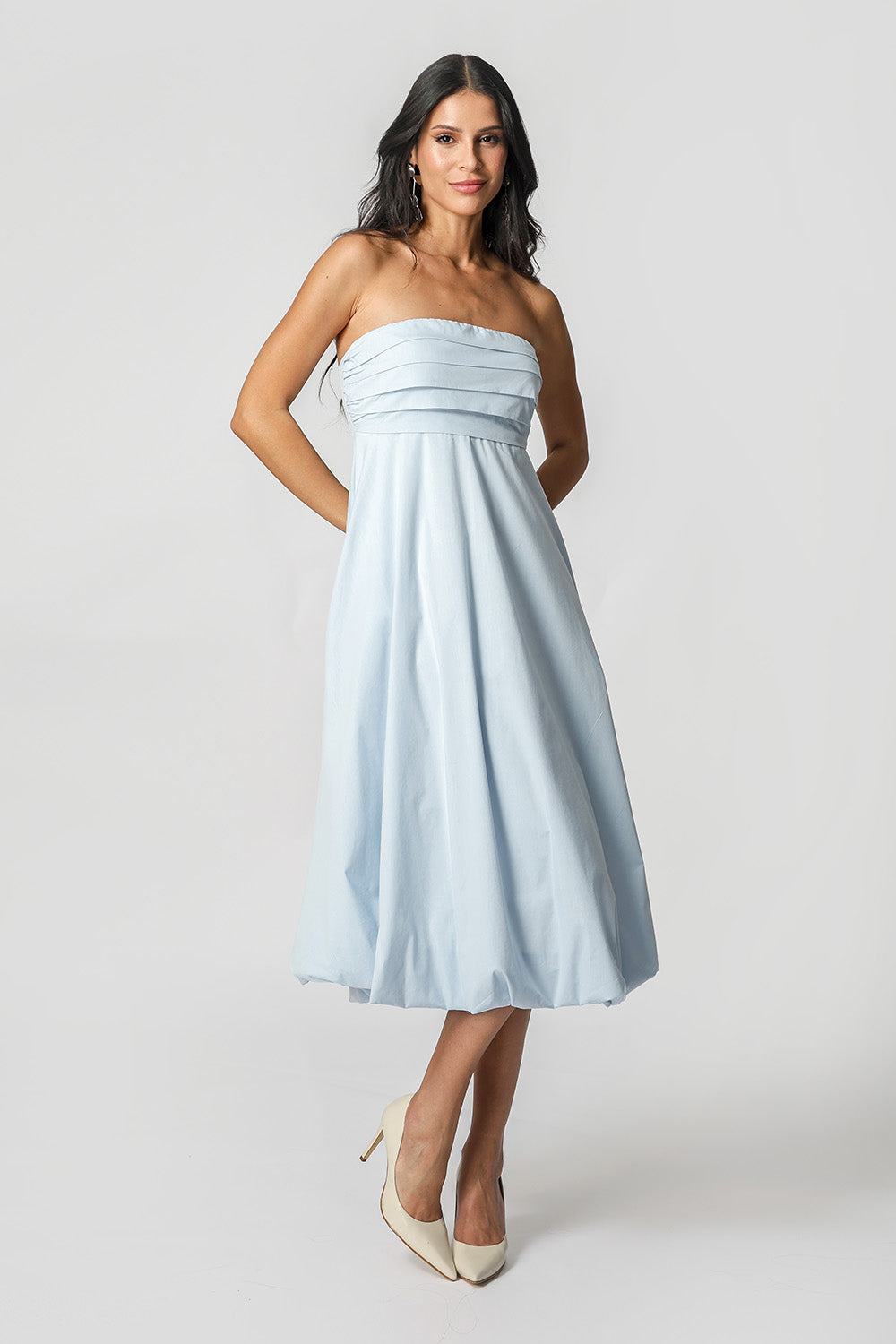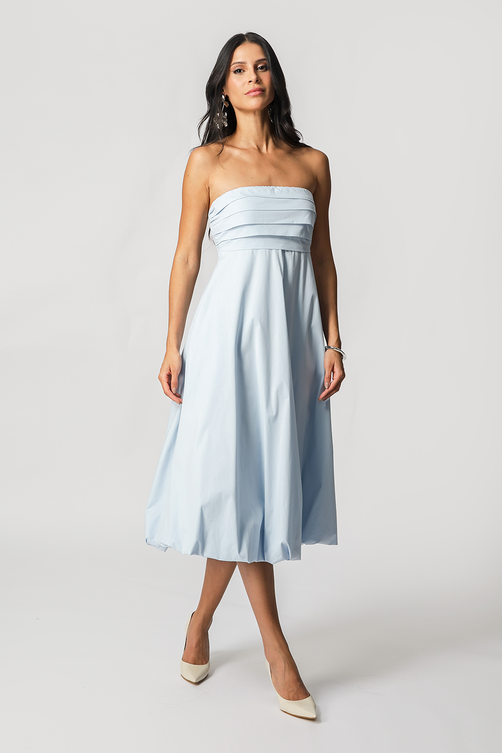 Vestido balonê com pregas no busto, look prático e elegante para ocasiões casuais.