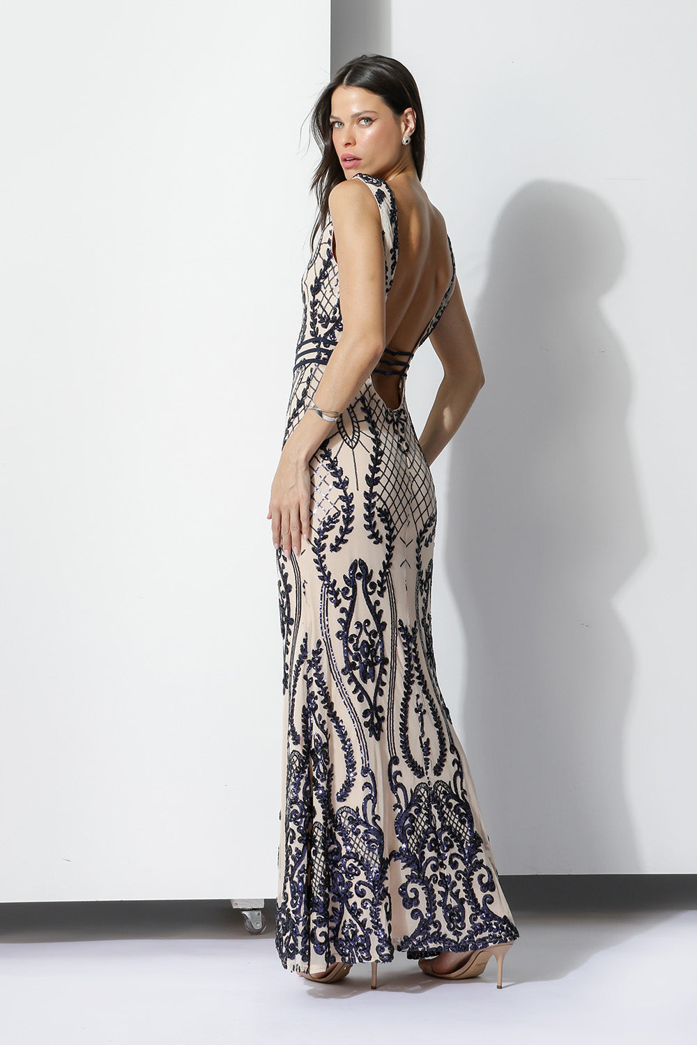 Vestido largo para ocasiones especiales, con escote en pico, copas incorporadas, todo bordado con lentejuelas.