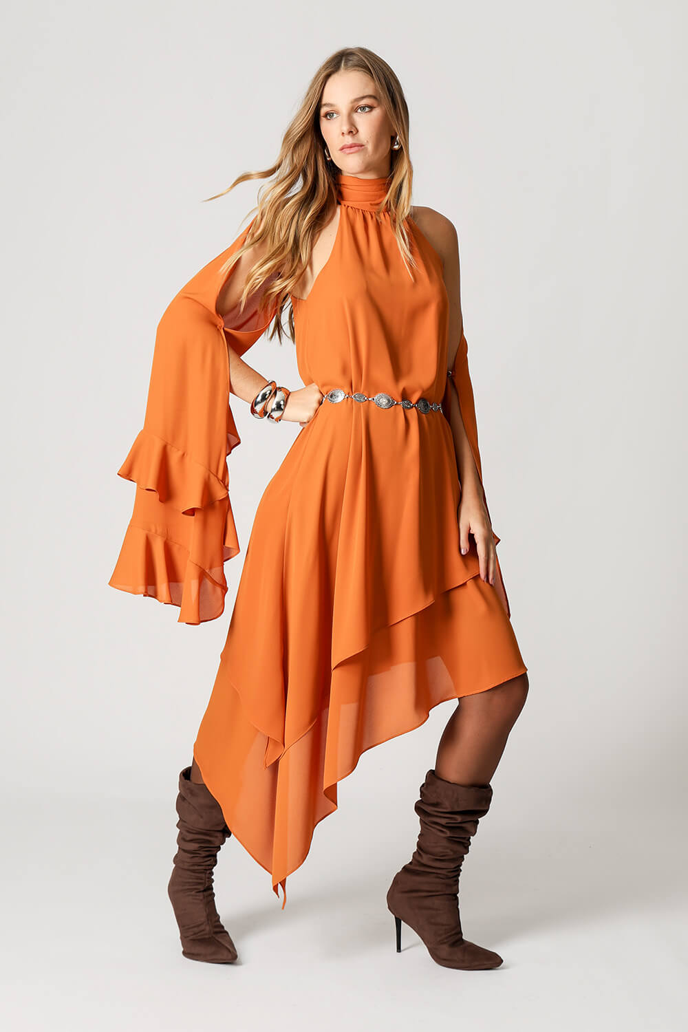 Con un diseño ligero y sofisticado, este vestido destaca por sus dos capas con bajos asimétricos y mangas largas con volantes en los puños. Un modelo fluido y elegante, perfecto para ocasiones especiales.
