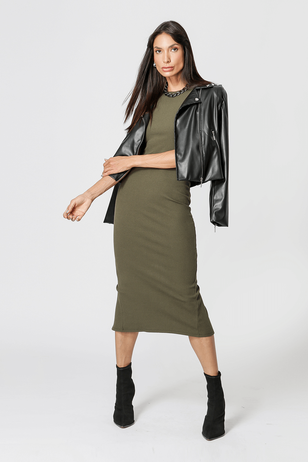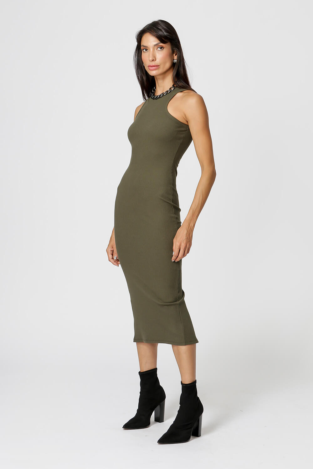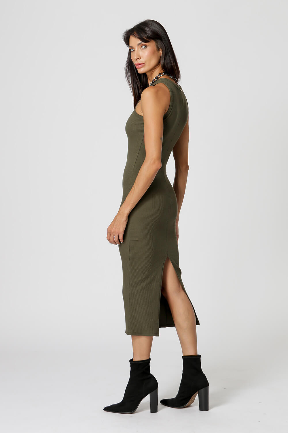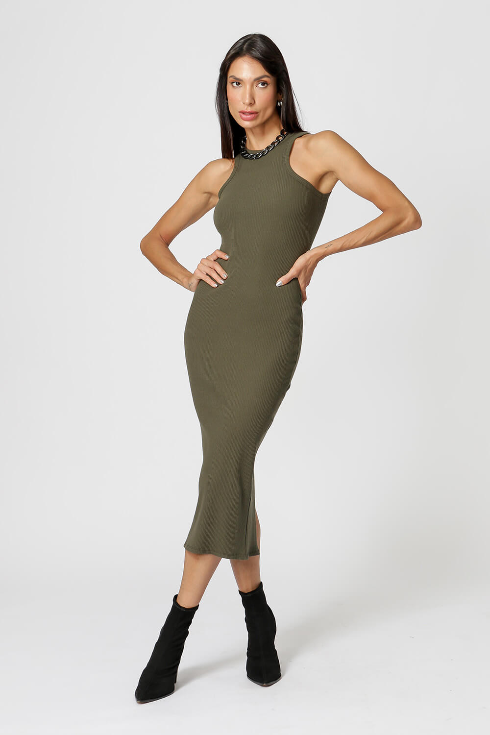 Vestido con sisa americana confeccionado en punto canalé grueso, una encantadora abertura en la espalda y largo midi es una pieza atemporal y versátil para un look casual.