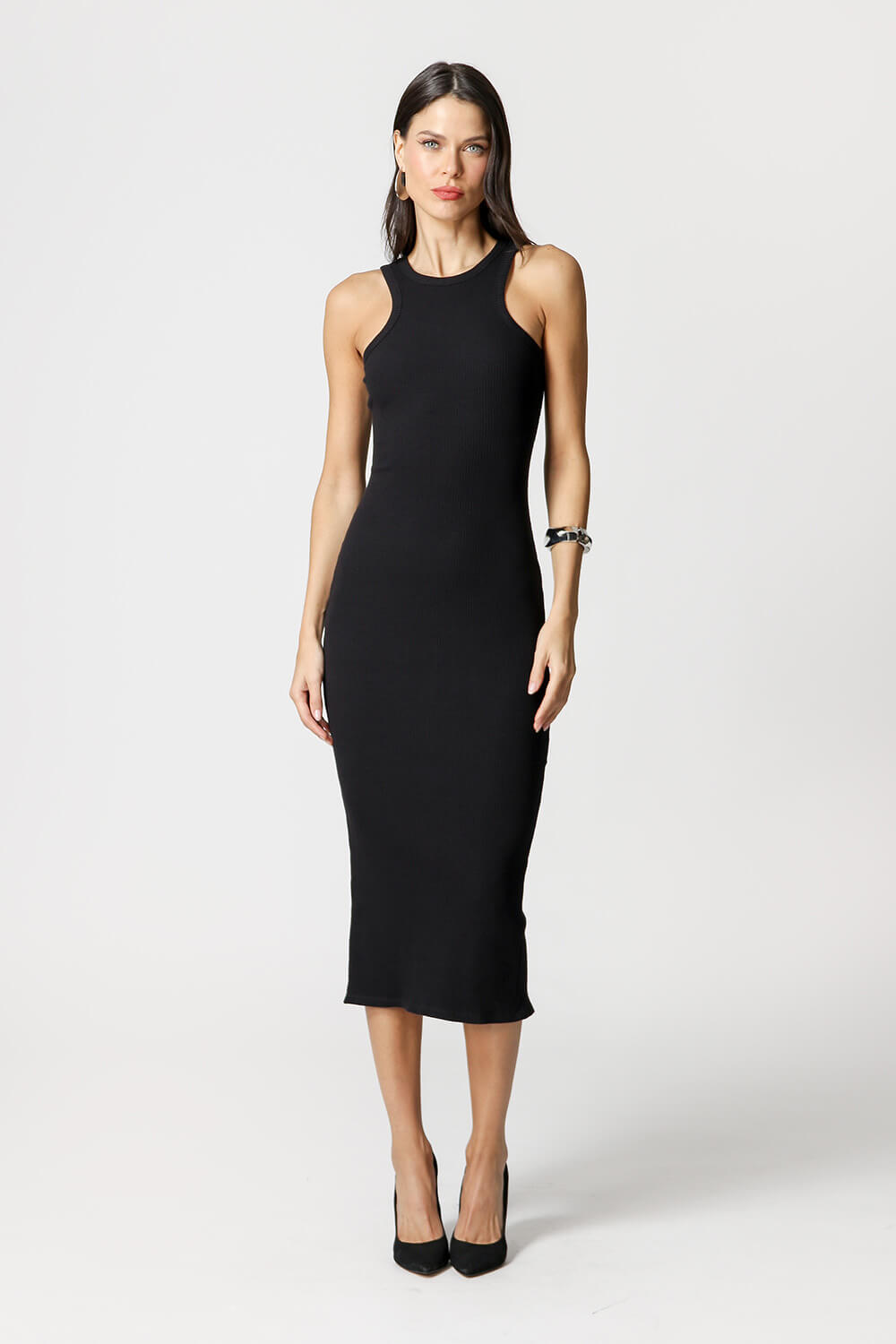 Vestido con sisa americana confeccionado en punto canalé grueso, una encantadora abertura en la espalda y largo midi es una pieza atemporal y versátil para un look casual.